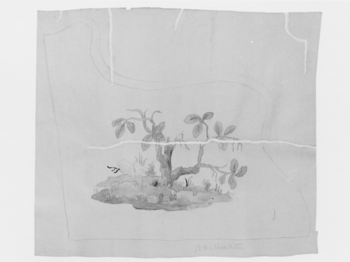 MÖNSTERFÖRLAGA, till möbelklädsel. Till karmstol inv. nr Gr. VI:II:A.a.27. (För beskrivning se Hallwylska samlingen, Gr. VI, text.) Utförd med blyerts och akvarell på brunt (omslagspapper). Mått: H 57,7 cm B 66,2 cm. Påskrift framsidan "12 cm lösa..." Gåva 1943 från arkitekt Gustaf Clason (se protokoll 54º4). Mönstret har komponerats av textilkonstnärinnan Maja Sjöström, verksam vid HV och hos arkitekten Ragnar Östberg. Kartongerna ställdes ut på HV höstutställning 1898. Enl. protokoll i Nordiska Museets arkiv