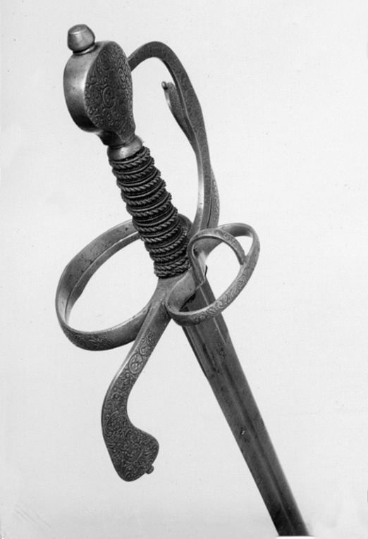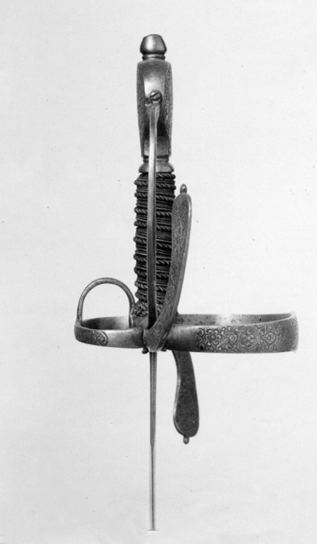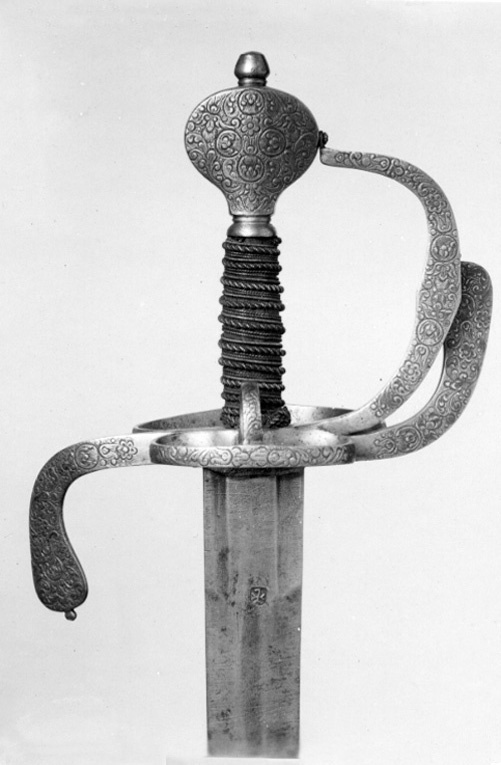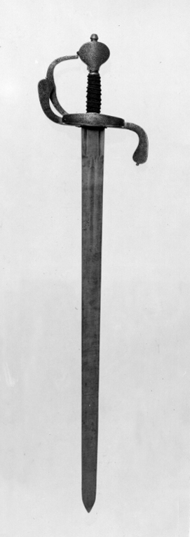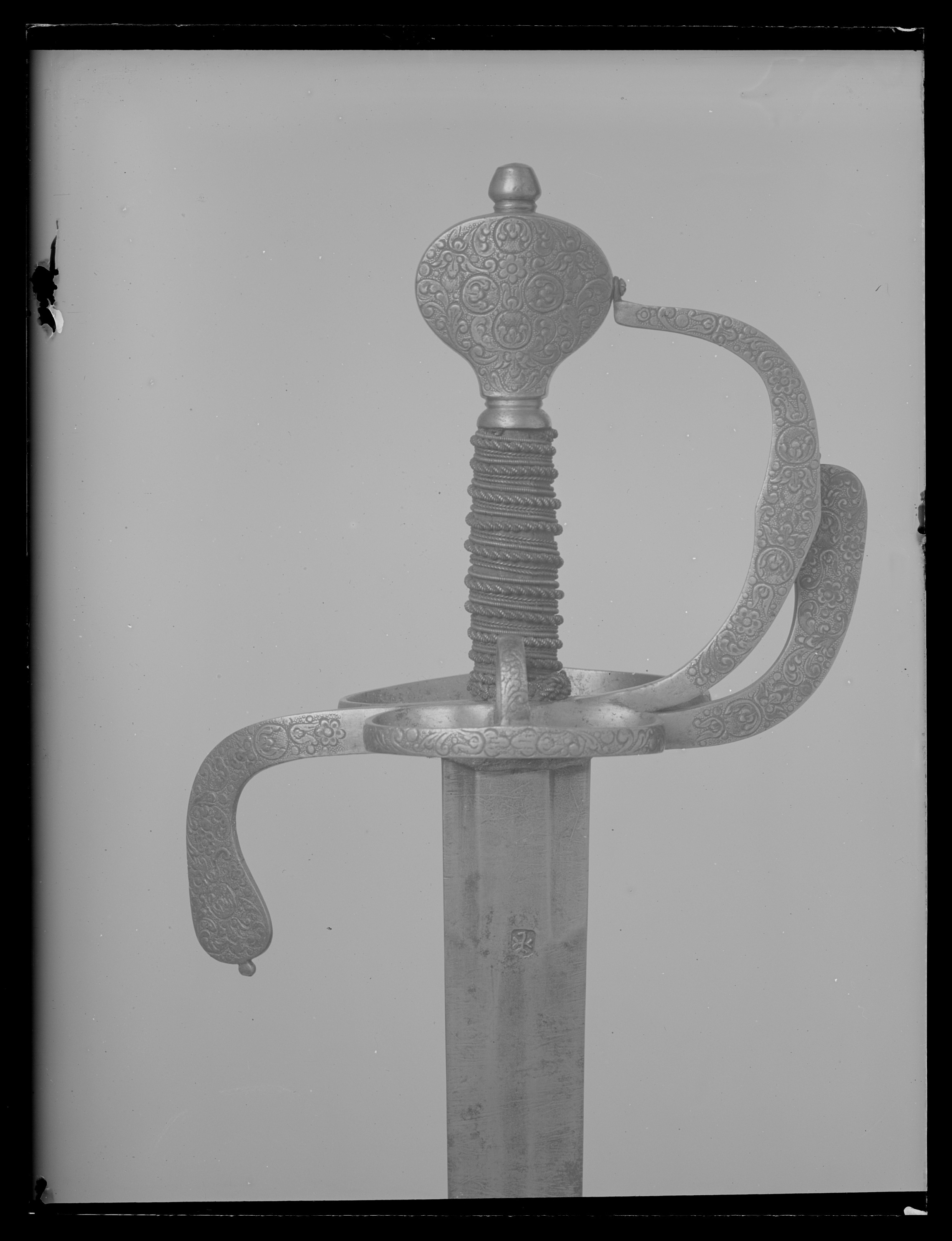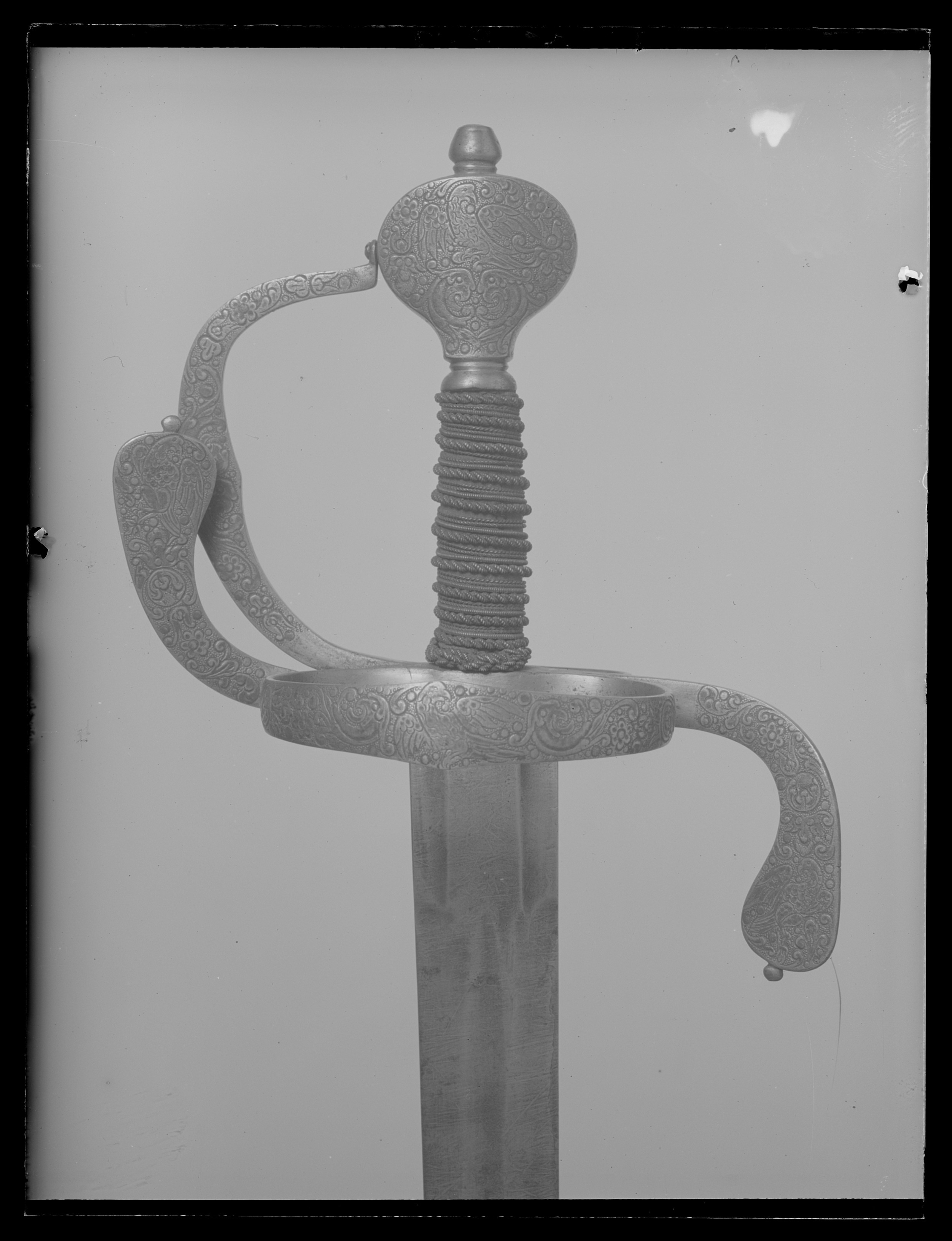 Fäste av stål med ornering av yttäckande, punsat och ciselerat mönster av bladrankor och blommor, delvis med påslagen försilvring. Knapp platt, omvänt päronformig, nitknapp stympat konisk, slät. Handbygel, parerstänger och kryssbyglar platta, nästan tunna. Handbygeln bågformig, överdelen fäst vid knappen medelst en liten skruv genom påtagligt underdimensionerad uppvikt fot. Parerstängerna stora, S-formigt svängda, den främre uppåt-utåt, den bakre nedåt-utåt, ytterändarna breddade och avslutade med en liten droppformig skiva. Yttre kryssbygeln oval och stor, utmed insidan ett insänkt grunt spår. Inre kryssbygeln av platt oval form, tämligen liten, dess mitt förbunden med krysset med en tumbygel. Kaveln lindad med omväxlande grövre och tunnare mörkanlöpt ståltråd. Klinga med tvärgående damaskering, rak, bred, tvåeggad, baspartiet med c. 50 mm lång ricasso. Ovanför ricassons mitt en grund c. 180 mm lång hålkäl. På utsidan c. 170 mm från basen ett otydligt punsat märke, möjligen föreställande ett ulvmärke (Passau, här ej som tillverkningsort, endast som föregiven kvalitetsbeteckning). På insidan vid ricassons ändparti en inslagen stämpel, liknande ett bomärke. Bestämningen av fästet såsom eftergjort grundar sig på följande: Hos likartade autentiska fästen, som kunnat påvisas under tiden c. 1630-1650 i Tyskland och Nordeuropa är godset ej så överdrivet tunt; handbygelns överdel är intappad i knappen (ej fäst med skruv); själva formgivningen mindre överdriven; kavellindningen inkonsekvent, saknar övre krans, lindningen går upp till knappens hals utan spår efter krans. Det imiterade fästet torde ha monterats med den äldre klingan under tiden c. 1840-1850.