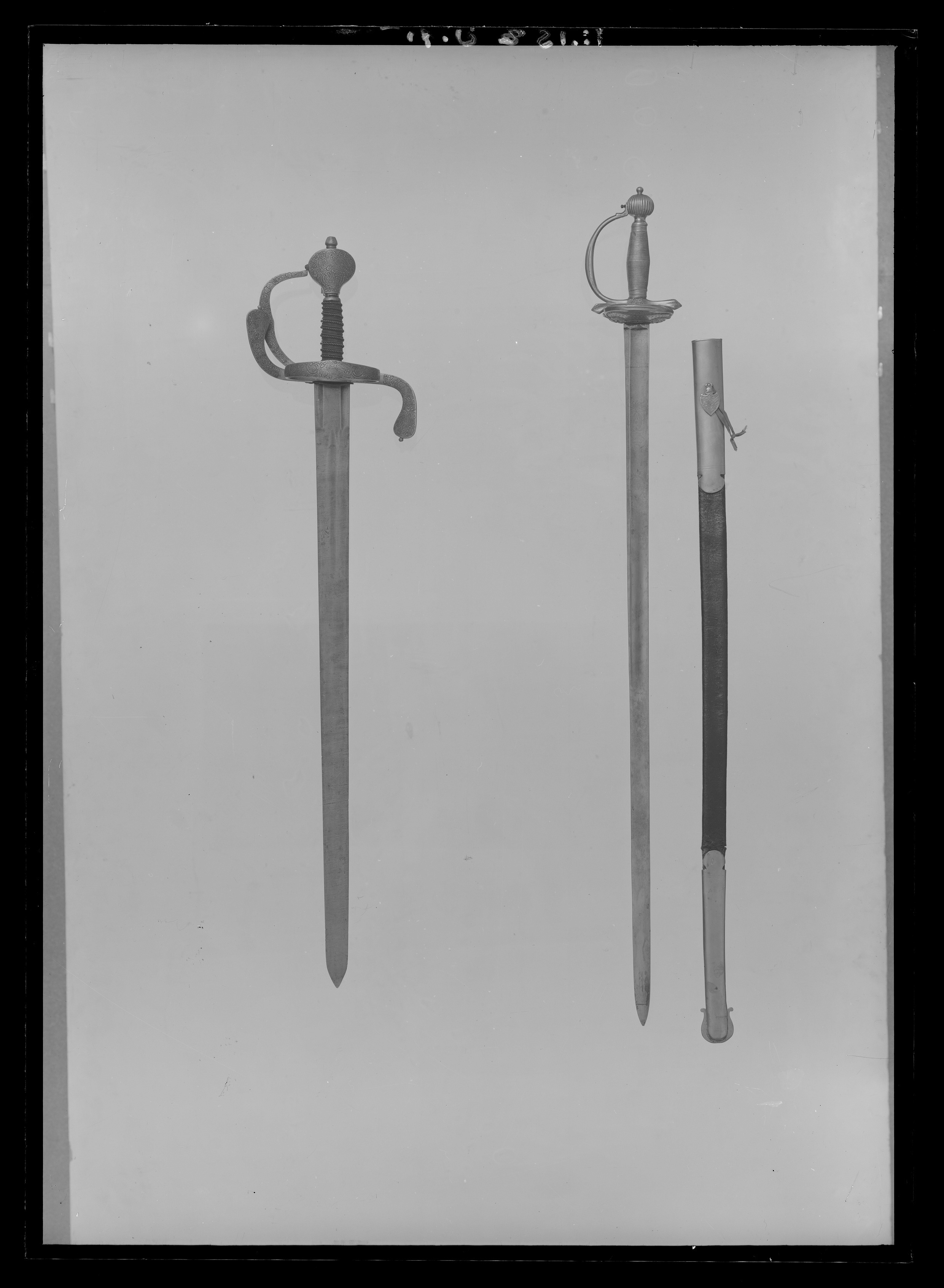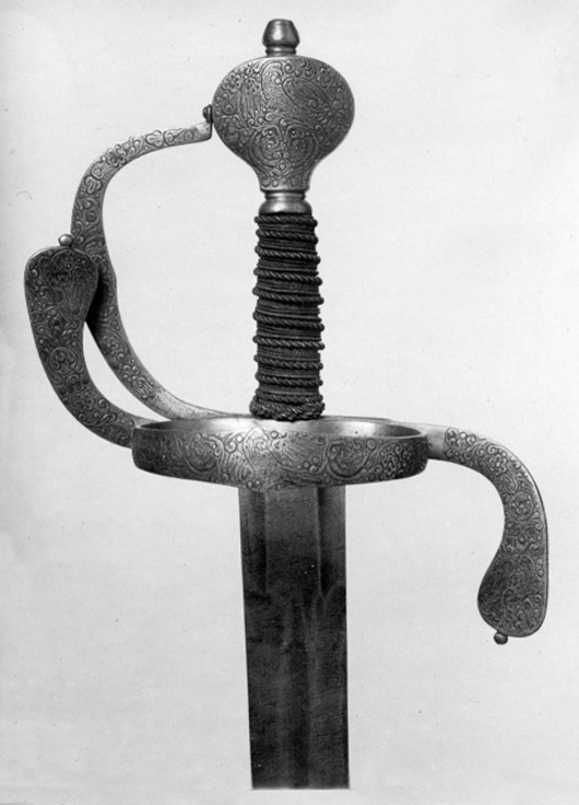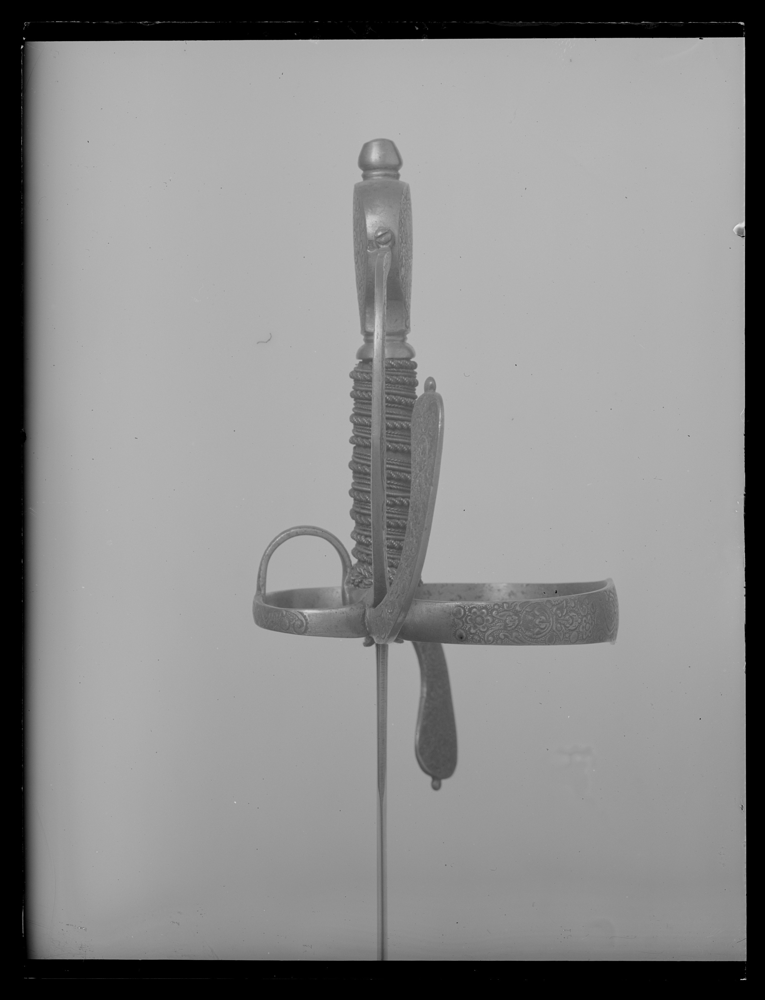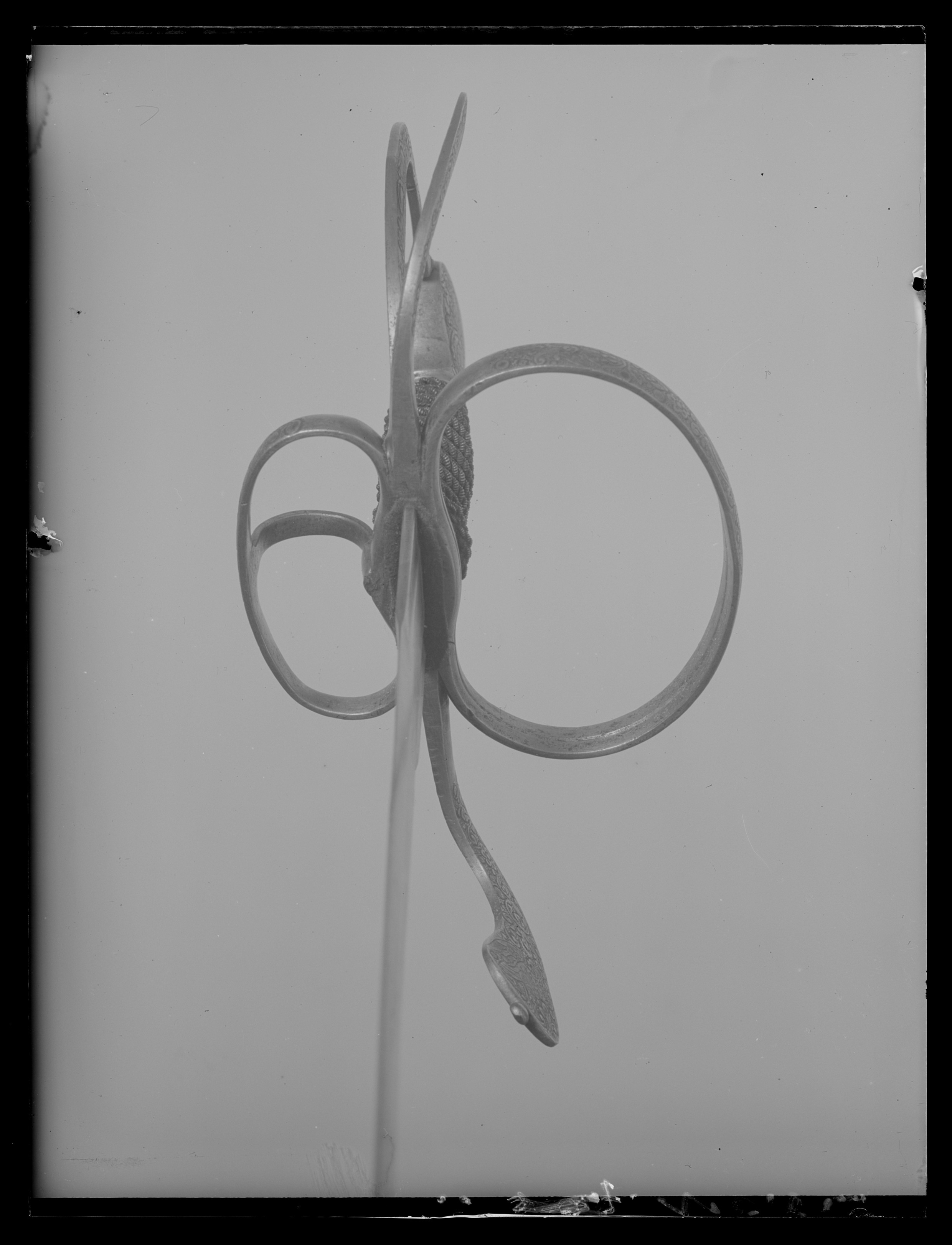 Fäste av stål med ornering av yttäckande, punsat och ciselerat mönster av bladrankor och blommor, delvis med påslagen försilvring. Knapp platt, omvänt päronformig, nitknapp stympat konisk, slät. Handbygel, parerstänger och kryssbyglar platta, nästan tunna. Handbygeln bågformig, överdelen fäst vid knappen medelst en liten skruv genom påtagligt underdimensionerad uppvikt fot. Parerstängerna stora, S-formigt svängda, den främre uppåt-utåt, den bakre nedåt-utåt, ytterändarna breddade och avslutade med en liten droppformig skiva. Yttre kryssbygeln oval och stor, utmed insidan ett insänkt grunt spår. Inre kryssbygeln av platt oval form, tämligen liten, dess mitt förbunden med krysset med en tumbygel. Kaveln lindad med omväxlande grövre och tunnare mörkanlöpt ståltråd. Klinga med tvärgående damaskering, rak, bred, tvåeggad, baspartiet med c. 50 mm lång ricasso. Ovanför ricassons mitt en grund c. 180 mm lång hålkäl. På utsidan c. 170 mm från basen ett otydligt punsat märke, möjligen föreställande ett ulvmärke (Passau, här ej som tillverkningsort, endast som föregiven kvalitetsbeteckning). På insidan vid ricassons ändparti en inslagen stämpel, liknande ett bomärke. Bestämningen av fästet såsom eftergjort grundar sig på följande: Hos likartade autentiska fästen, som kunnat påvisas under tiden c. 1630-1650 i Tyskland och Nordeuropa är godset ej så överdrivet tunt; handbygelns överdel är intappad i knappen (ej fäst med skruv); själva formgivningen mindre överdriven; kavellindningen inkonsekvent, saknar övre krans, lindningen går upp till knappens hals utan spår efter krans. Det imiterade fästet torde ha monterats med den äldre klingan under tiden c. 1840-1850.