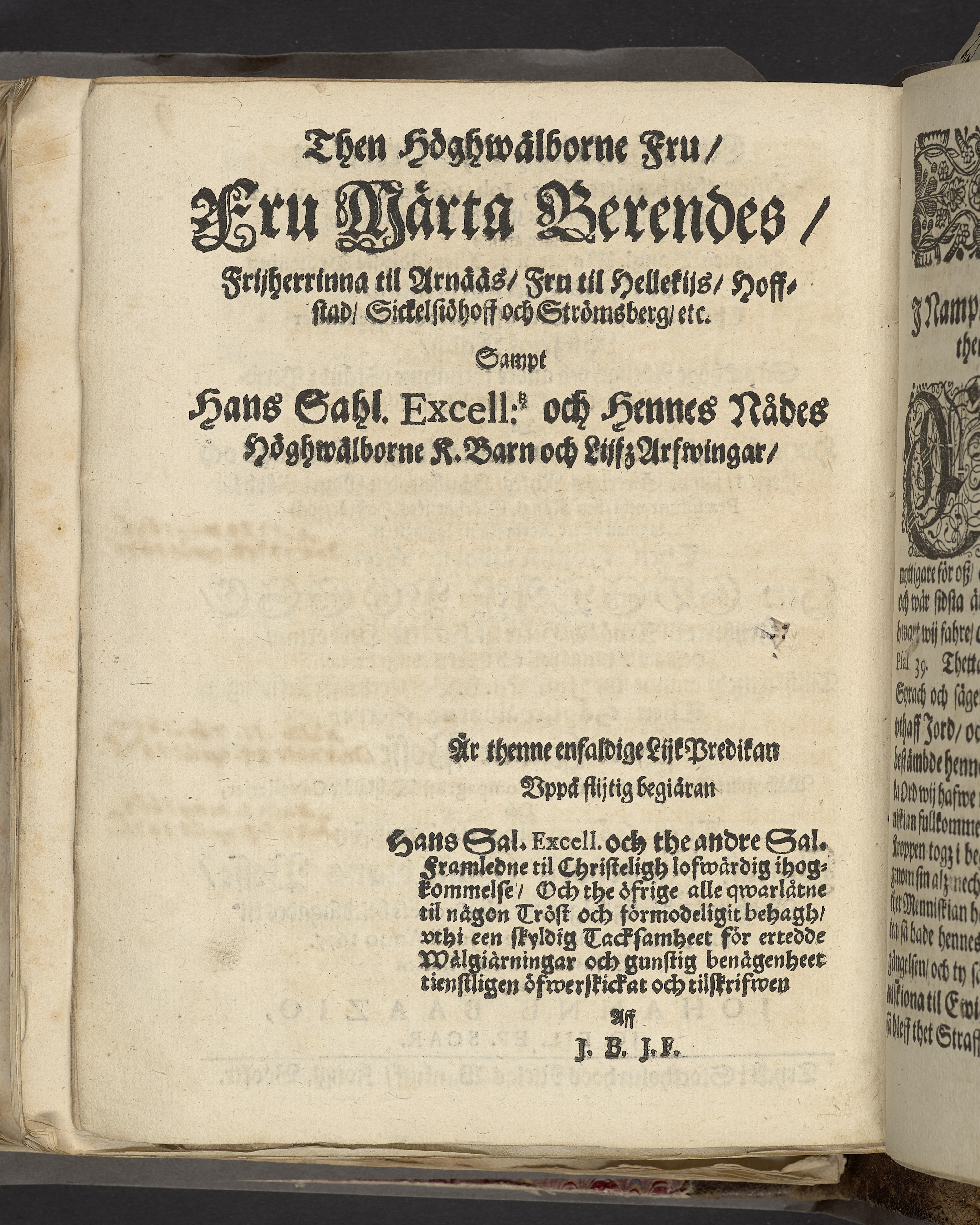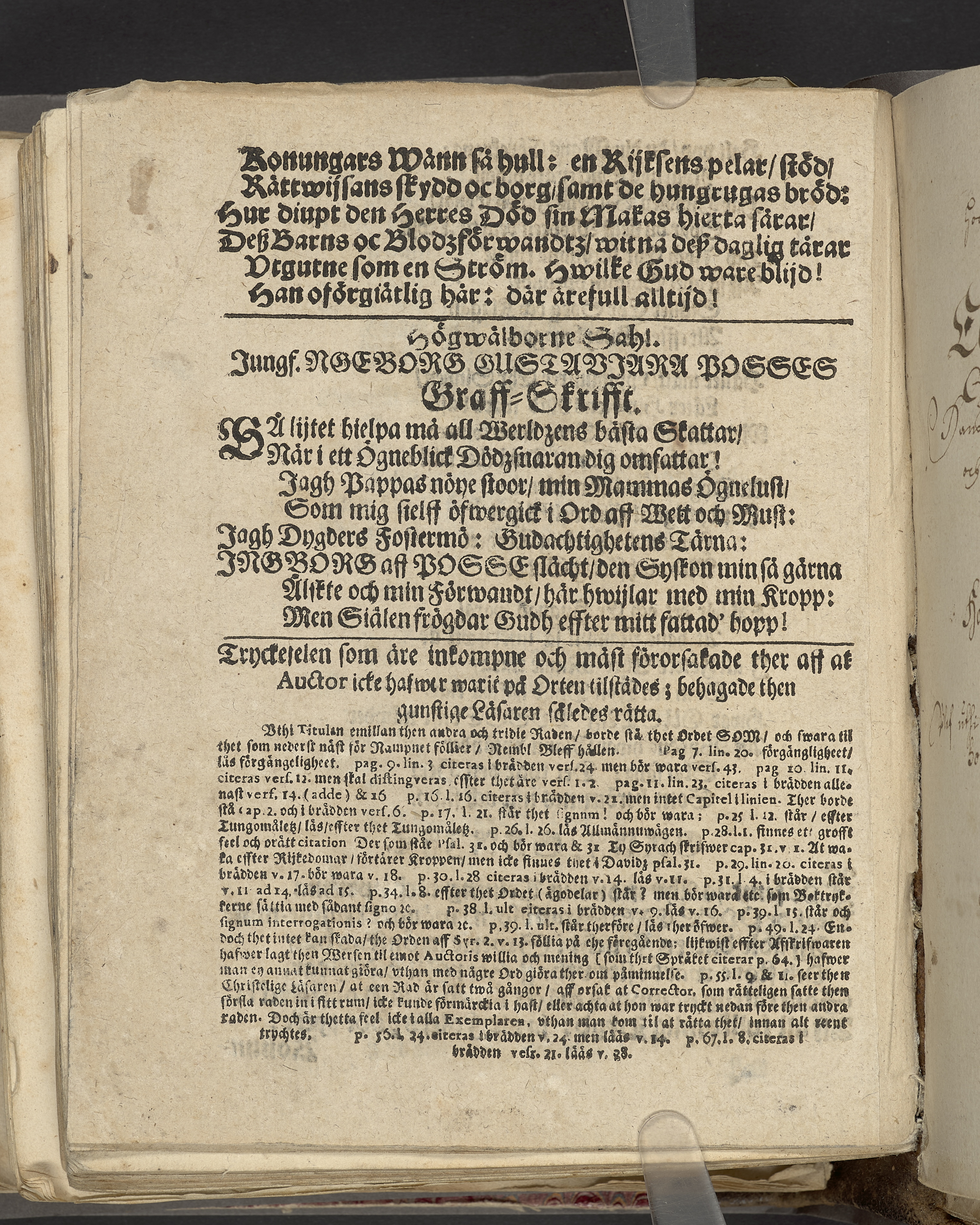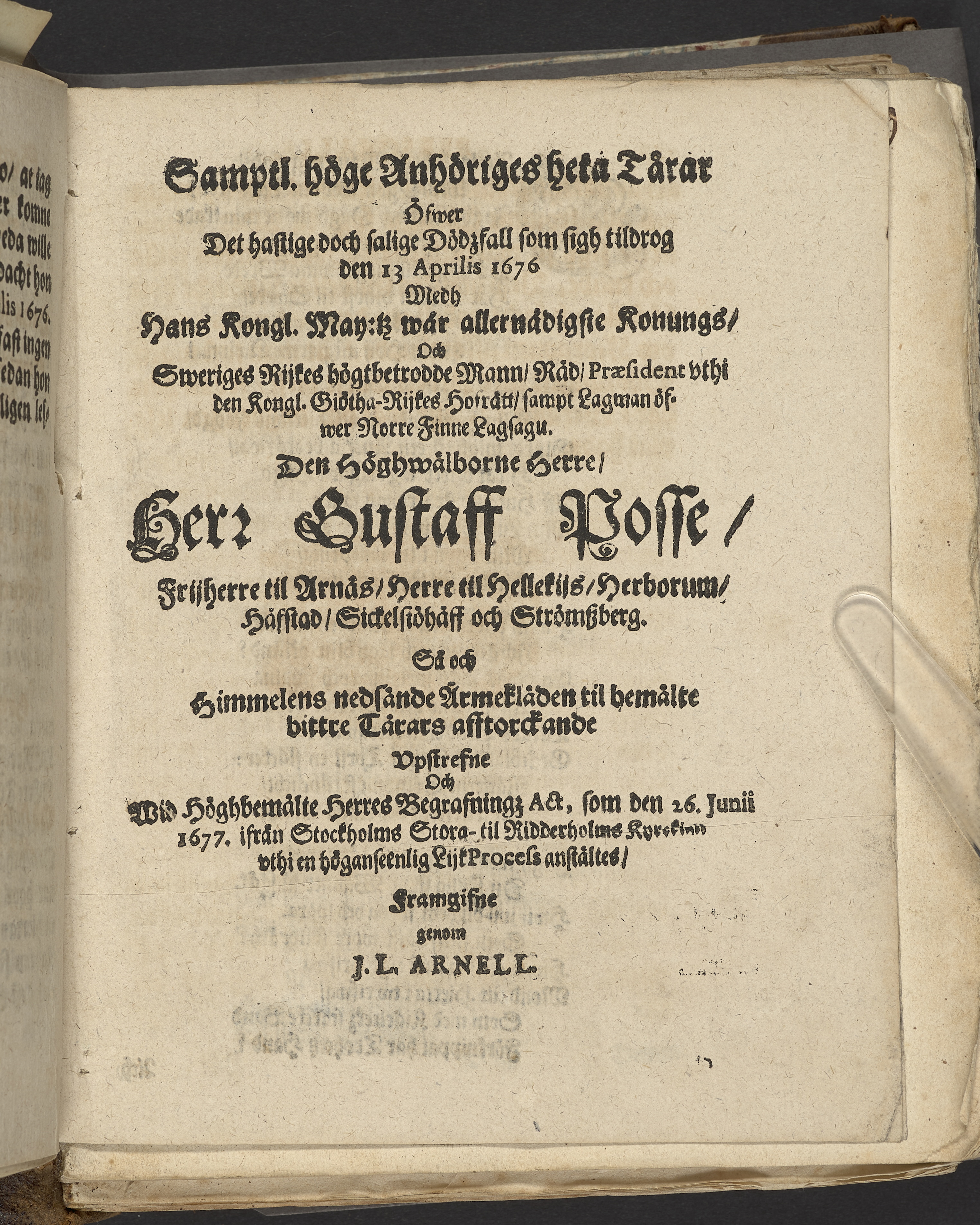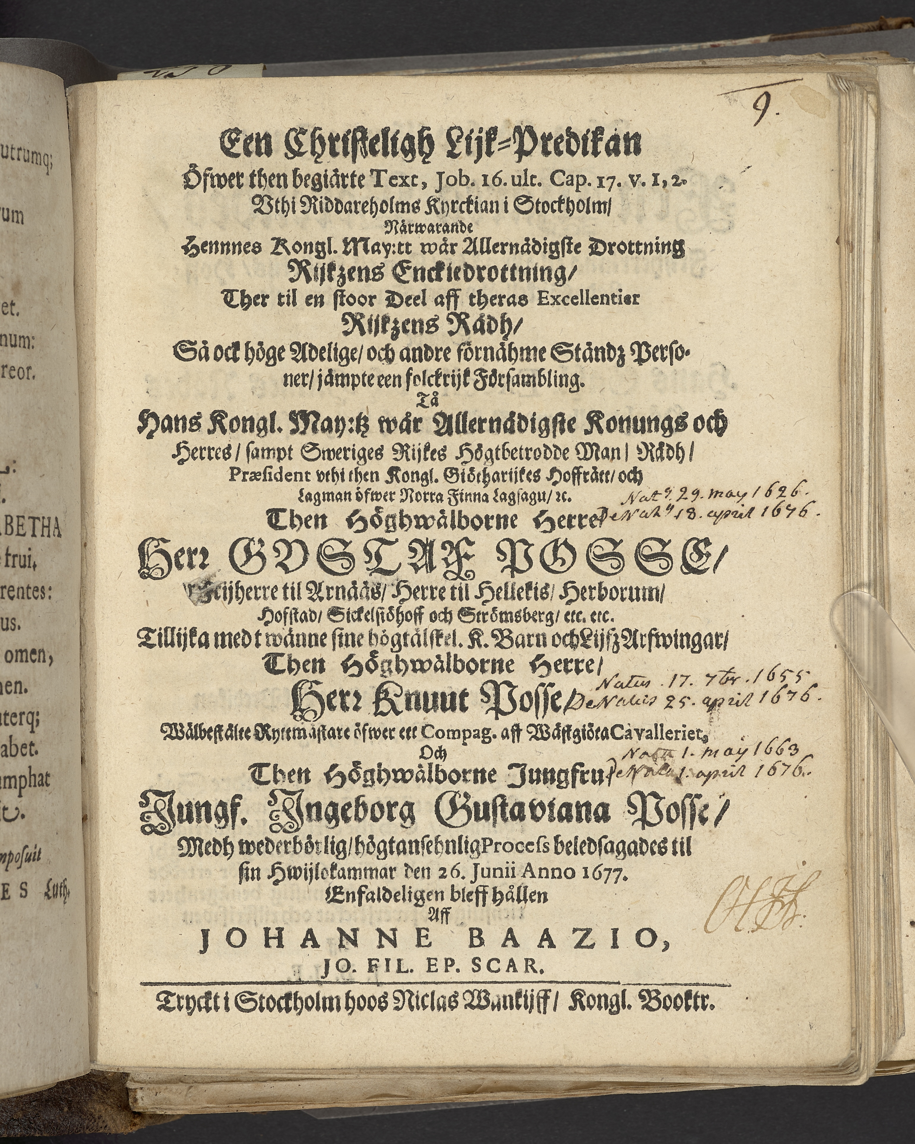 Een christeligh lijk-predikan öfwer then begiärte text, Job. 16. ult. cap.17. V. 1. 2. vthi Riddareholms kyrckian i Stockholm ... tå ... Herr Gvstaf Posse, frijherre til Arnääs, herre till Hellekis, Herborum, Hofstad, Sickelsiöhoff och Strömsberg, etc. etc. Tillijka med twänne sine högtälskel. k. barn och lijfzarfwingar, then höghwälborne herre, Herr Knuut Posse ... och then höghwälborne jungfru, Jungf. Ingeborg Gustaviana Posse, medh wederbörlig, högtansehnlig process beledsagades til sin hwijlokammar den 26. junii anno 1677. Enfaldeligen bleff hållen aff Johanne Baazio, jo. fil. ep. Scar. Tryckt i Stockholm hoos Niclas Wankijff, kongl. booktr.