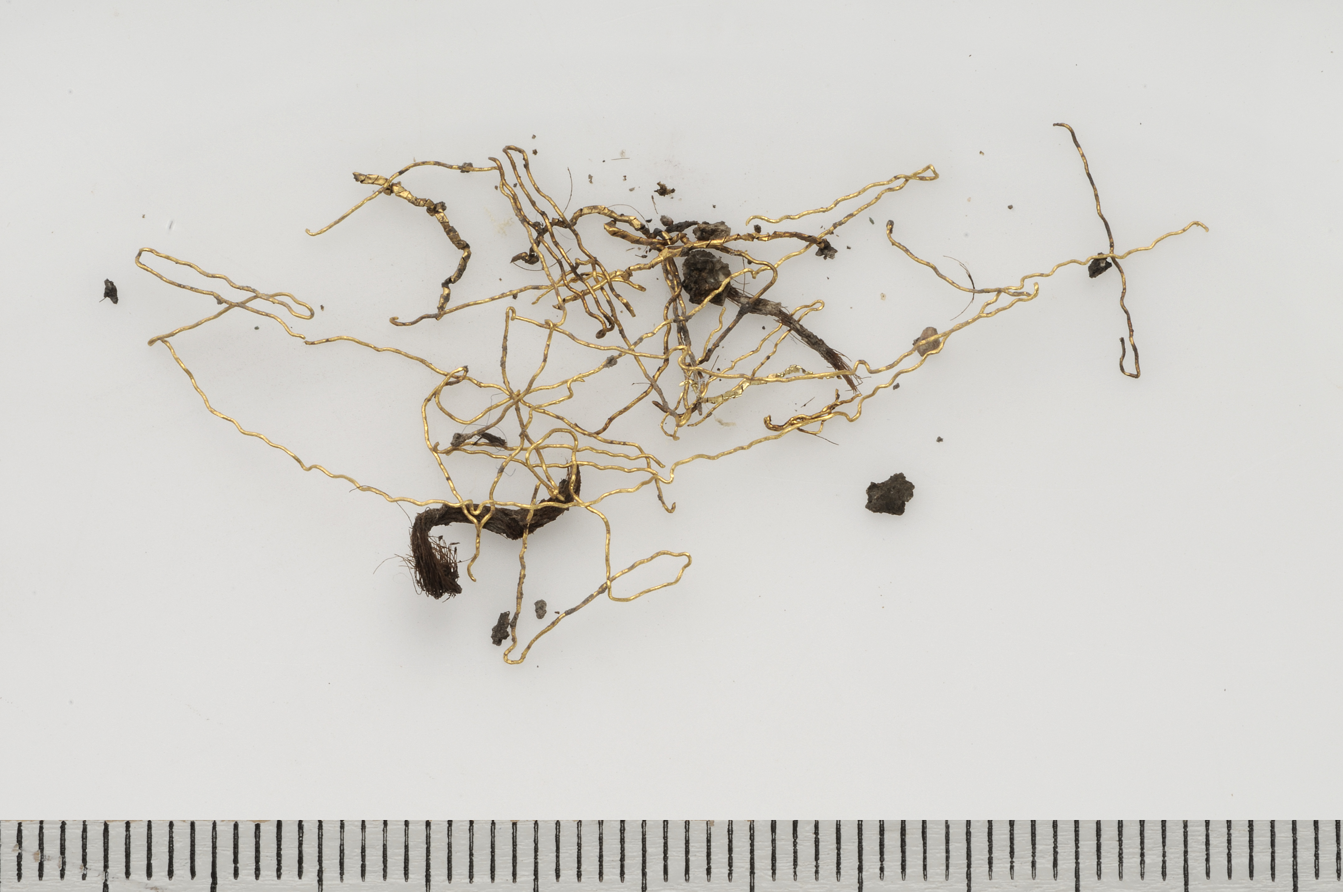 Guldtrådar och textilfibrer - med all sannolikhet från det guldbroscherade bandet.