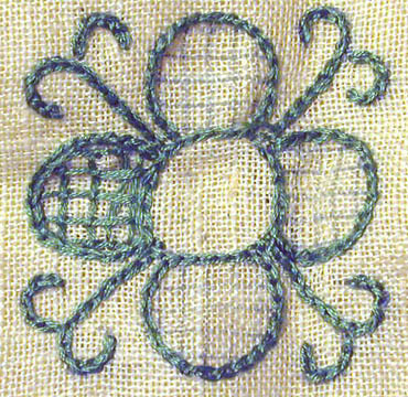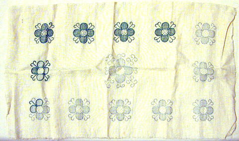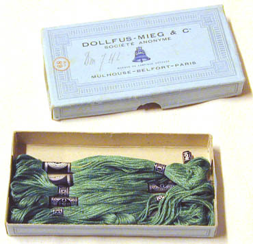 Pappask med lock, ljusblå med tryck i blått, orange och gult. På ovansidan: "DOLLFUS-MIEGet Cie // SOCIETE ANONYME // 'fabriksmärke' // MULHOUSE-BELFORT-PARIS", samt "Art // 89".På sidan tryckt : "RETORS A BRODER D.M.C // 12 ECH DE 10 MET 2783 Jaune d'Or No.4". På botten tryckt: "MADE IN FRANCE // Trade-marks reg. U.S. Pat.Off". I asken sexgarnhärvor, ljusgrönt bomullsgarn. Fyra av härvorna med båda originaletiketterna, text:"DMC // 10 met // 25 // MOULINE SPECIAL // DOLLFUS-MIEG et Cie" och "320". En härva är knuten på mitten och en etikett ligger lös. Vid asken ettbomullsbroderiunderlag med förtryckt blomstermönster, l: 710 mm, b: 410 mm. Fyra avblommorna färdigbroderade med grönt bomullsgarn, två påbörjade. Brodernålen fäst vid enav de färdiga blommorna.