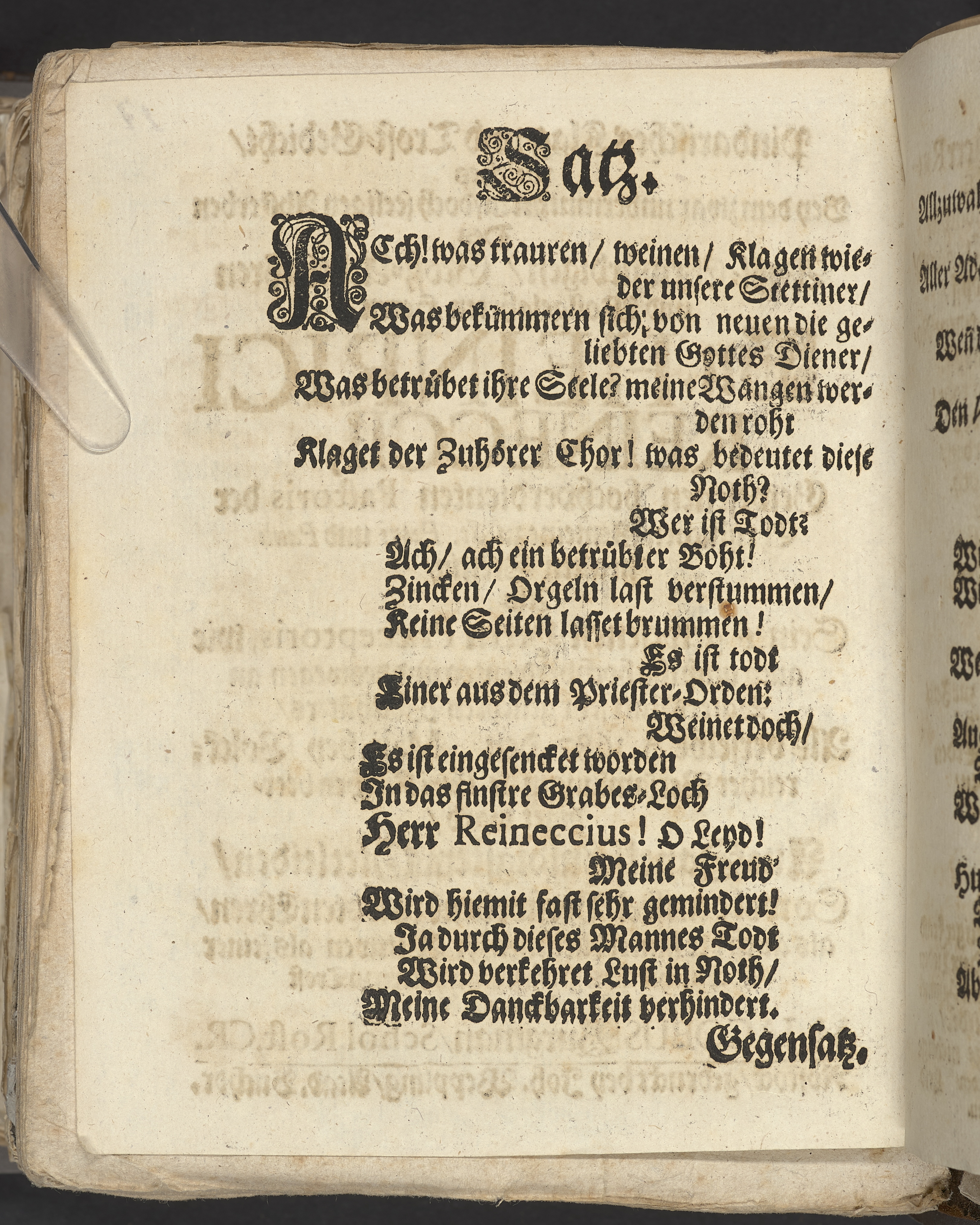 Pindarisches Klag- und Trost-Gedicht, welches bey dem ... Absterben des ... Hr. Heinrici Reineccii ... pastoris der christlichen Gemeine zu St. Petri und Pauli in alten Stettin ... als derselbe a. 1687 den maij ... in St. Petri Kirchen beerdiget ward ... auffsetzete ... M. Jacobus Burgman ... Rostock, gedruckt bey Joh. Weppling.