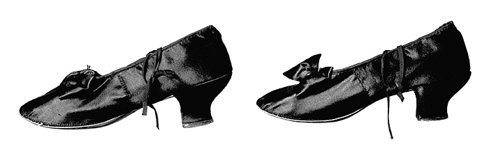 SKOR (s. k. pumps), ett par Av svart siden (atlas). Vändsydda. På vardera sidan på mitten en tvärgående efterstygnssöm (s. k. sidosömmar) av svart silke. Kring fotöppningen ett svart fyrskaftat sidenband som dragsko för en svart tvinnad bomullssnodd. Framtill en rosett av svart atlas. Knytband av smala svarta silkestrikåband, fastsydda i sidosömmarna med kaststygn av svart silke. Sulor raka, av ljusbrunt tunt läder, med rundad tå. Fodersulor av vitt getskinn. Klack hög, av trä, starkt insvängd samt överklädd med svart atlas; ytterlapp av ljusbrunt läder, fäst med sex stift av mässing. Mått: Längd: omkring 22 cm.; bredd: omkring 6 cm. Klack, höjd: omkring 3,3 cm. Inköpta av Johanna Kempe på 1880- eller 1890-talet hos en skohandlare i Stockholm, antagligen P. G. Lagerson (Wiener-Skomagasinet).