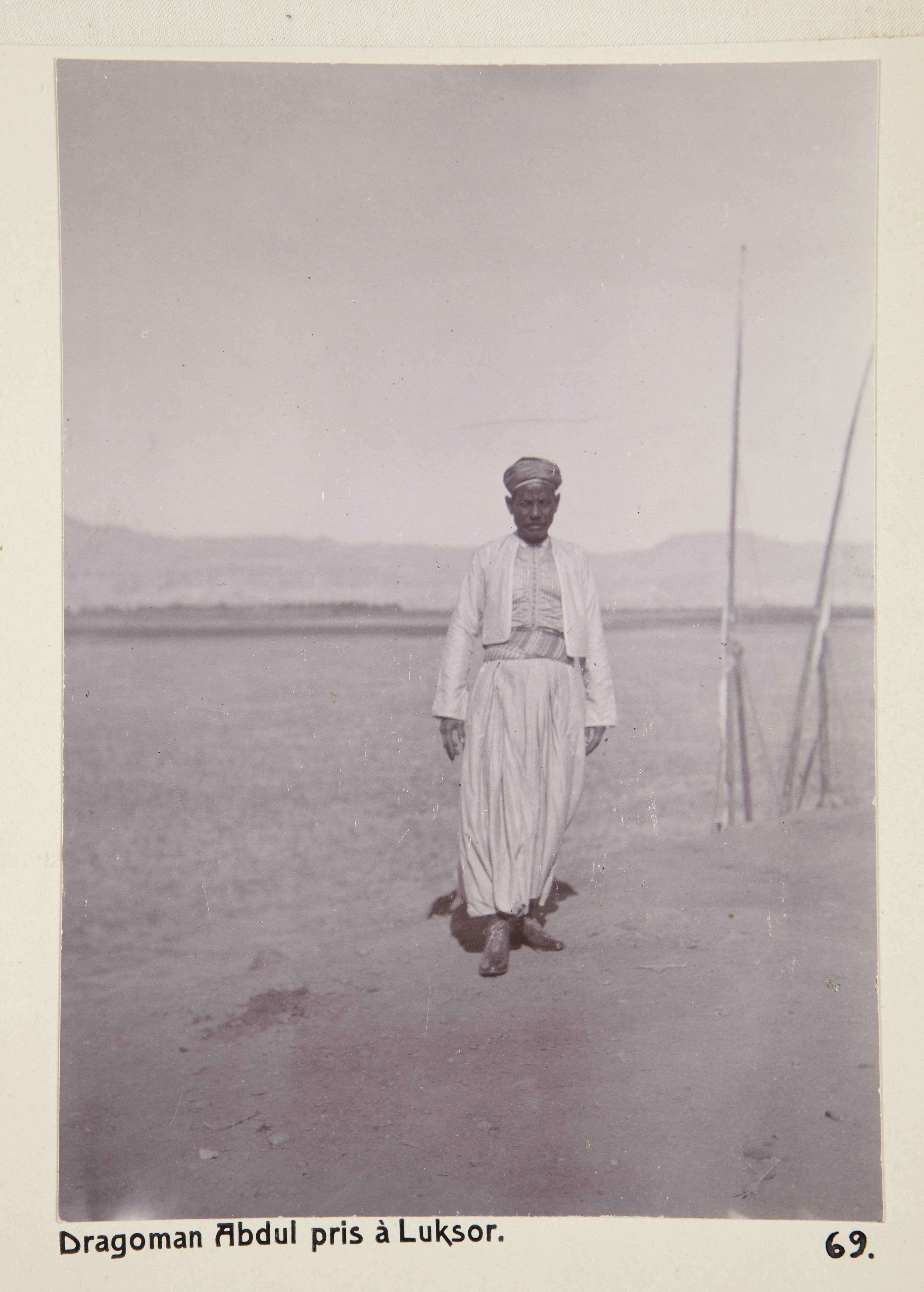 Dragomanen Abdul, fotograferad i Luxor, Egypten. Text på fotografiet: Dragoman Abdul pris à Luksor. Fotografierna LXVI:M.01.- 201. kommer från resan till Egypten och Sudan som Wilhelmina och Walther von Hallwyl gjorde vintern 1900-1901. De lämnade Sverige den 5 november 1900 och fortsatte från Egypten till Palestina den 28 mars 1901. Med på resan var döttrarna Ellen med maken Henric de Maré och Irma med maken Wilhelm von Geijer. Wilhelminas sällskapsdam, fröken Ida Uhse reste också med. Under en del av resan anslöt sig ledamoten av Internationella domstolen i Kairo, assessorn Otto Conrad Waldemar Cedercrantz med makan Anna Elisabeth. Vid resan uppför Nilen hade Walther von Hallwyl hyrt ångfartyget Columbia med besättning. Båtresan startade i Kairo 27 december 1900, gick ända till Wadi Halfa varifrån man reste vidare med tåg till Khartum och tillbaka till Wadi Halfa. Båten vände åter i riktning mot Kairo, men det verkar som att sällskapet tog tåg sista biten, från Luxor. Henric och Ellen de Maré samt fru Cedercrantz lämnade båten redan då de passerade Luxor första gången. Resten av sällskapet återvände till Kairo den 1 mars. Fotografierna LXVI:M.01.-120. togs av resenärerna själva, de största av Ellen de Maré, de mellersta av Wilhelmina von Hallwyl och de minsta av Wilhelm von Geijer. Resten köptes av professionella fotografer i Kairo, de flesta från Studio Photogr. Artistique G. Lekegian & Cie. Alla uppgifter kommer från Ida Uhses reseanteckningar.