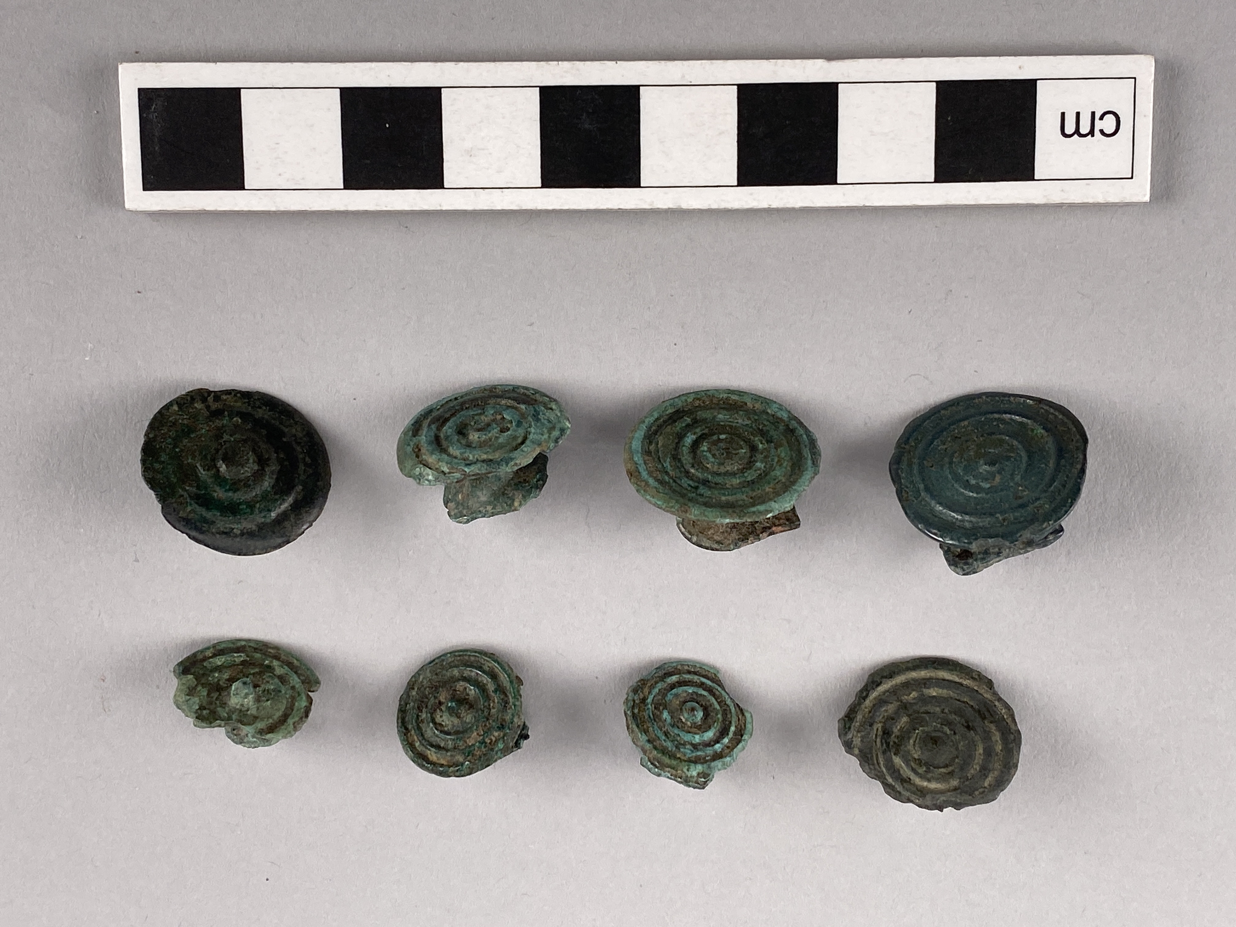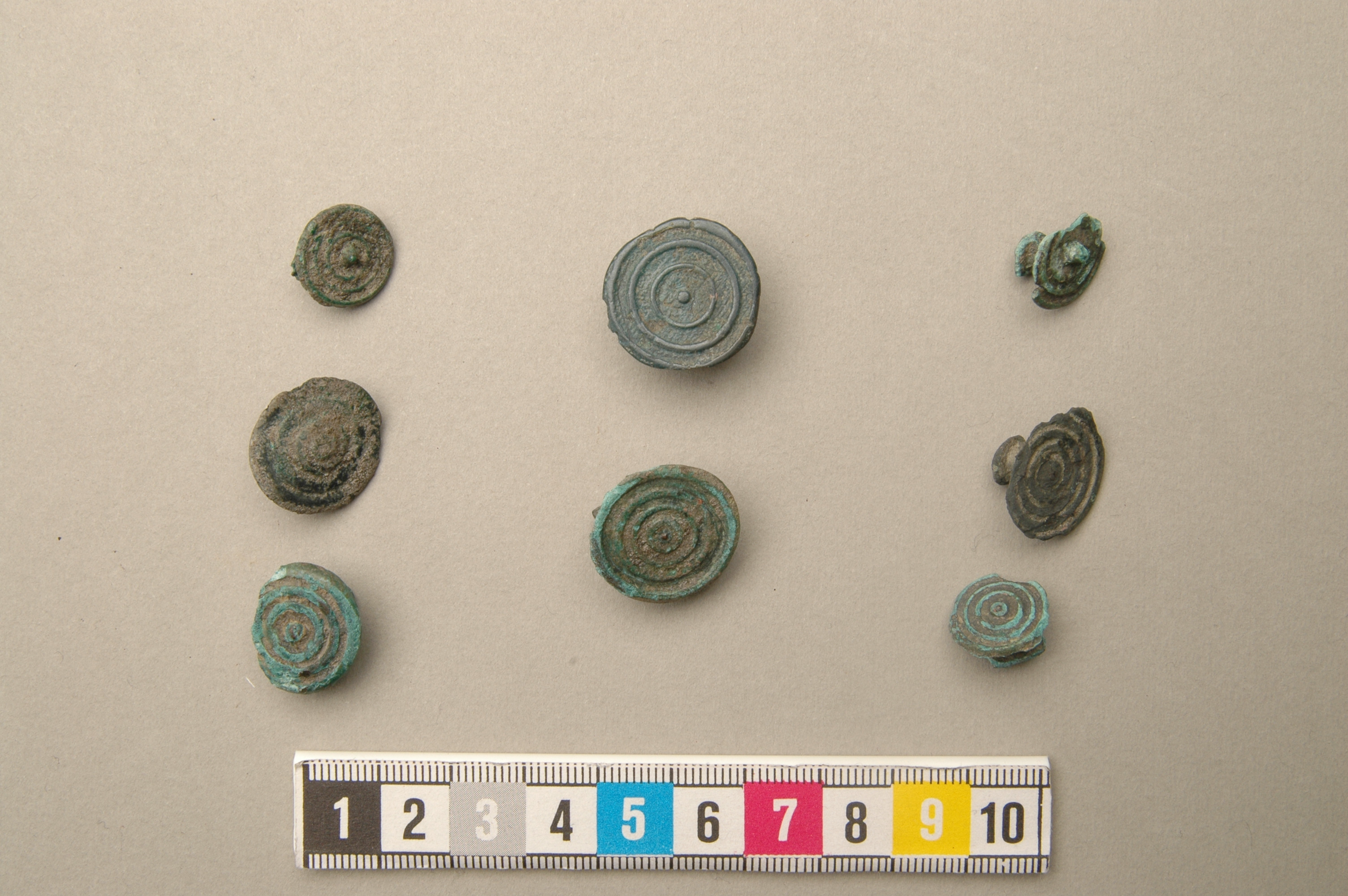 Åtta dubbelknappar av brons som är ornerade med koncentriska upphöjda cirklar omkring en upphöjd mittpunkt.