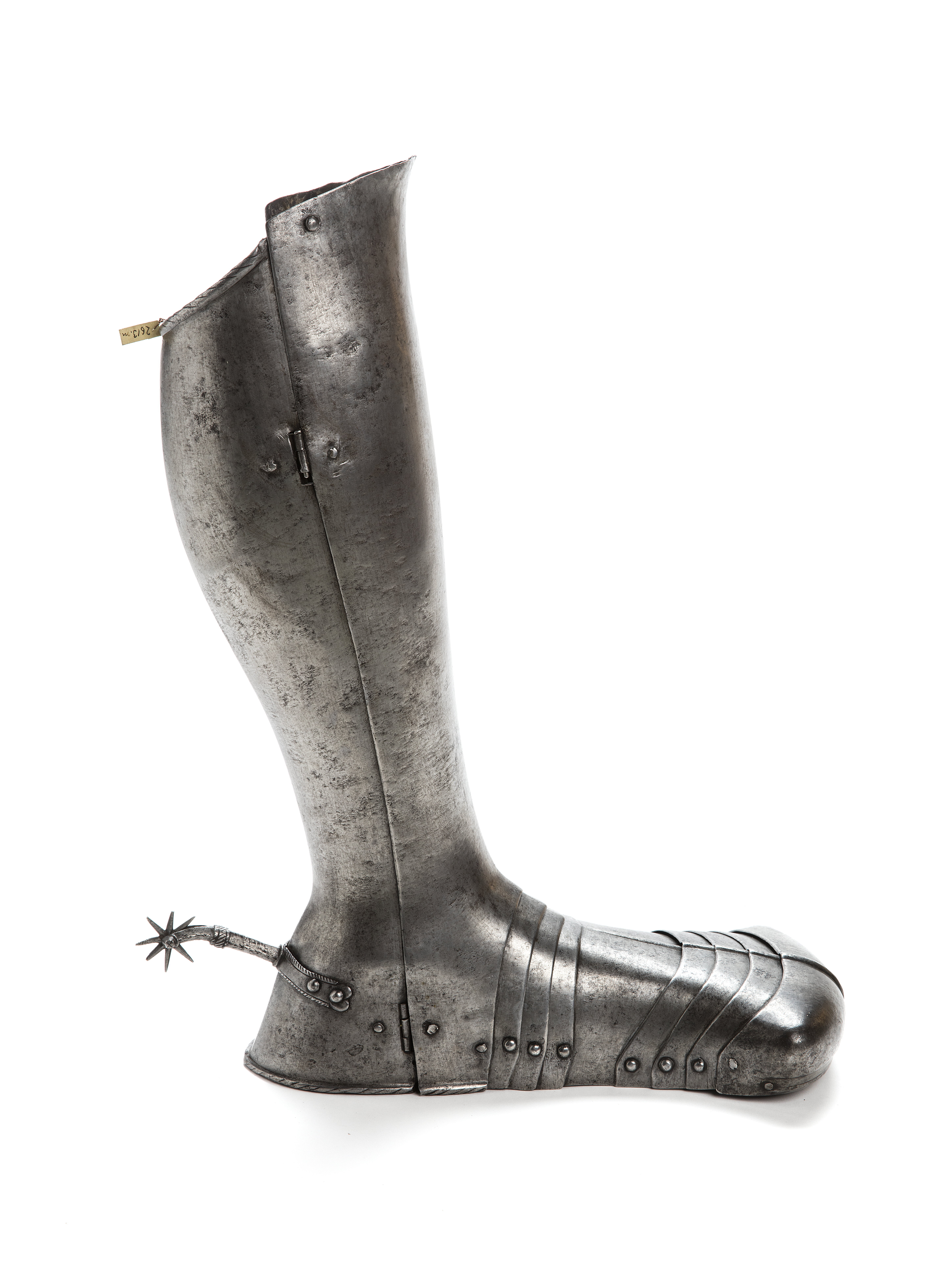 Höger underbensrör med rustningssko i smitt stål, bestående av tio delar samt sporre. Underbensrör bestående av två delar. Framdelen med markerad hamrad mittås med urtag för fotdell. Formad efter underbenenets form. Översta delen något utskjutande och format efter knäledens nederdel. På överkantens ytter och innersida, nitar för infästning av knäleden. På insidan längs kanten, 100 mm från överkanten och 28 mm från nederkanten fyra stycken hål för bakdelens tappar för fastlåsning. Ovanför de nedre hålparet, en krok för att säkra i bakdelens tapp. På utsidan 105 mm från överkanten och 25 mm från underkanten gångjärn som är nitade i framdelen och vaddelen. I underkant inåt omvikt, rundsmidd kant med mejslad repdekor. Insidans fotknöl är omarbetad med nyare hammarslag, sannolikt för att anpassas till en annan bärare. Bakdel med tydlig lodrätt hamrad mittås. Tydligt markerad vadmuskulatur med markant utskjutande hälparti. I över- och underkant inåt omvikt och rundsmidd kant med mejslad repdekor. Omkring 60 mm från nederkanten, på hälen, en med fyra nitar fäst sporrbygel med en 68 mm lång hals med en åttauddig klinga. Fotdel av åtta delar, sju lameller varav en bredare samt en tåkappa. Samtliga lameller med markerad mittås som övergår i en vulst med mejslad repdekor över tåkappan och de nedre lamellerna. Tåkappa av oxmuletyp med fyra nitar på undersidan nitad tåplåt. Samtliga lameller och tåkappan nitade i varandra med två nitar i nederkanterna.