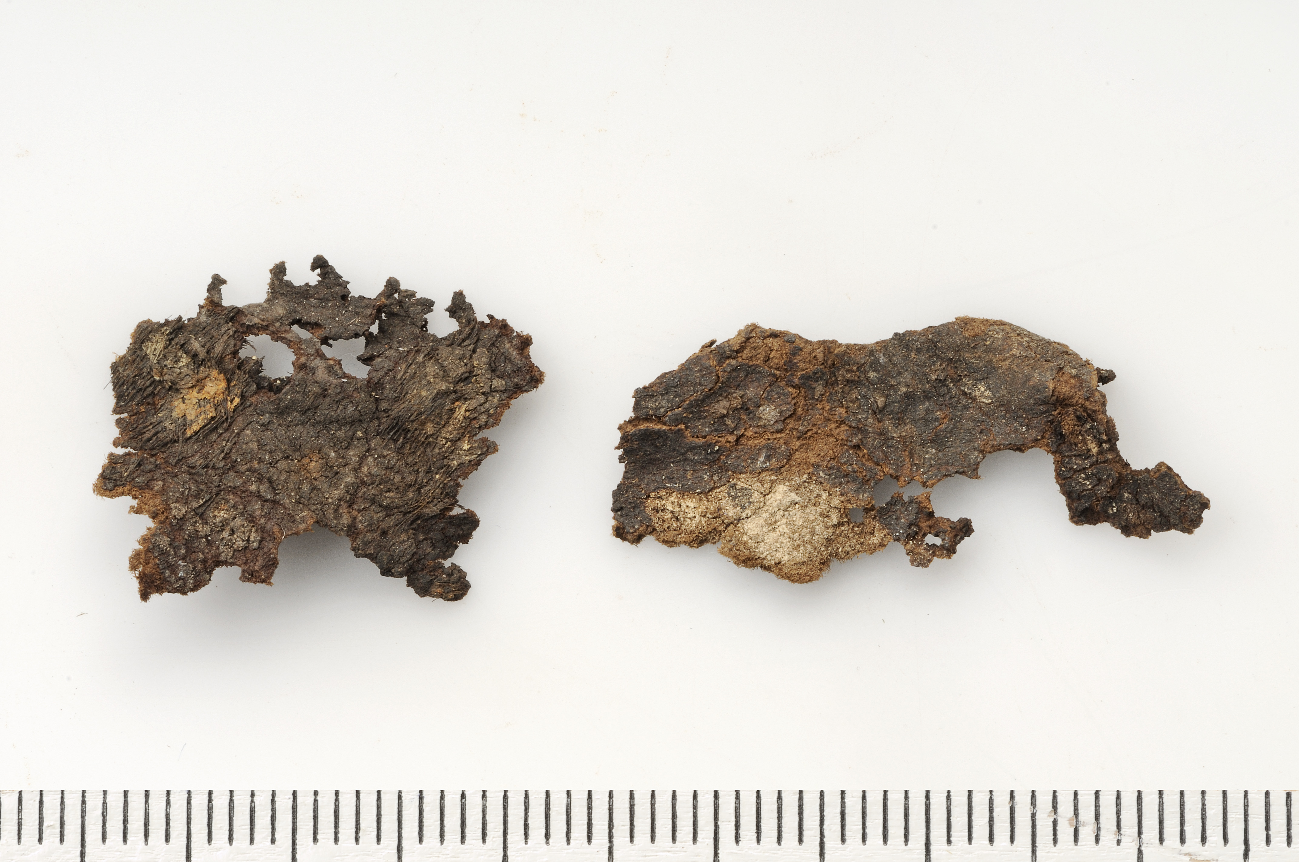 2 små läderfragment - möjligen från börsen i Bj 1074. Fler fragment kan ev finnas sammanblandade med kamfodralet.