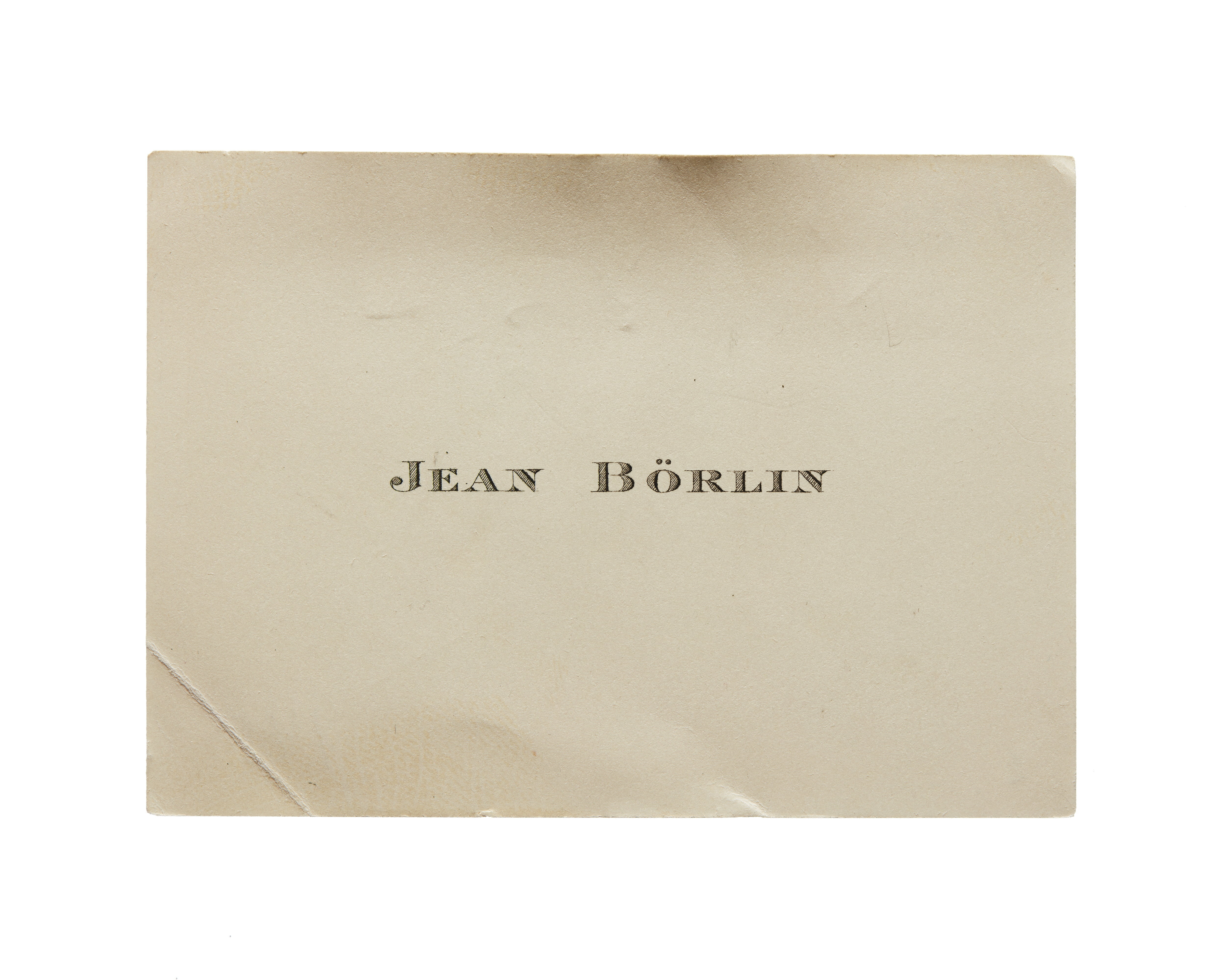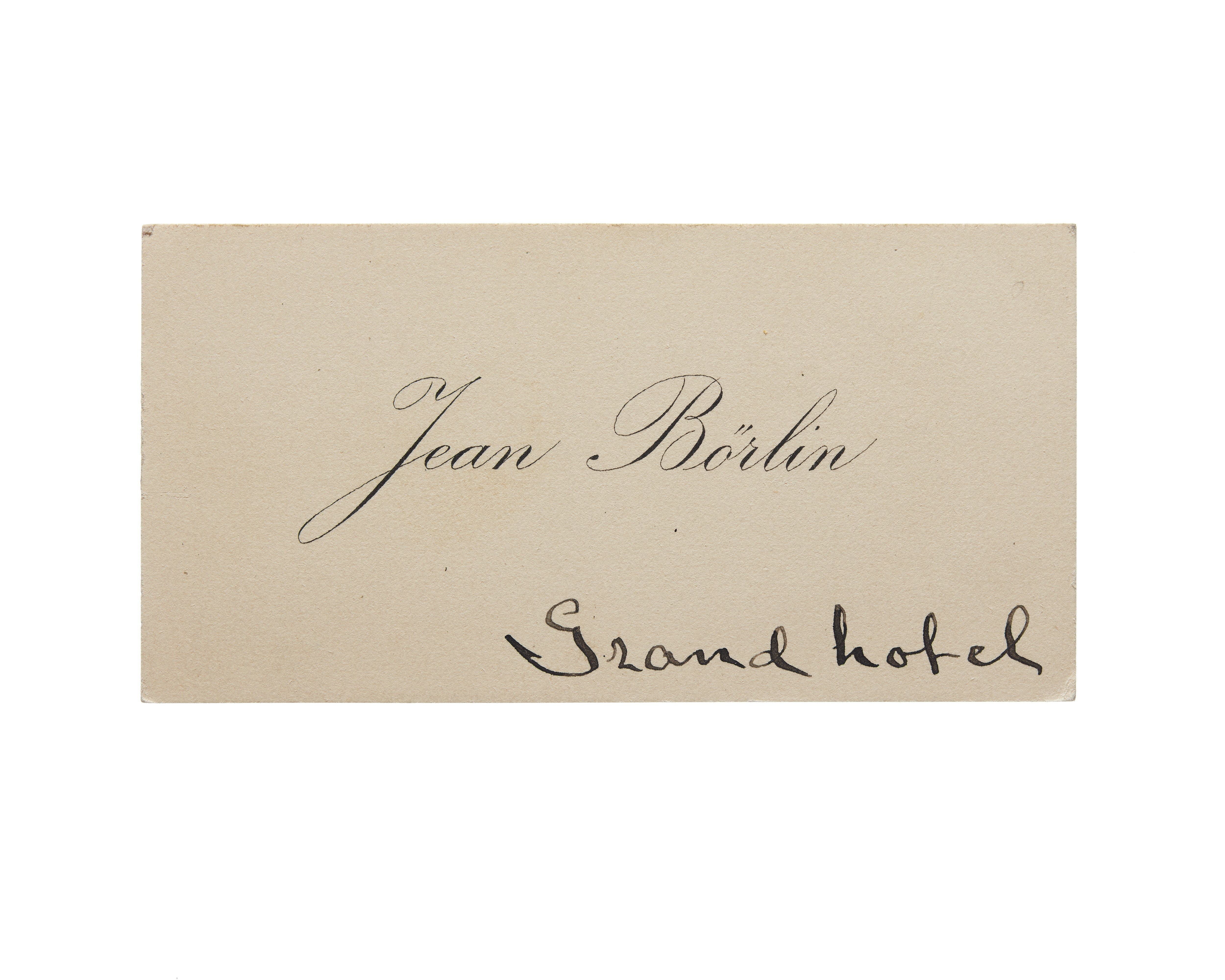 Två visitkort från Dansör Jean Börlin. Första kortet daterat 1920. Adress (nedre högra hörnet, handskrift) Grand Hotel. Andra kortet daterat 1923, vikt i nedre vänstra hörnet.