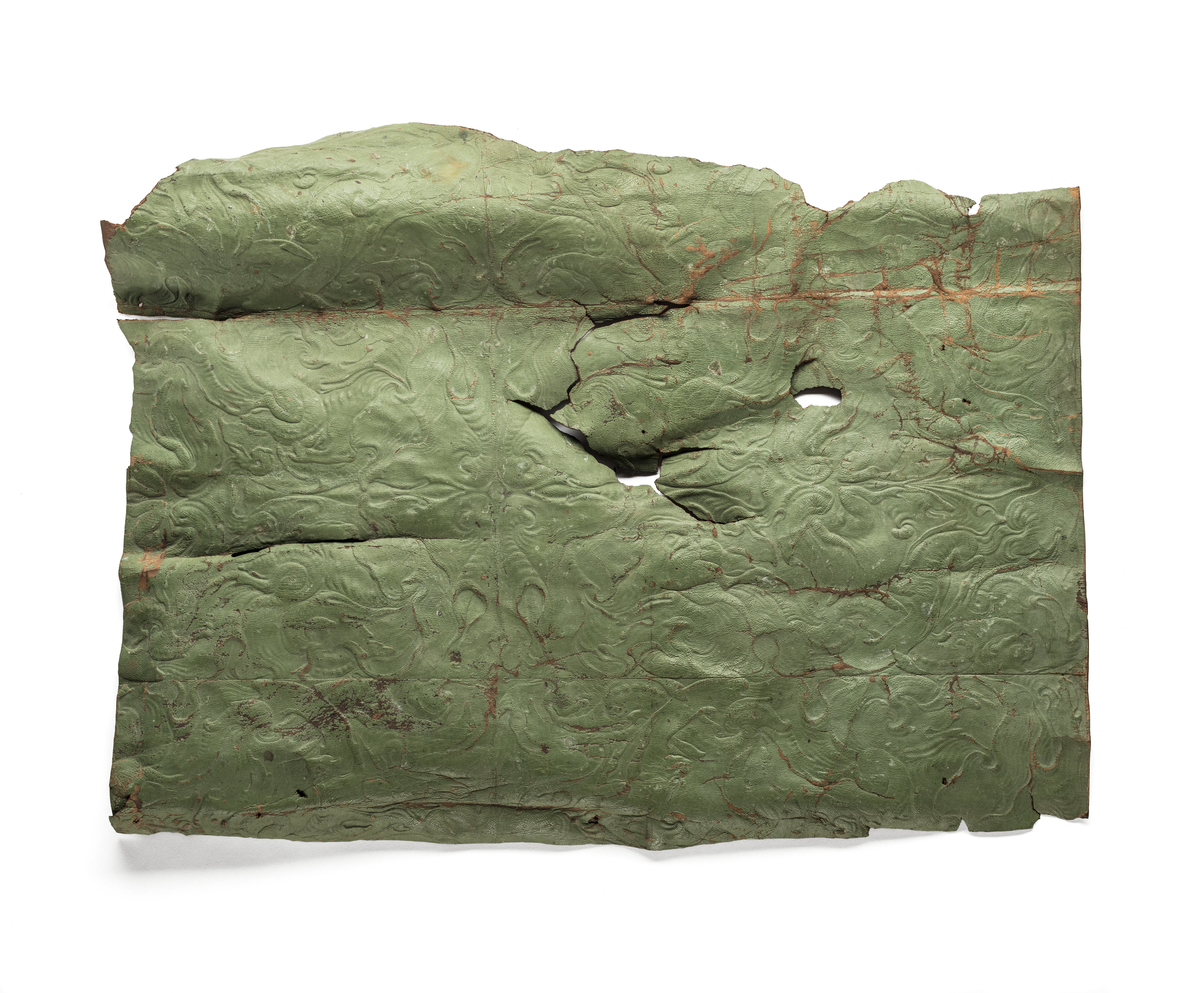 Gyllenlädersfragment med pressat mönster av broskornament i grönt.