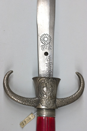Fäste av försilvrad, svagt magnetisk metall, nedböjda parerstänger som bildar ett C med ornering av ciselerade fjäll. Neddraget neråt vidgat kryss med ciselerad ornering, blomma rocaille och c-formade bågar samt stämpel med europeiska bokstäver bl.a. först ett K och sist R. Kavel av rödfärgat elfenben med några enstaka räfflor. Kaveln upptill framåtböjd och med konturerad överkant, överst vit sten i blomformig infattning. Nedtill ringbeslag i räfflad vit magnetisk metall. Klinga av stål, som bredast 30 mm, smalnande vid fästet. Eneggad, böjd med en svag ås 9 mm från ryggen. Klingryggen åsad. Nära fästet ett runt hål och en etsad inskrift kanji på vardera sidan. På insidan också en blomma.