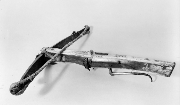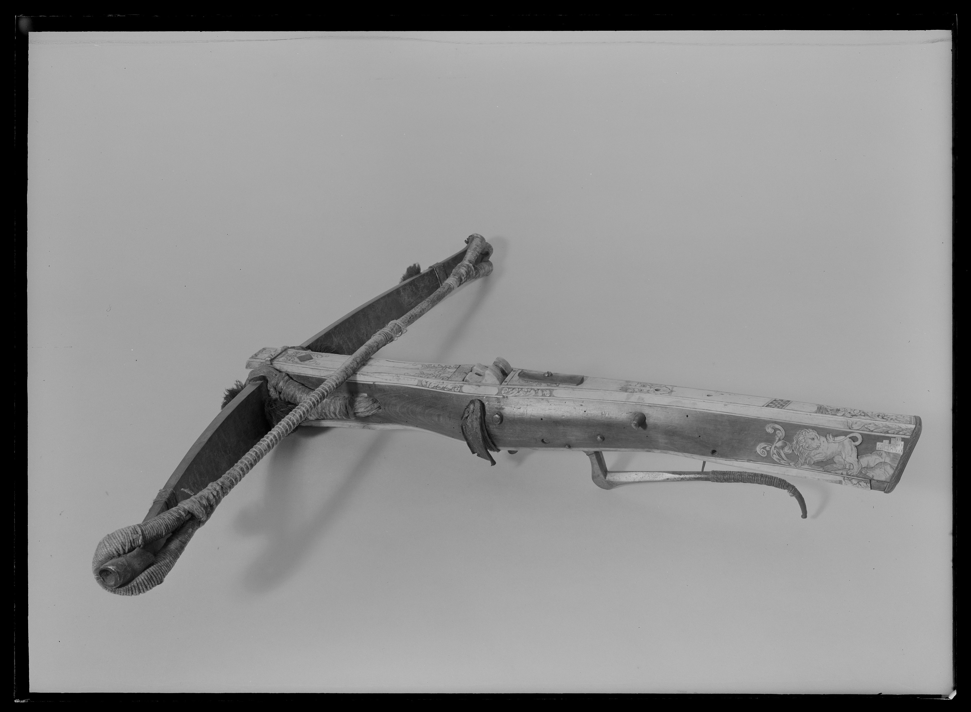 Båge av stål, fästad vid stocken med hampsnöre. På bågen 5 tofsar av svart ylle. Sträng av hampa fästad vid bågen med en skyddande läderbit under. Lås med nöt av ben och pilhållare av horn. Avtryckare med yttre säkring och snälltryck. Stock av trä med rak kolv något antydd vinge. Bakplåt av horn graverat "CHEMNITZ 1734". På anslaget inlagt graverat lejon av ben och ett slott av pärlemor. På stockens över- och undersida heltäckande graverade benplattor med blad och maskaron. Ståltappar för spännande av bågen finns bakom låset. Nöten är fäst med hamptråd som har en skyddande läderrem. Rörlig bygel av stål. Enarmad varbygel av stål med nedåtböjd ytterände som är lindad med hampa.