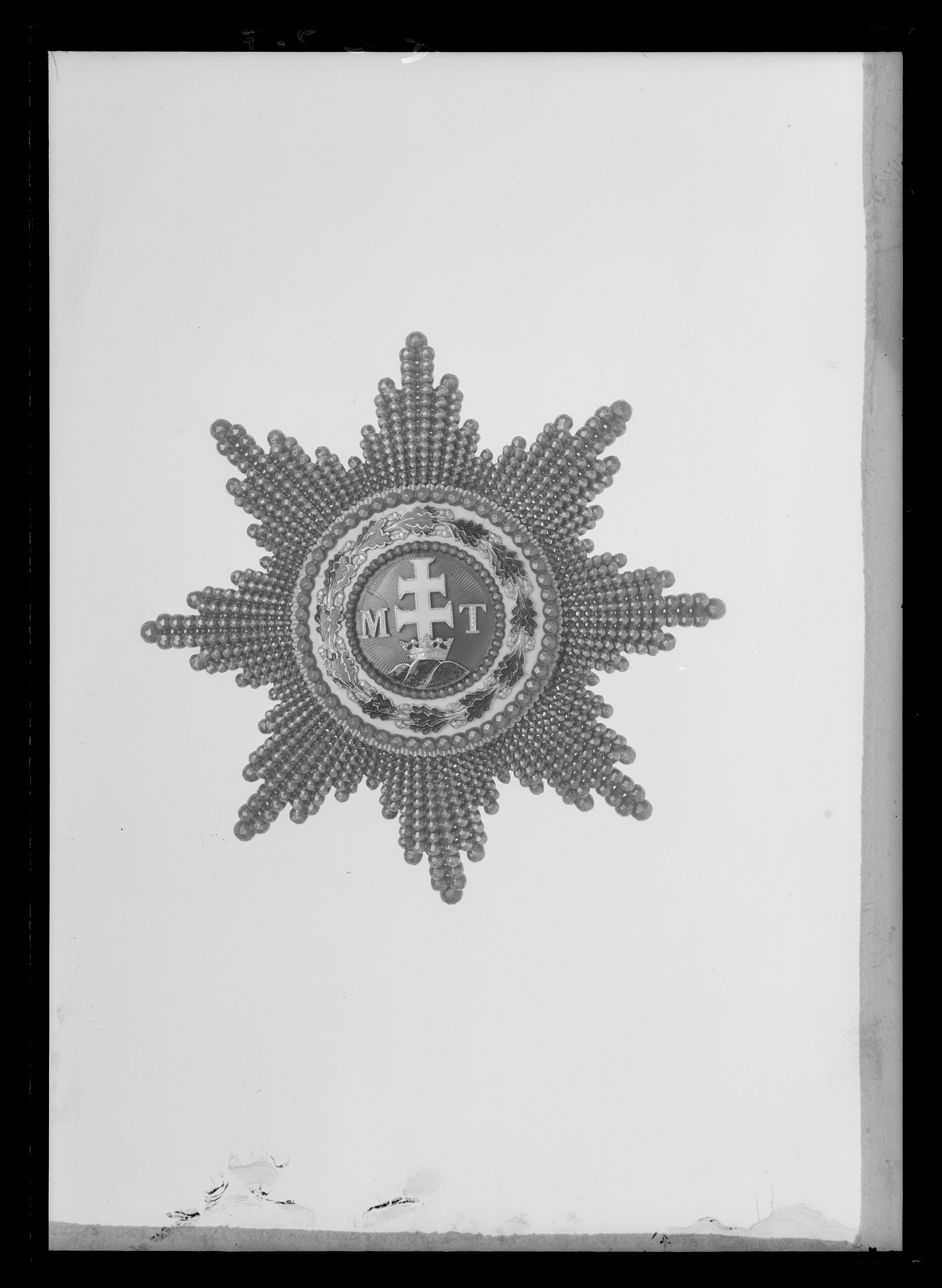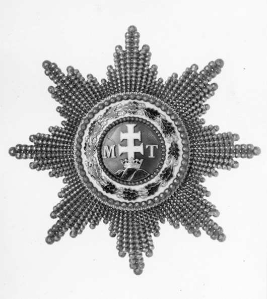 Åttauddig , flinkerad strålstjärna av silver (fasettslipade kulor). Välvd medaljong täckt med röd genomsynlig emalj, därpå fäst grönemaljerat treberg, på vilket står ett vitemaljerat patriarkkors med en öppen guldkrona om foten. Korset flankeras av M T av guld. Vitemaljerad ring, därpå fäst eklövskrans av guld samt grön emalj, kantringar av fasettslipade kulor, större i den yttre ringen, mindre i den inre. På frånsidan en vertikalt placerad säkerhetsnål, på medaljongens baksida stämplar: FR och 900, på nålen stämplat: "C.F.ROTHE", "WIEN", samt 900.