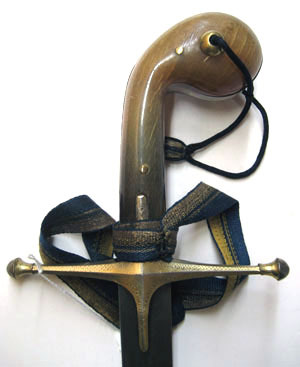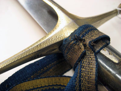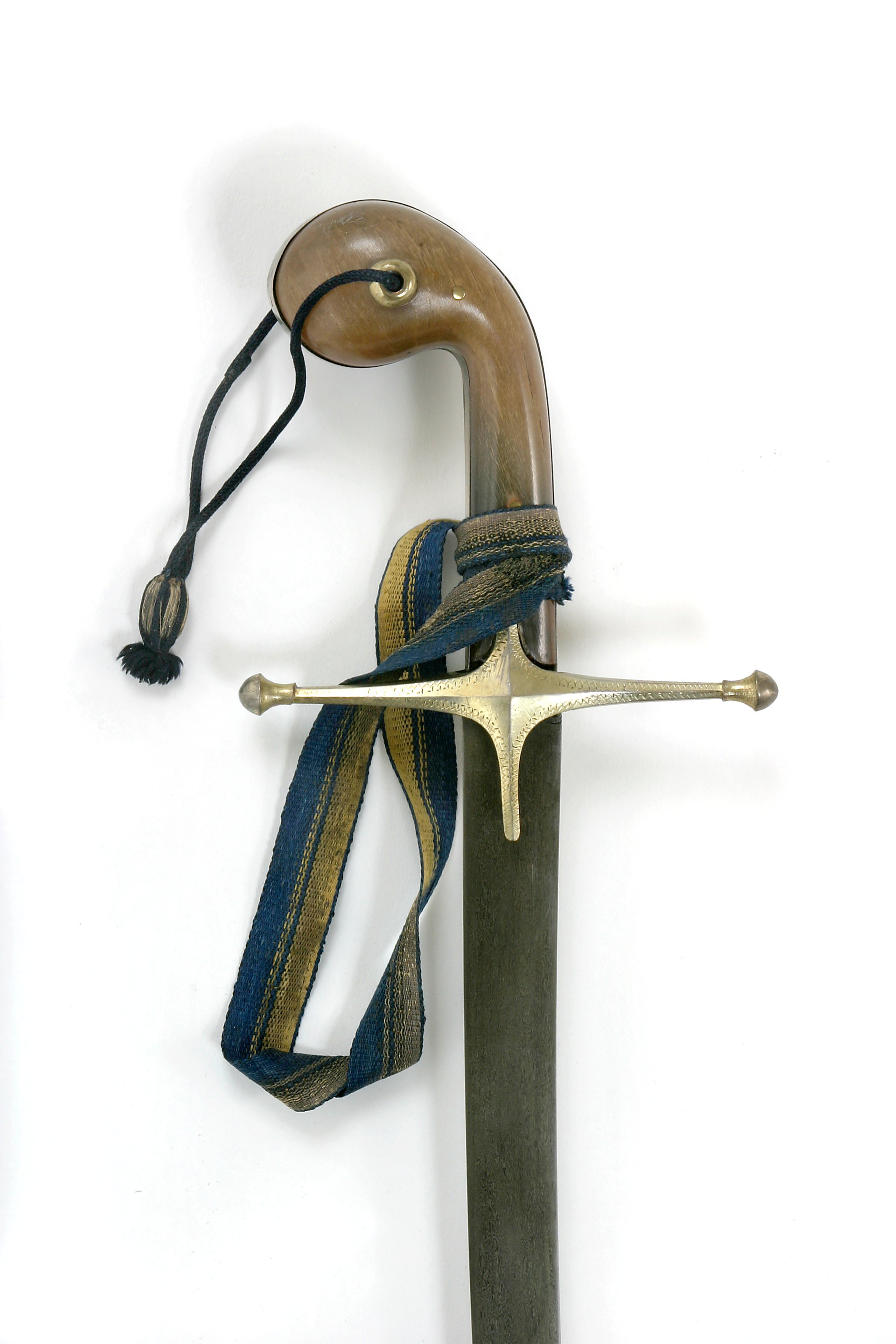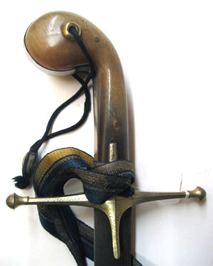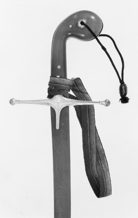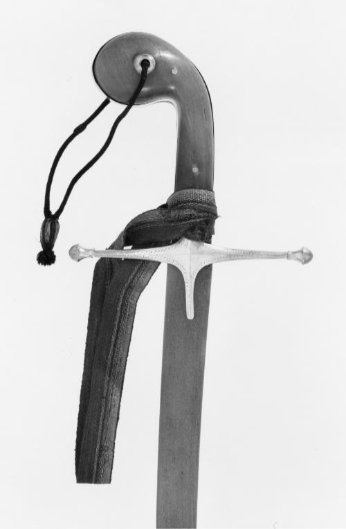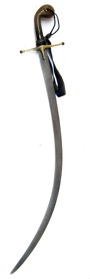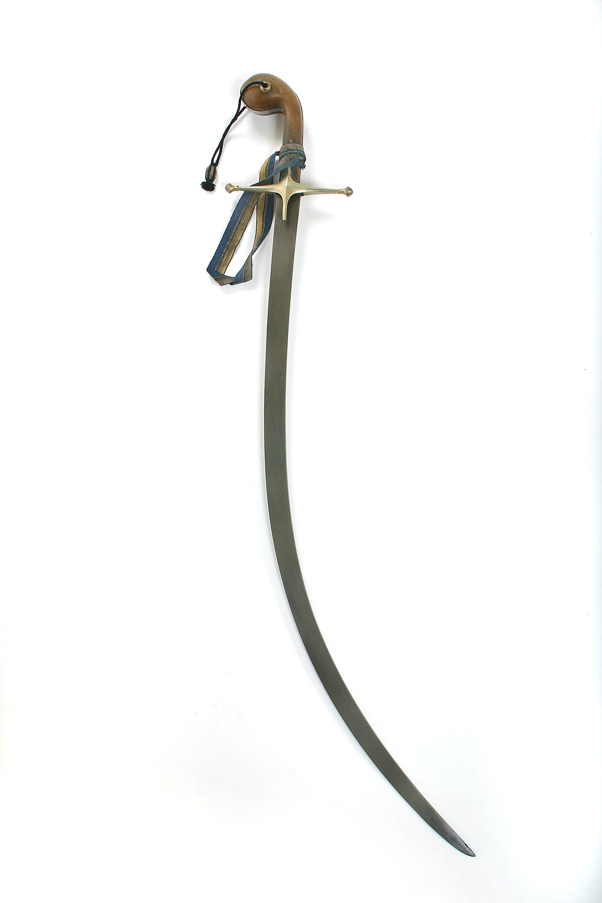 Fäste av horn med mittskena av stål med dekor av silver i siksackmönster. Fästet är rundat och böjt mot klingeggen, i fästets ytterdel finns en bössning och en spik av förgylld mässing. Raka parerstänger med graverad dekor och halvrunda ytterändar och styrskenor av förgyllt silver. På styrskenorna finns otydliga stämplar, dels en tughra, dels en stjärna. Eneggad damaskerad klinga av stål (wootz), böjd. Tillbehör: Band av blått silke och silvertråd lindat kring kaveln. Handrem av svart silke med ollonformad tofs av silvertråd.
