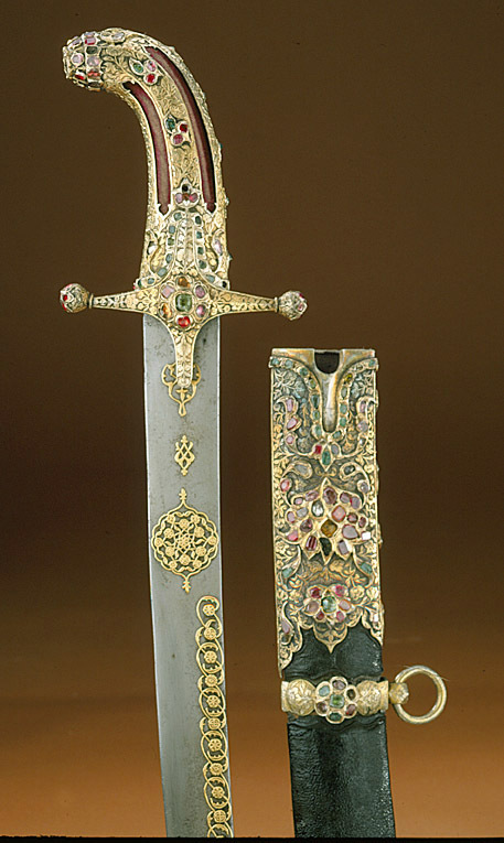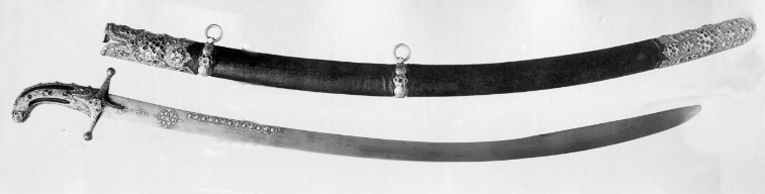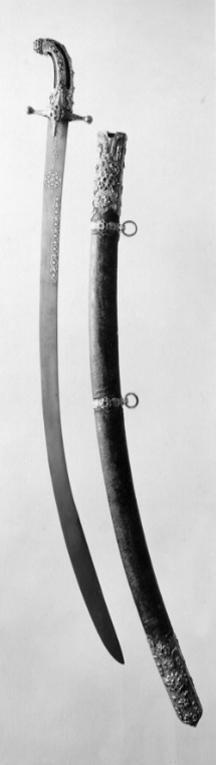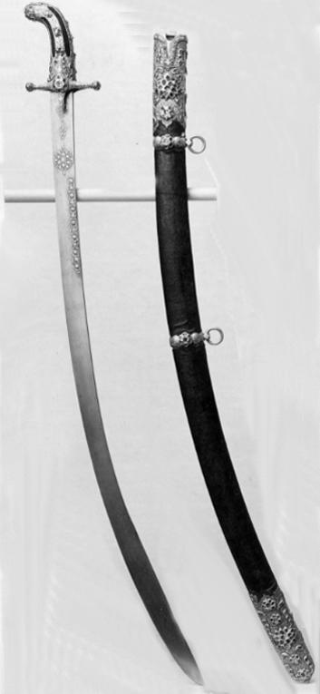 Balja klädd med svart läder (åsneskinn?), söm i sidan av silvertråd. Beslag av förgyllt silver. Munbleck 137 mm med ciselerad och graverad rankdekor och upphöjda blomformiga fattningar med röda och gröna stenar varav flera är bortfallna. Konturerad nederkant. Två smalare mellanbeslag 19 mm breda med varsin graverad hållare med rund koppelring. Beslaget ornerat med graverade blommor och inlagda med ursprungligen fyra gröna och tre röda stenar i rosettform. Konturerade kanter. Doppsko 141 mm med konturerad överkant ornerat med ciselerade och graverade rankor och upphöjda blomformiga fattningar med röda och gröna stenar. Några bortfallna. Liten trekantig symmetrisk, genombruten släpsko. Gåva av direktor Henrich Bechshöft ur den genom Bukowski auktion försålda grevliga kellerska samlingen. Keller-Sachovskojsamlingen nr 73. Ursprungligen furst Alexander Sachovskojs samling, S:t Petersburg, ärvd av dennes måg generalmajor greve Theodor Keller, död 31.7 1904 samt ärvd av dennes son Alexander Keller. Såld i början av 1918, kom över till Sverige i samband med detta. Utställd i Livrustkammaren 1920. Såld på Bukowskis auktion 5 mars 1920, katalog 225, nr 186, 6000:-.