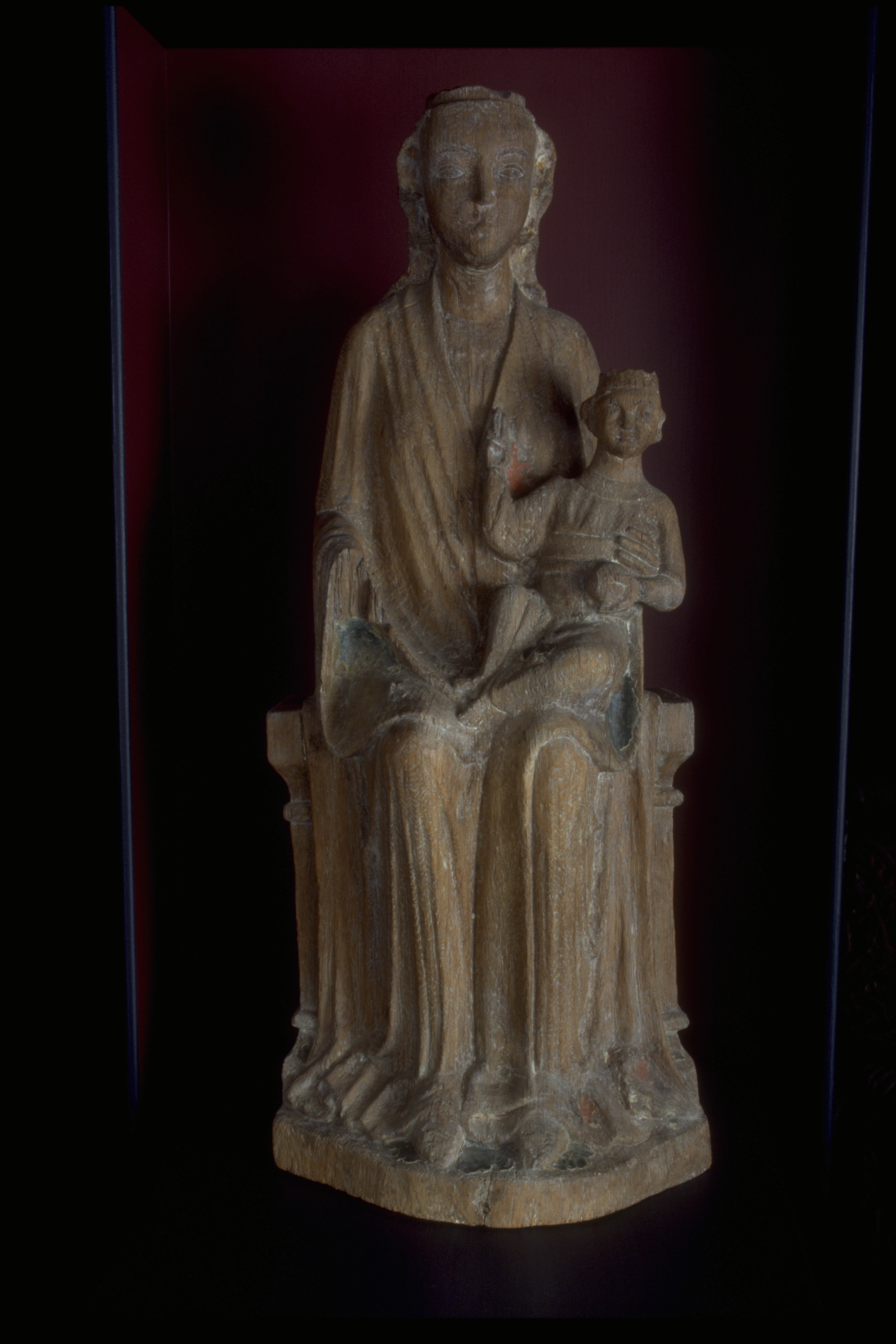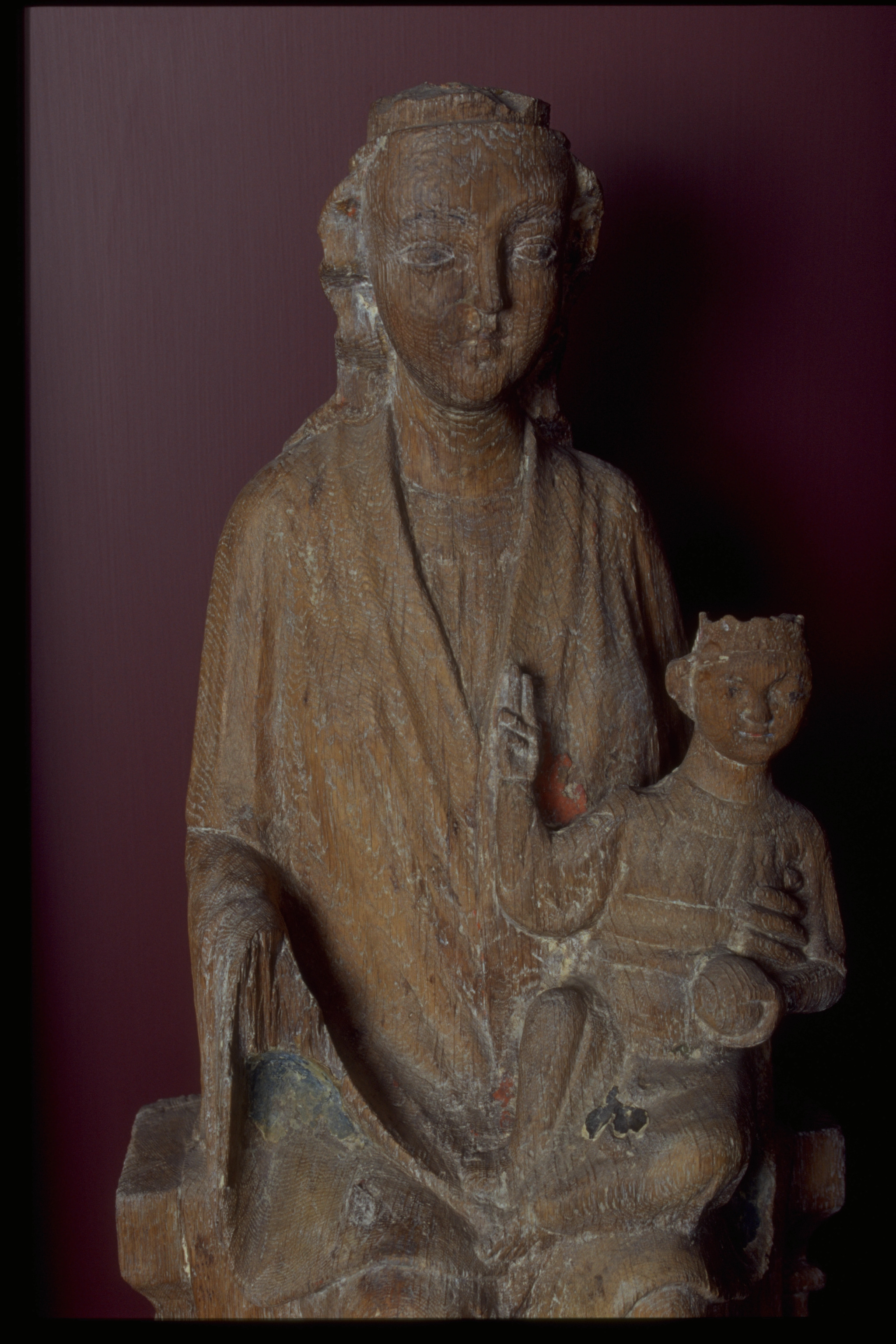 Kondition: Marias högra hand bortbruten, hennes krona förlorad, barnets krona fragmentarisk. Färg: endast smärre fragment.