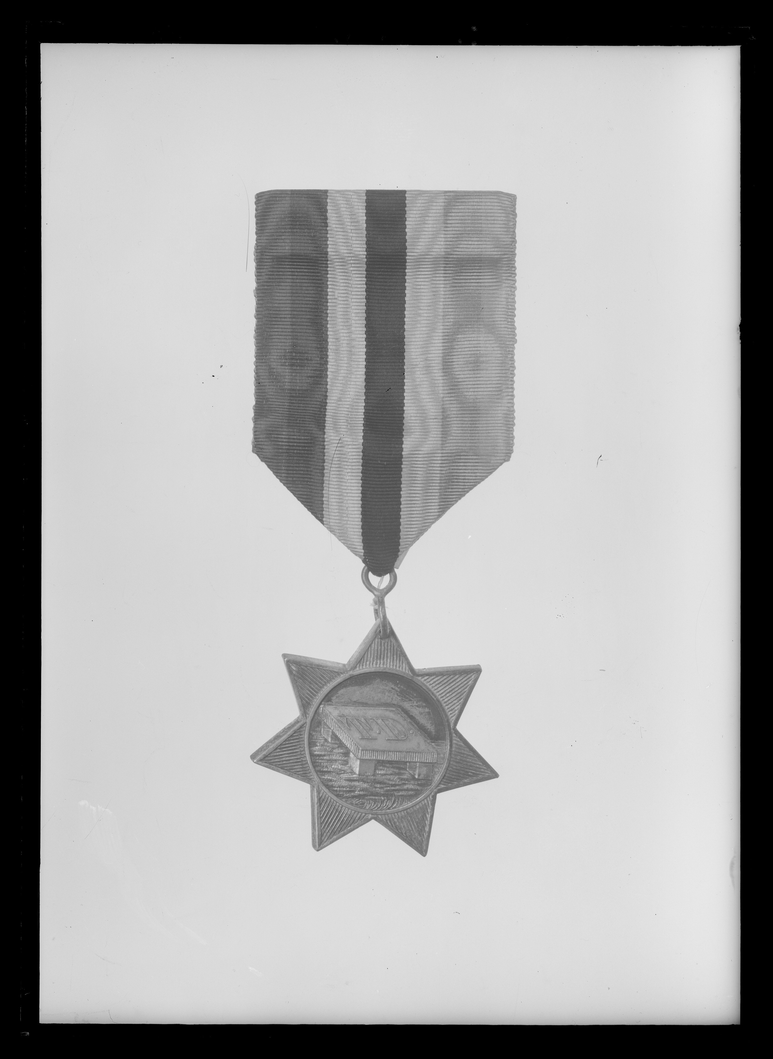 Sjuuddig stjärna av silver med räfflade armar, i mitten en cirkel med reliefbild, på åtsidan en kvadratisk platta med fyrkantiga ben, på plattan text: "T. D.", plattan står på mark. Frånsidans cirkel har relieftext: "ENDRÄGT". I övre armen ett hål, därifäst en ring, fastsydd i medaljbandet.