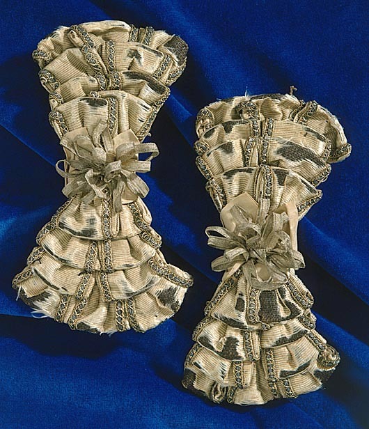 Skoros till dräkt av grå sidenrips med guld- och silvergaloner.