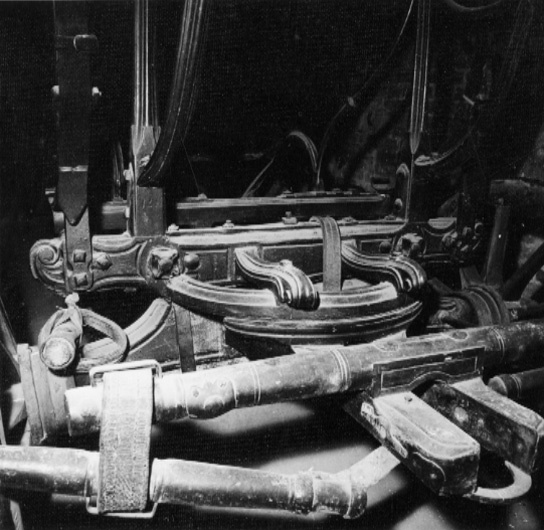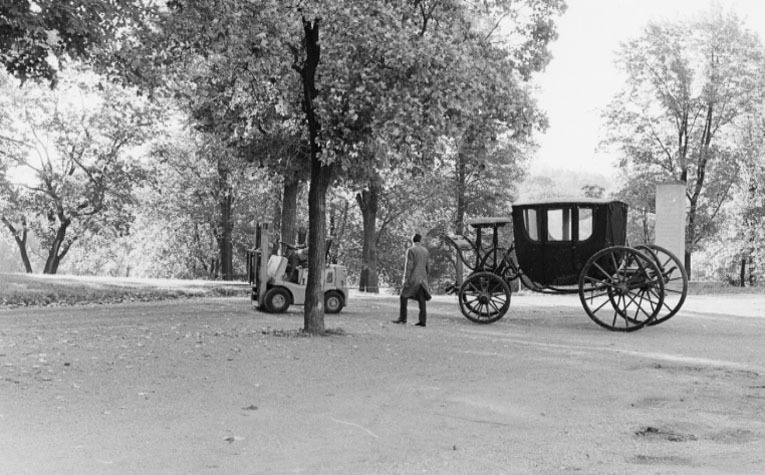 Hovvagn, s.k. sjuglasvagn med fast kur (coach) hängande i C-fjädrar och läderremmar överdragna med svart kläde. Vagnskorgen gulmålad, har U-formig kontur, svagt välvt tak och är såväl in- som utvändigt helt klädd med svart kläde. Inkantning med veckband av svart kläde. 3+3 sidofönster och två framfönster. Två dörrar och två nedfällbara trappor i två steg av svartmålat stål och läder. På bakre ytterväggen vävda lakejhandtag. Visavisäten med stomme av svartmålat trä. I vardera sätet förvarings- utrymme, trälock med två gångjärn. Sargarna något utsvängda i mitten. Stroppar vid fönstren. Profilerade bandfästen av svartmålad mässing vid dörrfönstren. Ovala vridhandtag med svart kläde. Svartmålat underrede av stål och trä. Den röda undermålningen lyser fram på flera ställen. Fyra hjul, de främre framför korgen. Hjulnaven märkta "15 H 21" och "H M 21 15", "21 15" och "21 15". Två bommars svanhalsar märkta "IHC" mellan två öppna kronor. Framaxel med vändkrans. Kuskbock med läderklädd fotbräda och två fothällor är monterad vid underredet på vilket stämplar finns: "IHC" över tre öppna kronor. Fotstödets framsida har symmetriskt bladmönster i relief. Framtill på underredet: 15. Baktill en rektangulär, läderklädd, lakejbräda med insvängda hörn, fotsteg nedanför. Strävor med detaljer utformade som blad eller voluter, profilerade. Röda svänglar. Svart tistelstång märkt "15". Två verktyg: en l 230 mm, bult runt huvud och skåra i slutänden, en l 440 mm, hjulnyckel med kvadratiska ändar.