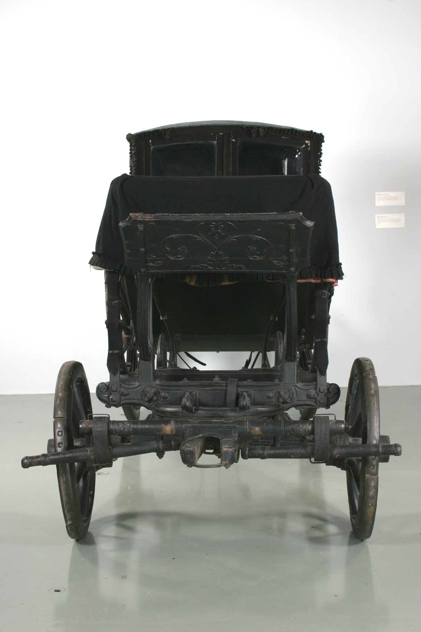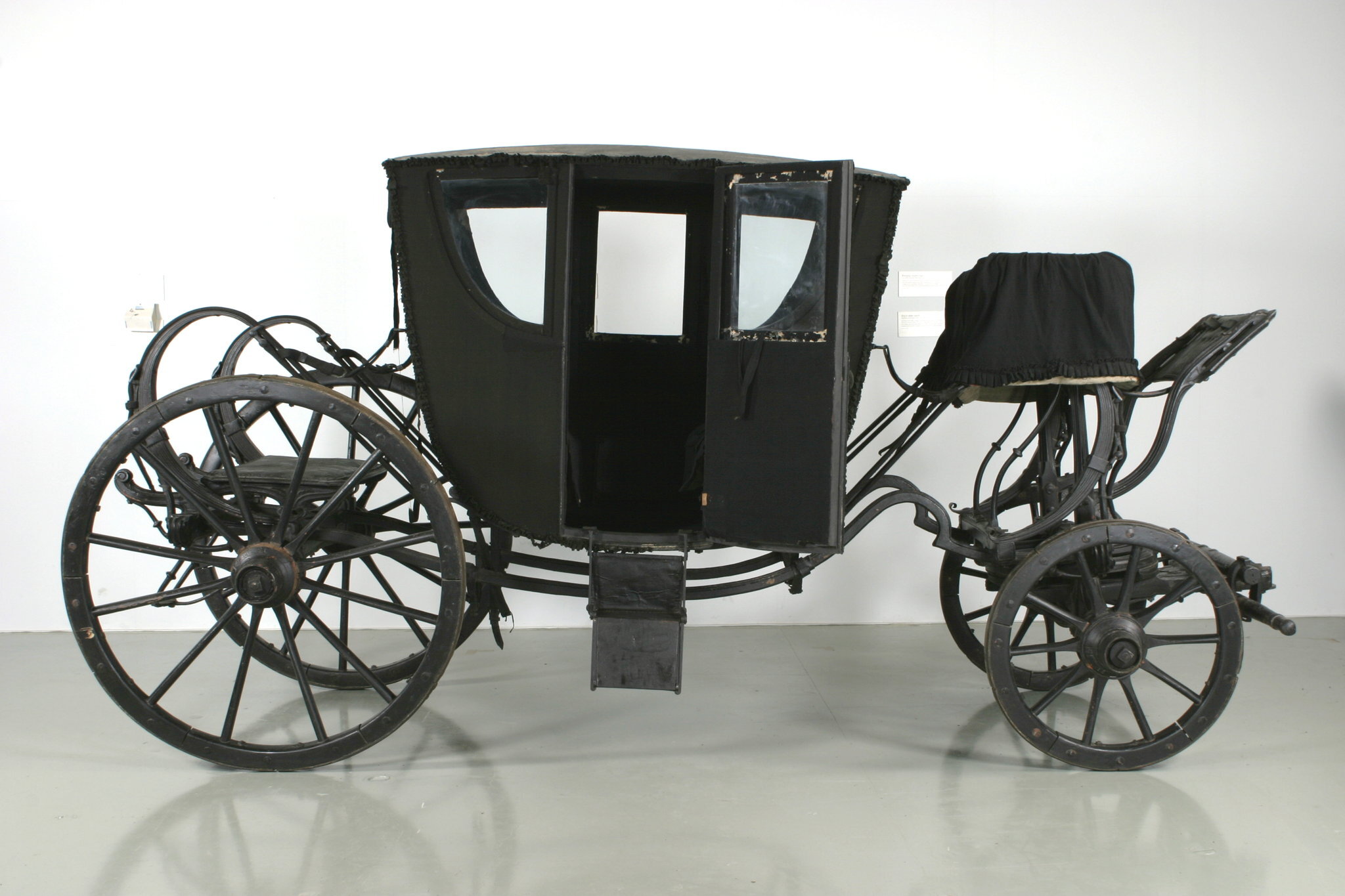 Svensk hovvagn, berlinare à bateau, s.k. sjuglasvagn överklädd med svart kläde för sorgbruk.