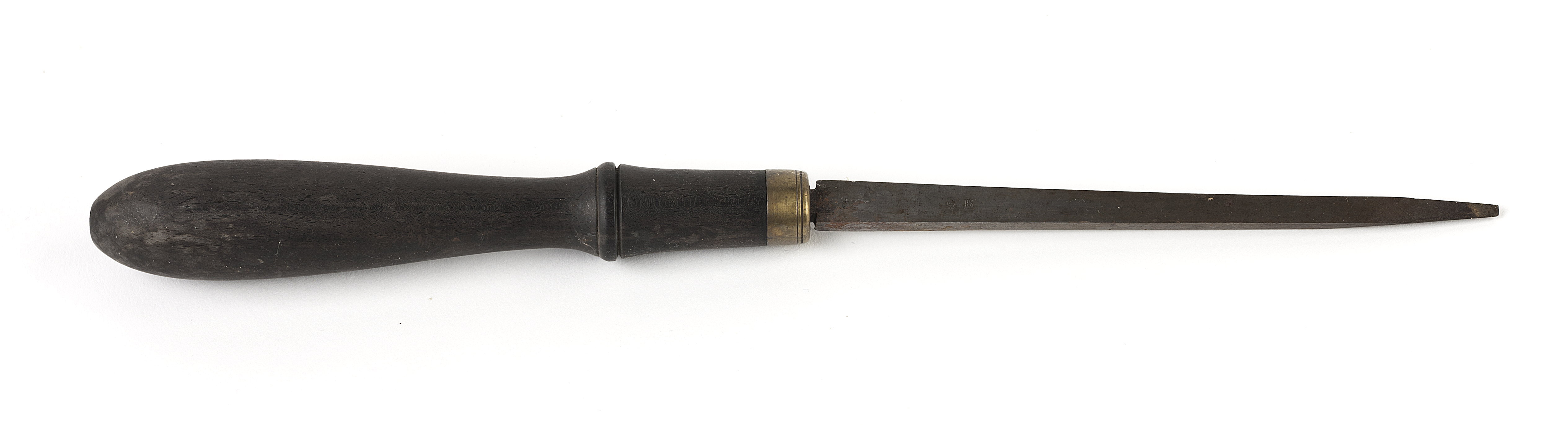 Klinga med rektangulär genomskärning. Svarvat skaft av ebenholts med en vulst. Mässingsring. Stämplat på klingan: "S B".