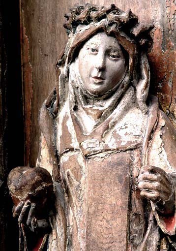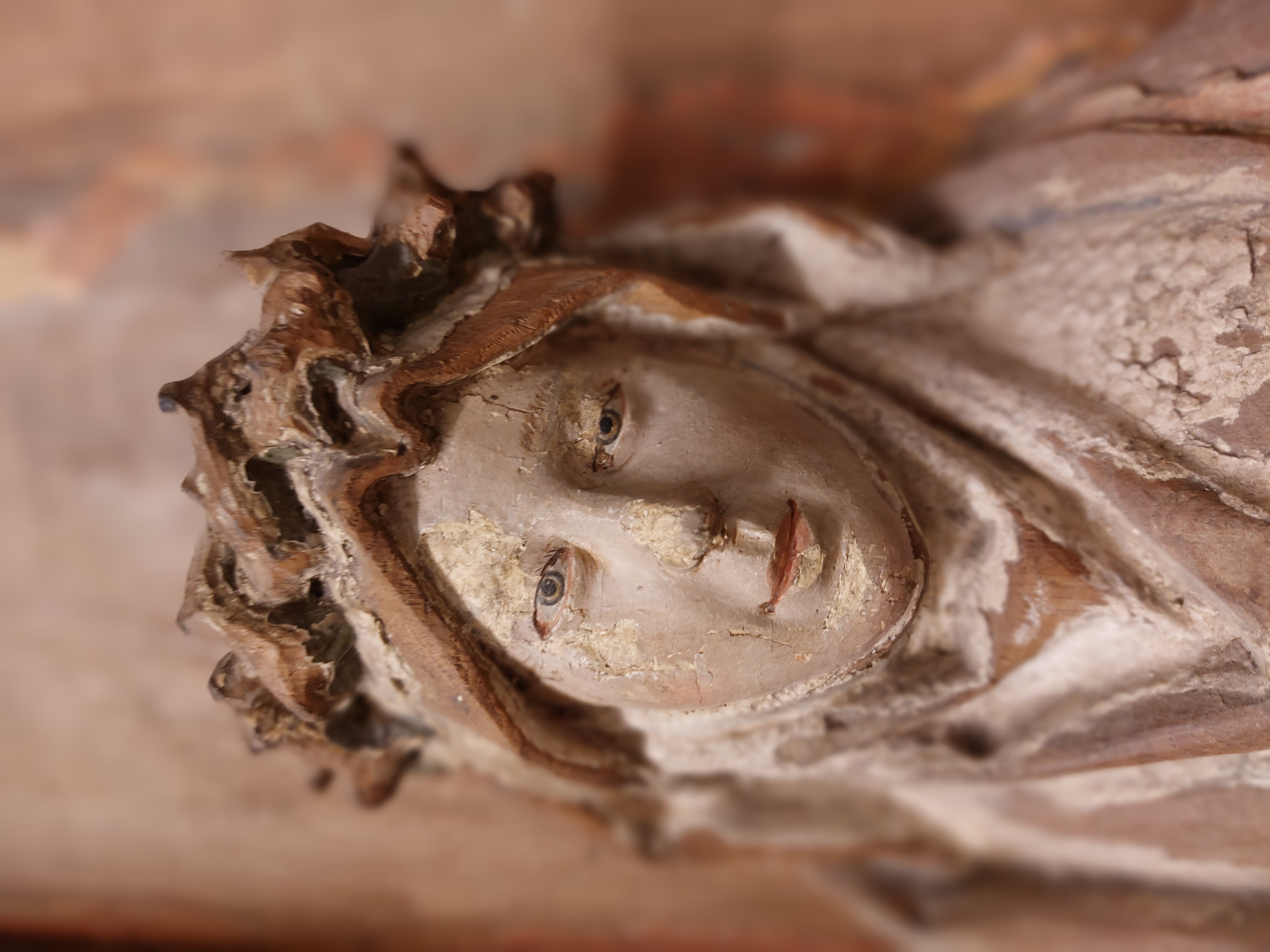Kondition: högra flygelns undre parti helt borta; bevarade gestalter har i stor utsträckning förlorat händer och attribut. Färg: skulpturens polykromi är fragmentarisk och flagnande.