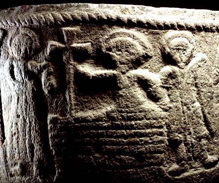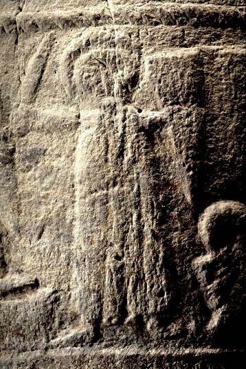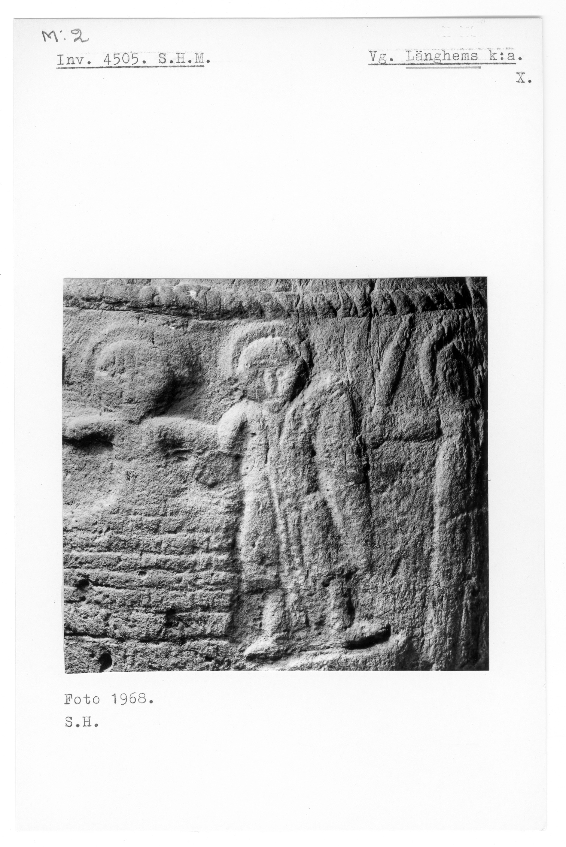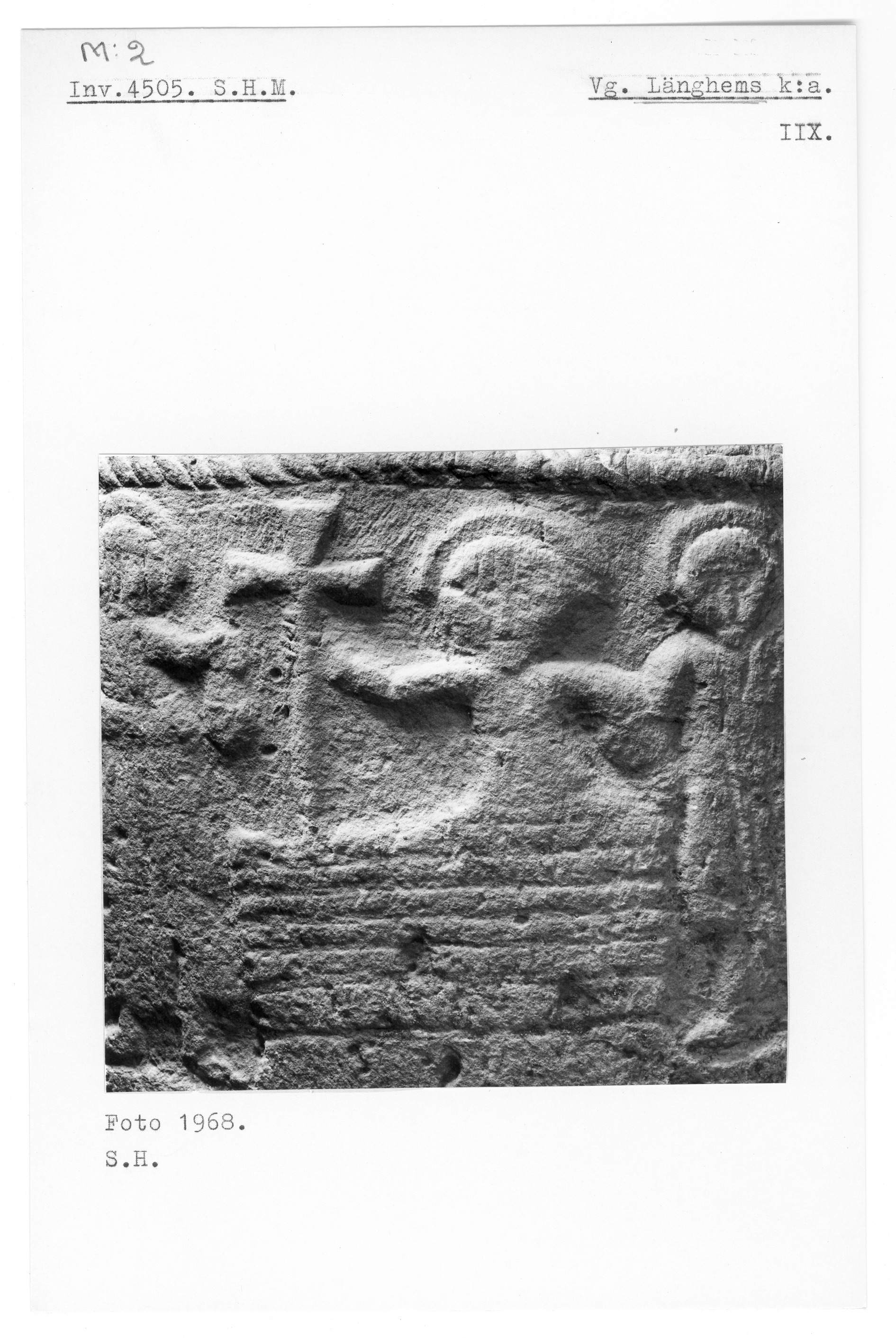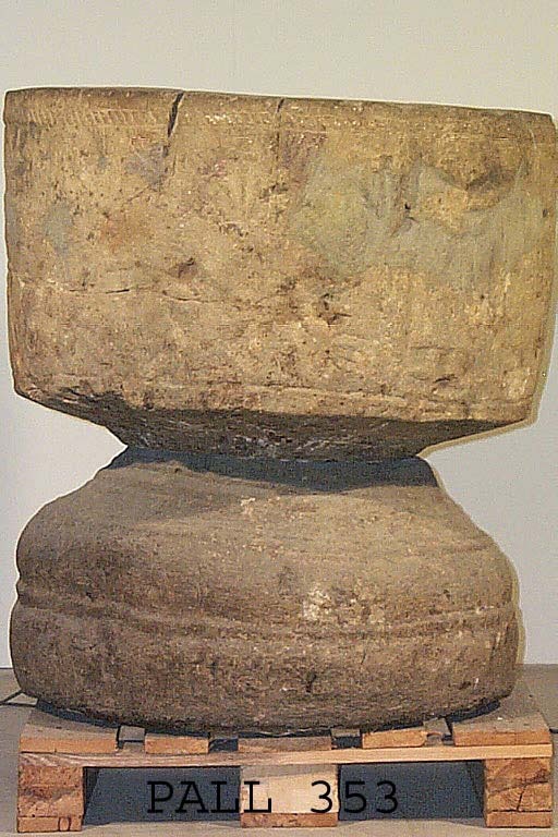 Kondition: något vittrad och med lätt sprickbildning. Färg: fragment av rödbrun färg.