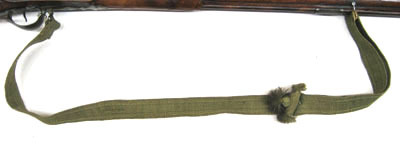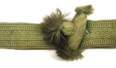 Rem av olivgrönt mönstervävt linne med raka kanter. Baktill vikt och sydd runt remöglan, framtill dragen genom öglan och fastsatt med knapp genom hål. Knappen spolformig L 48 mm, med träkärna överdragen med liknande tyg som remmen. I ändarna tofsar, mitt på tofs med kulformig bas. Vid remmens fästpunkt mot byglarna påsydd förstärkning av sämskat skinn.
