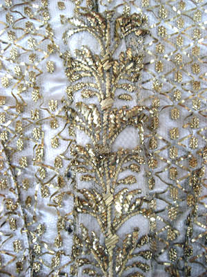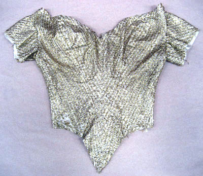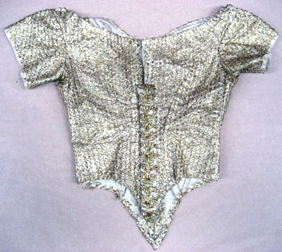Liv av vitt atlassiden. Formsytt i sex kilformade stycken med snibbspets mitt fram och bak. S-formad ringning. Korta ofållade ärmar, i dubbelt siden. Yttre lager av vit tyll, genomgående dekorerad med blank och veckad guldlan i sick-sackmönster samt prickar. På livets insida finns styvnader av valben (valfiskben), längs kanterna, på framstycket och i sidorna. Två fickor insydda i nederkanten på båda sidor, av vitt siden. Knäppning bak med 15 tränsade hål på båda sidor samt en hyska och en hake på motsvarande sidor upptill och nedtill. Utanpåliggande långsmalt stycke för att dölja knäppningen, dekorerad med växtslingor i guldlan. Bredd: 30 mm, längd: 260 mm. Två tvinnade, benvita silkessnoddar i nederkanten, en på var sida, 120 mm från mittsömmen fram. Dragsko i linningen med vitt sidenband, bredd: 13 mm.
