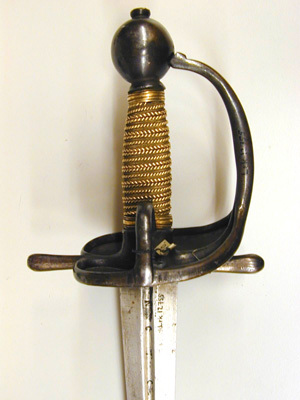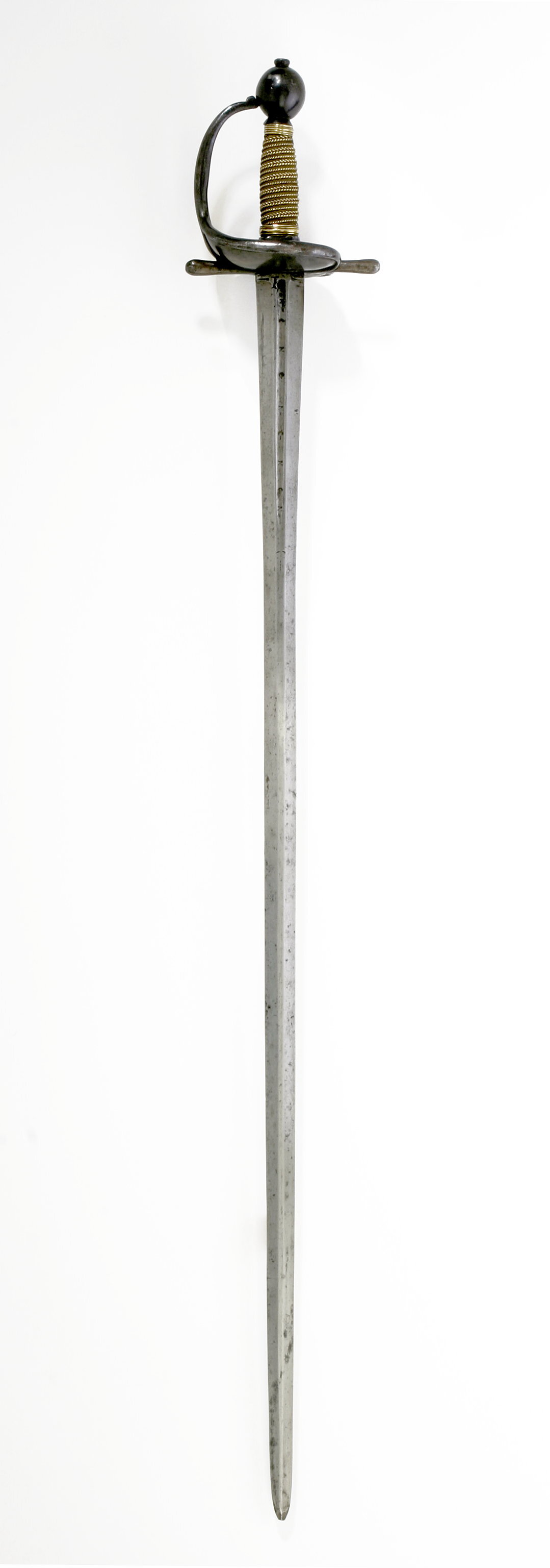 Modellenlig. Kavellindningen ersatt 1699 med förgylld mässingstråd och kransarna med ringar. Baktill på insidan av inre parerplåten punsat: "N 2".