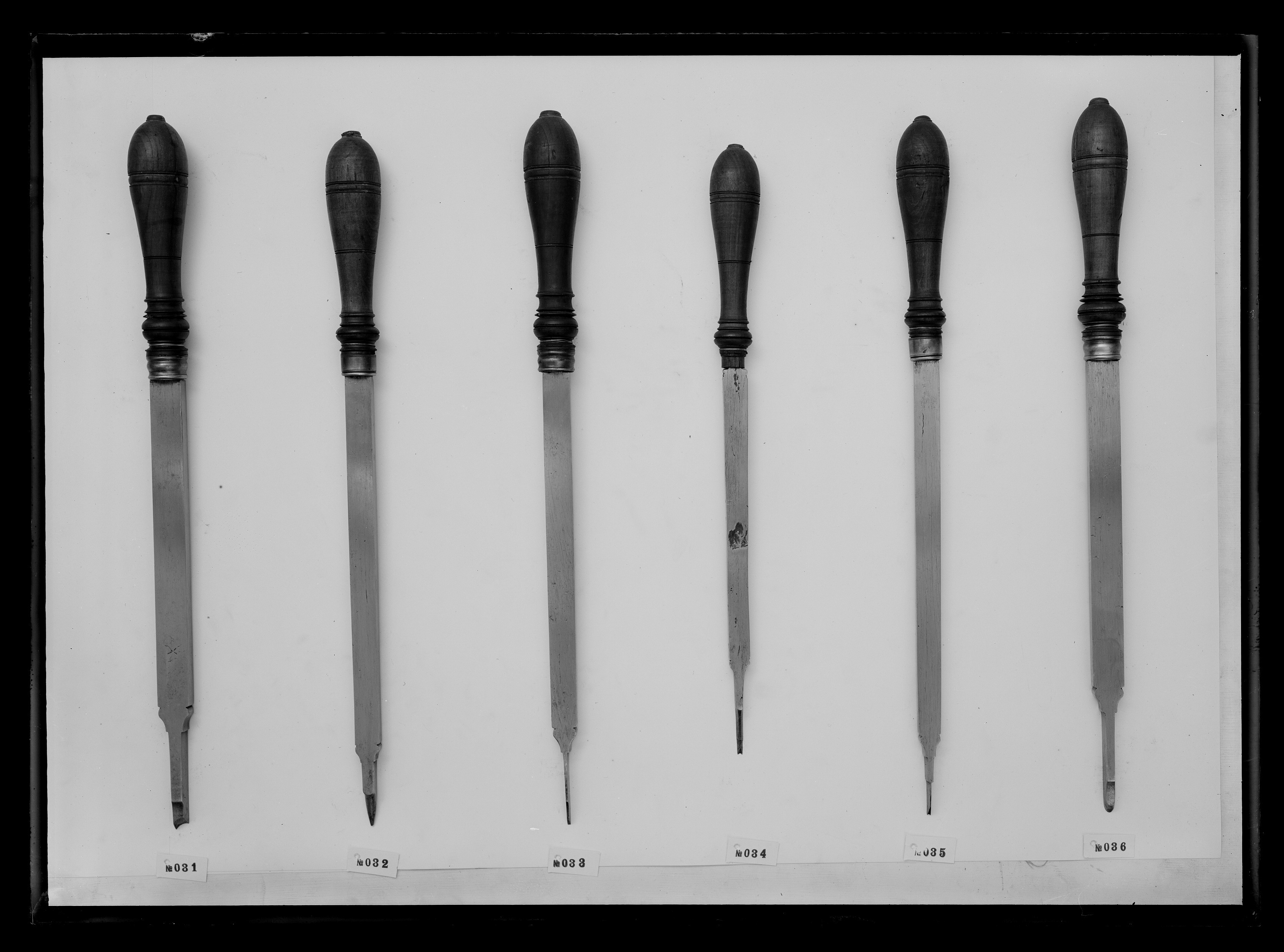 Profilstål med bågformig, konkav, snedställd egg framtill och rak egg på sidorna. Övergången mellan klinga och stål har på båda sidor kornischformig kontur. Klinga med rektangulärt tvärsnitt. Svarvat, profilerat kägelformigt skaft, dekorerat med svarvade ringar och vid fästet en rad vulster. Skaftet avslutas med en flat knopp. Fästet är skott med en profilerad mässingsring. Mått: L: 436 mm, skaftl: 158 mm, största diam: 33,7 mm, eggb: 8,2 mm Stämpel: IK under krona samt 2,5 mm däröver P, proberstämpel?