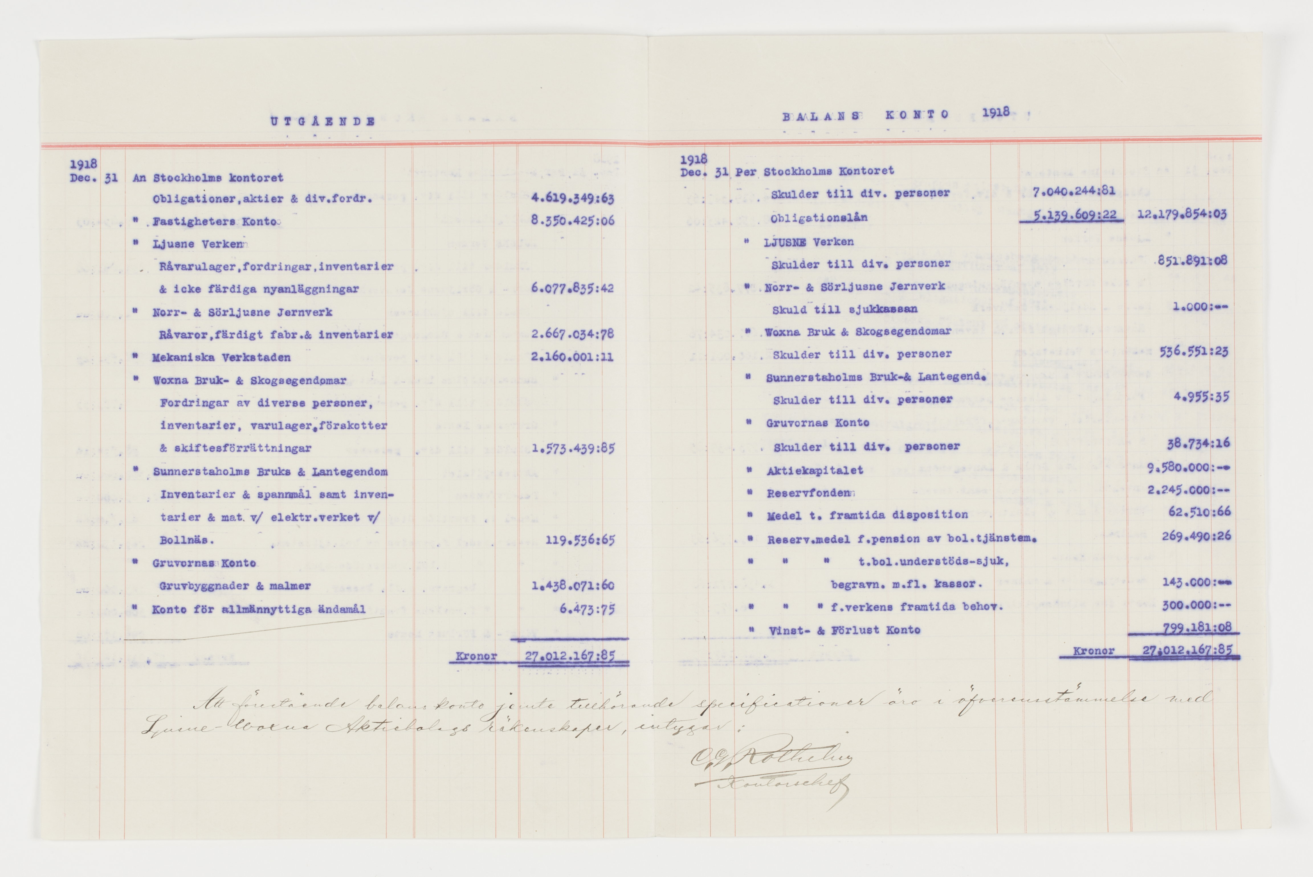 Utgående balanskonto, Ljusne-Woxna AB 1918.