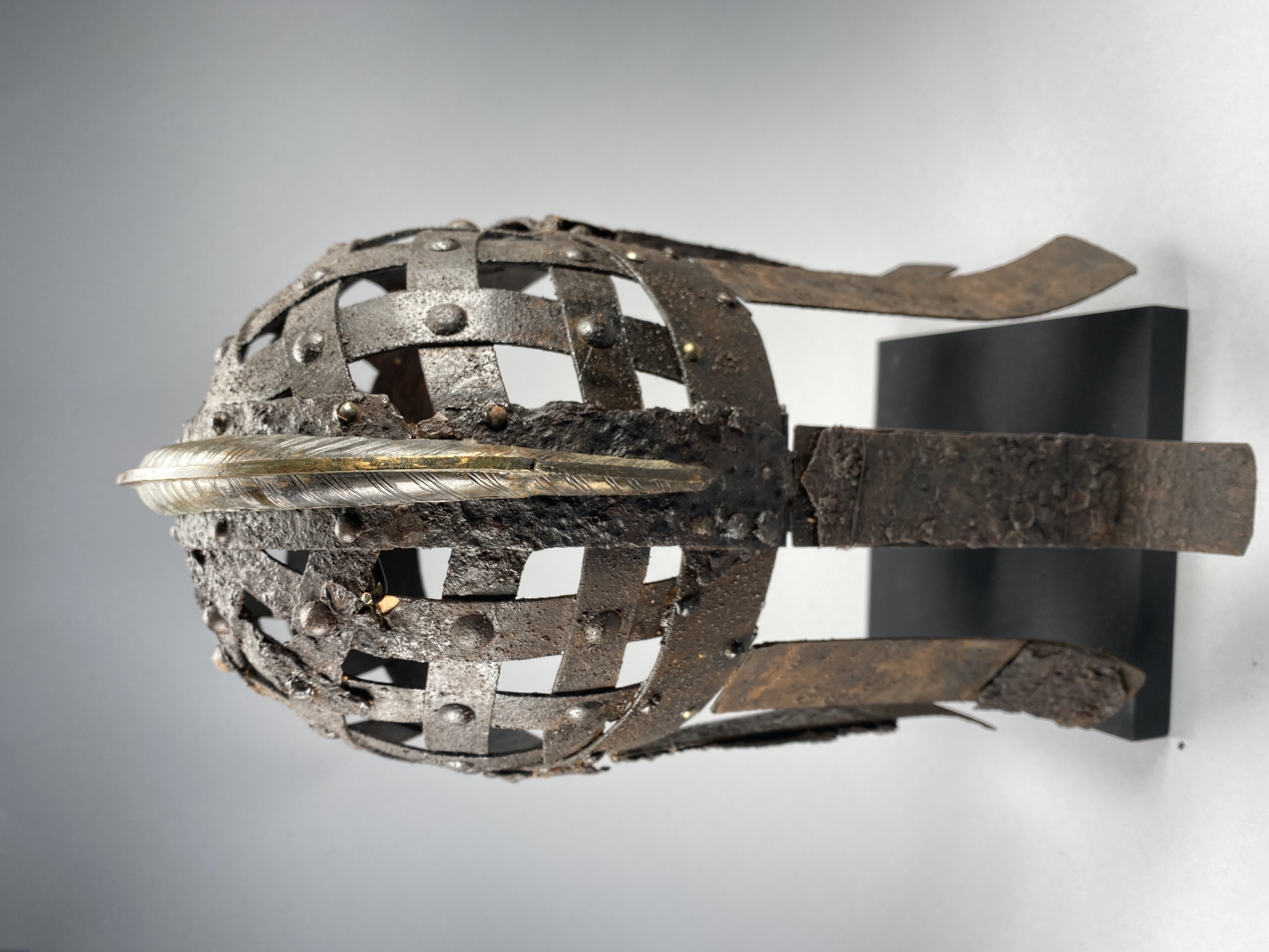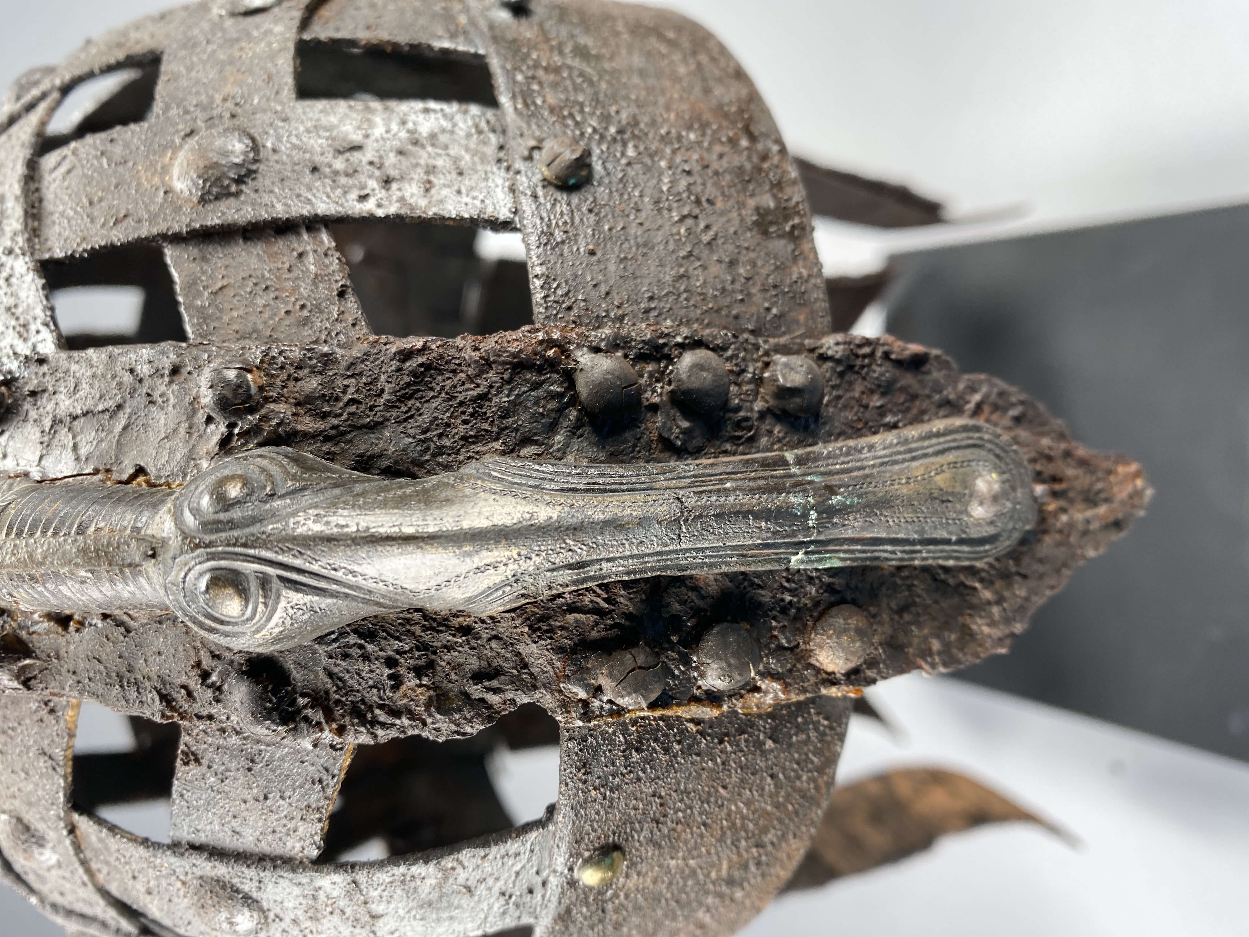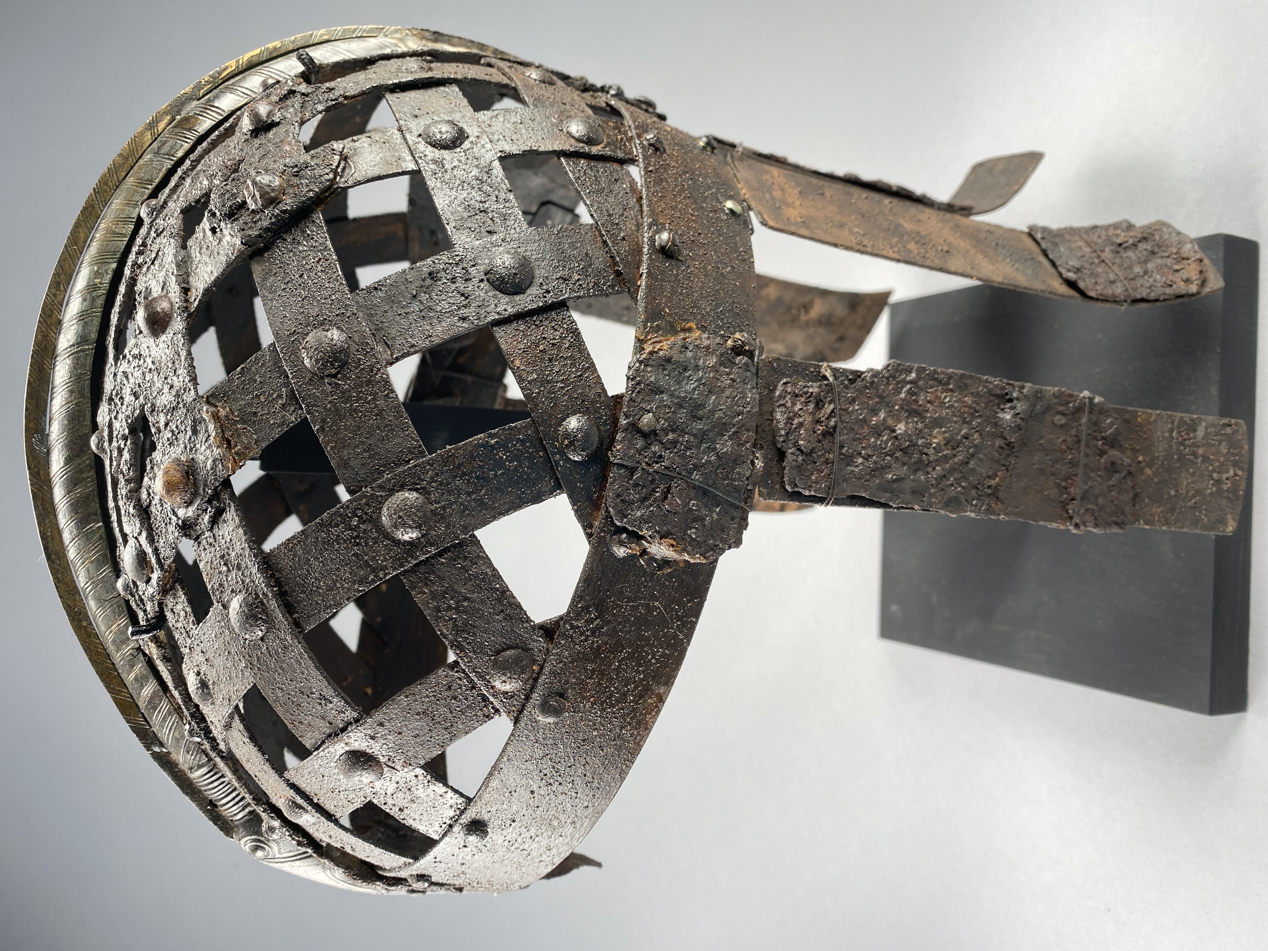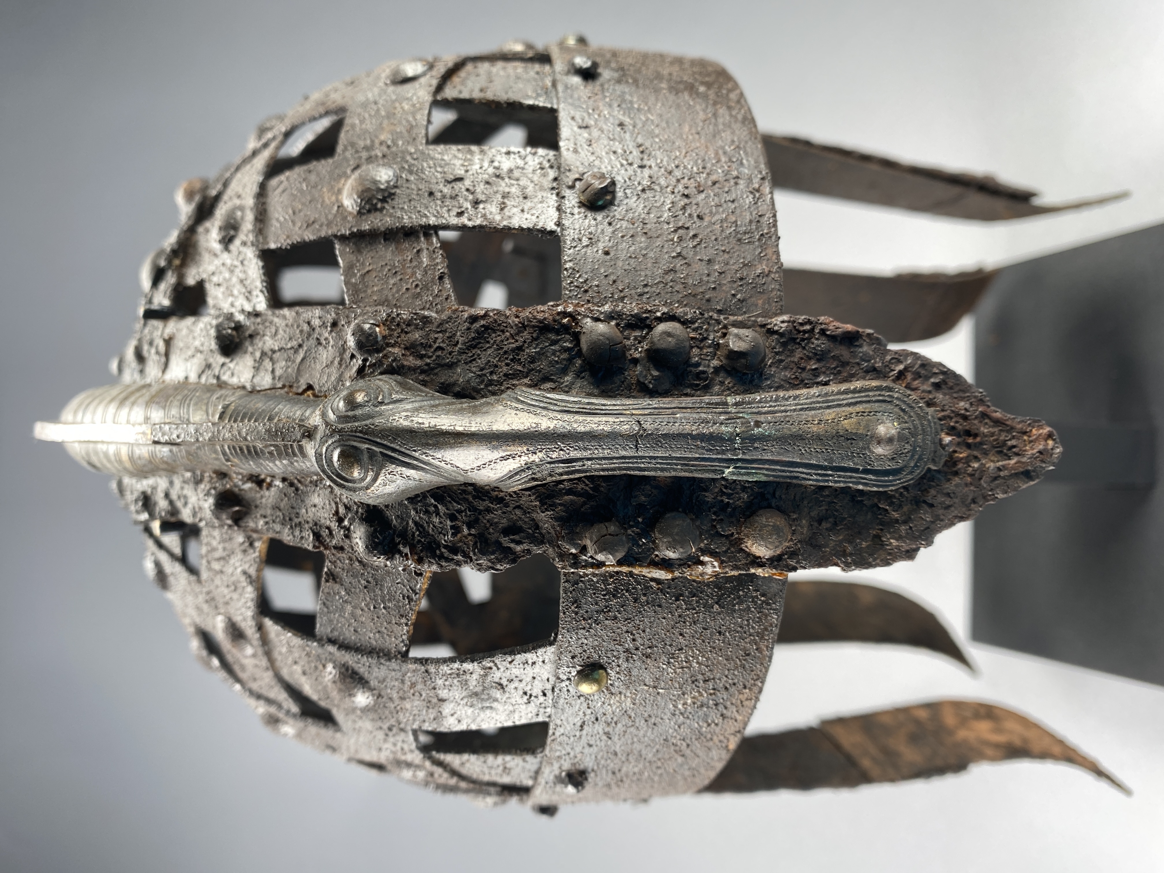 Delvis rekonstruerad hjälm med kam. I nuläget monterad. Finns lösa fragment som ej ingått i rekontruktionen. Hjälmen är till stor del rekonstruerad.