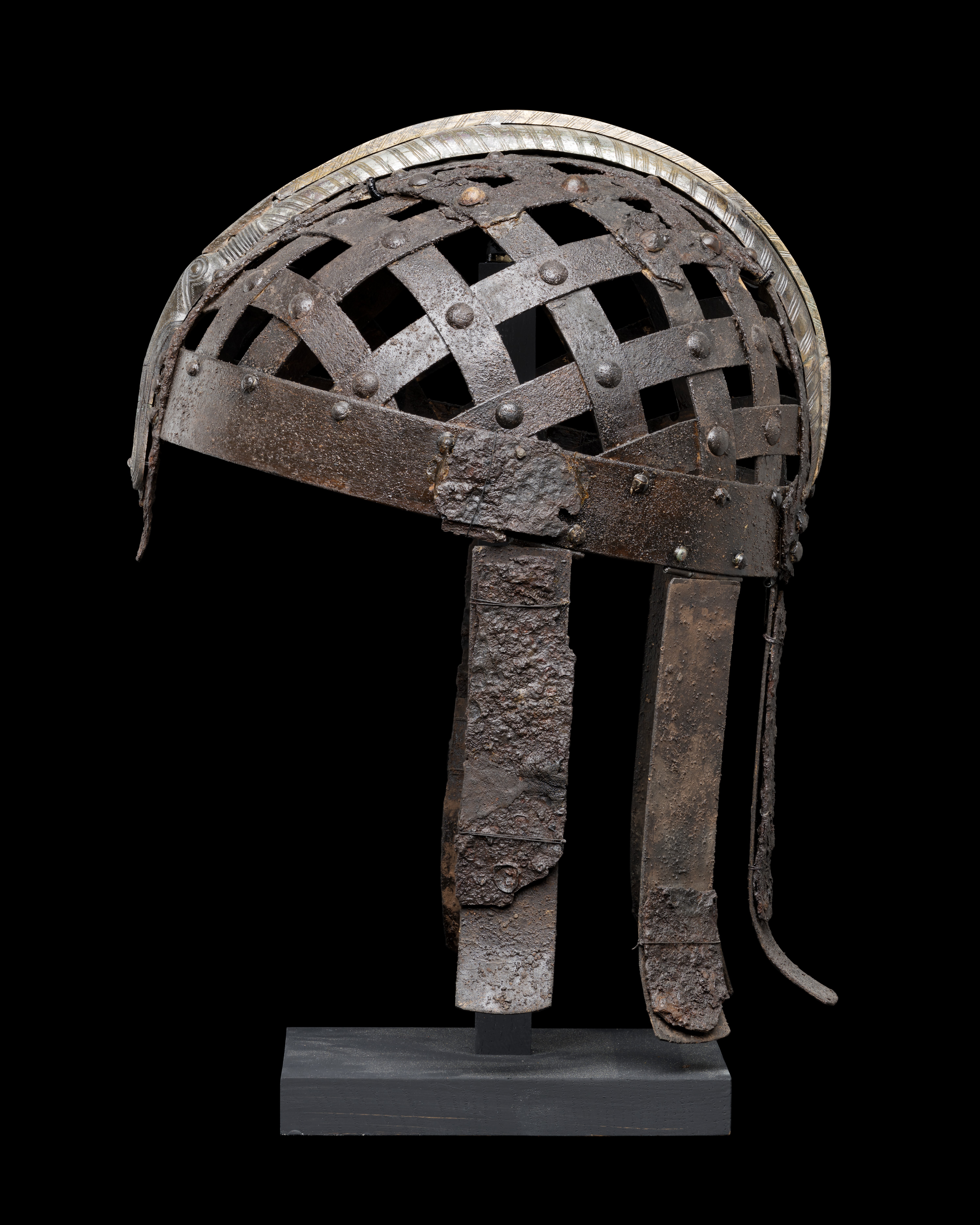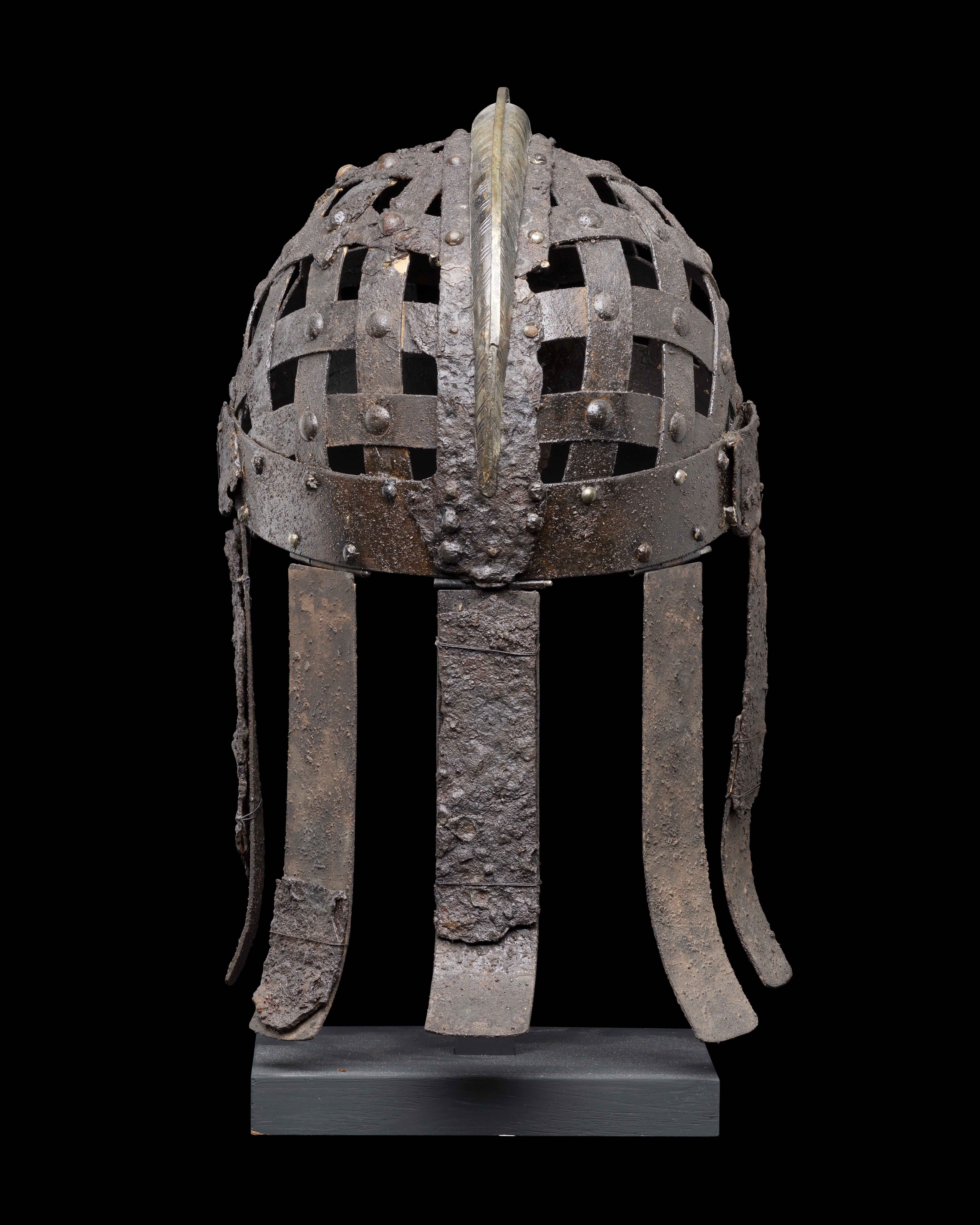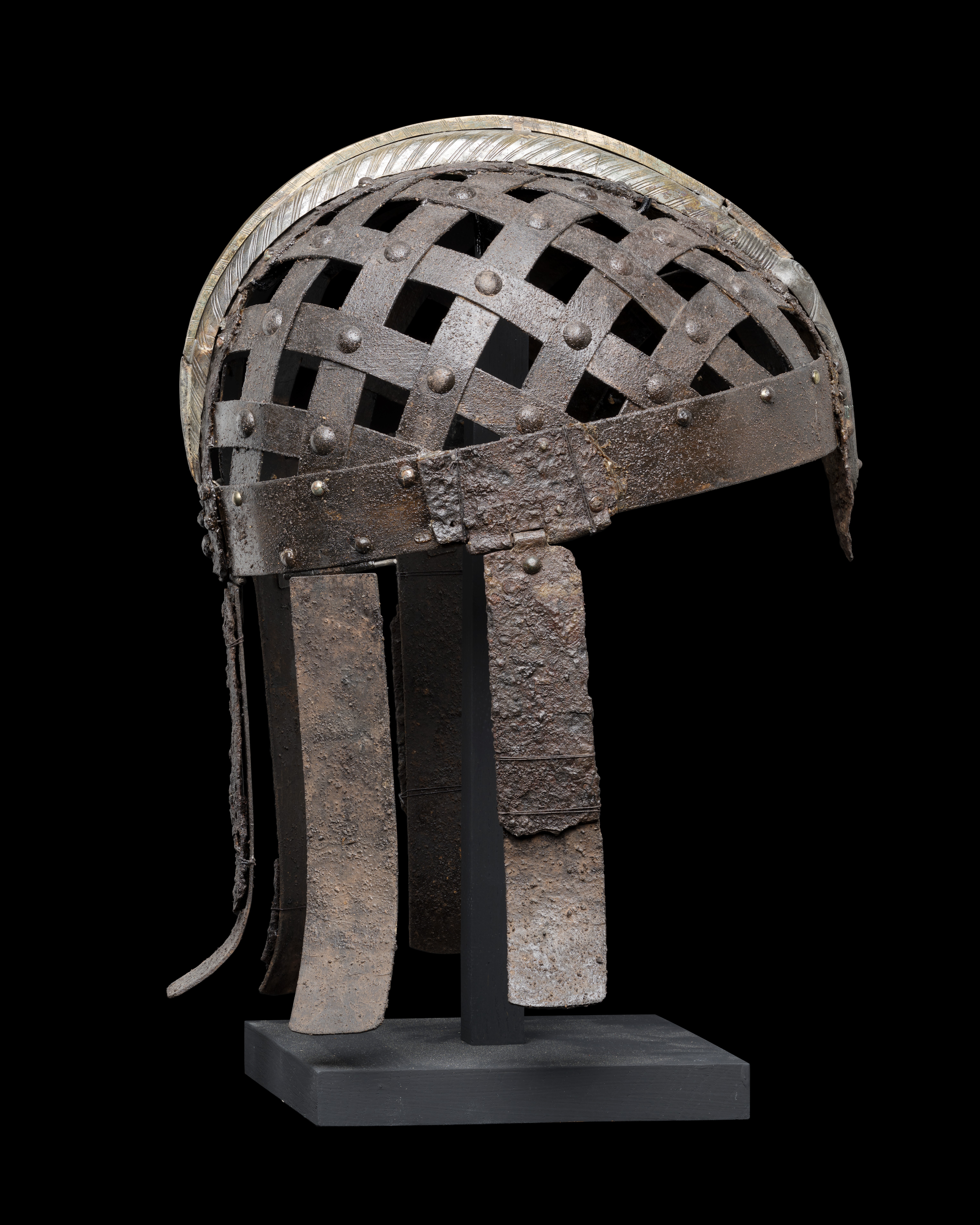 Delvis rekonstruerad hjälm med kam. I nuläget monterad. Finns lösa fragment som ej ingått i rekontruktionen. Hjälmen är till stor del rekonstruerad.