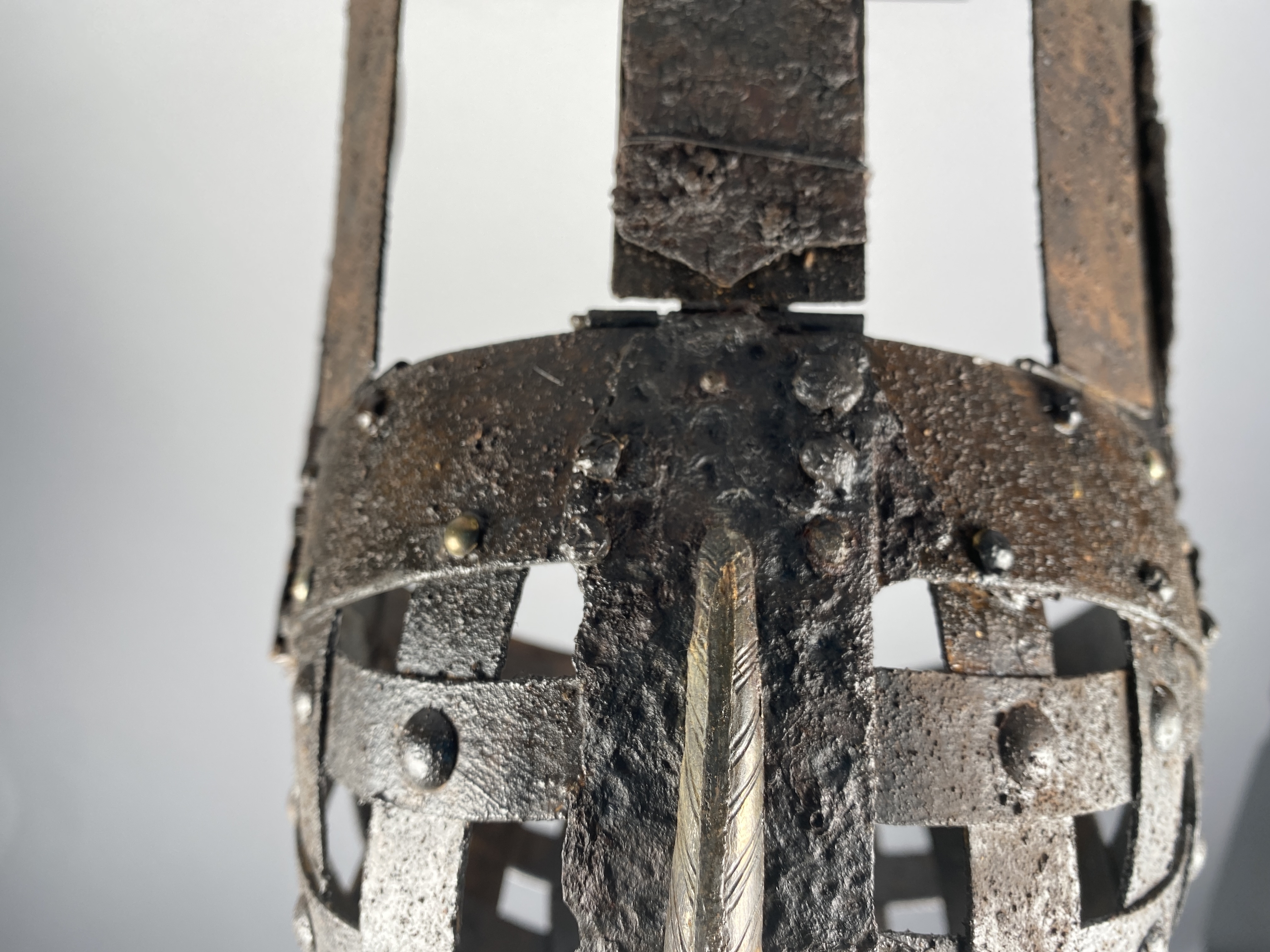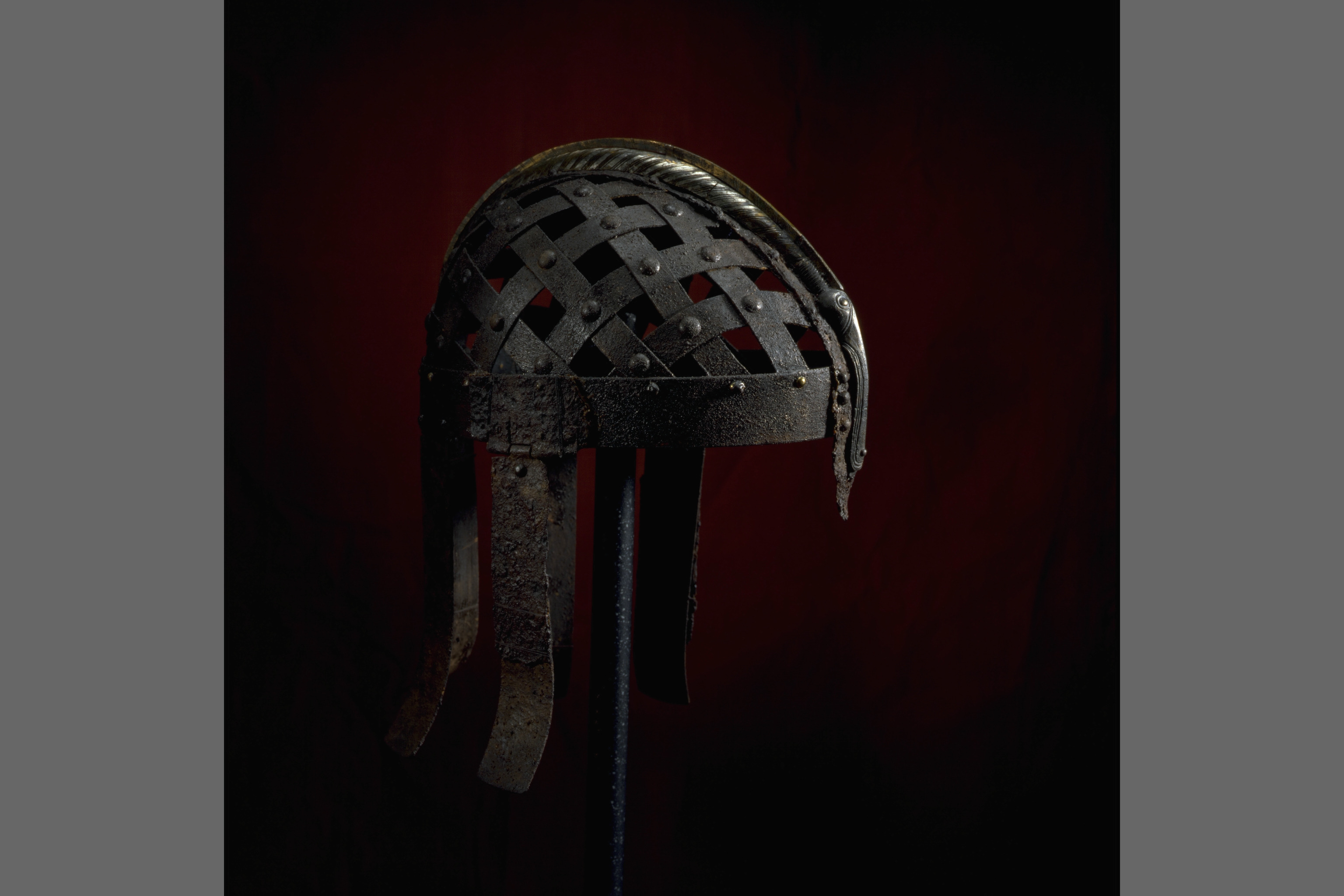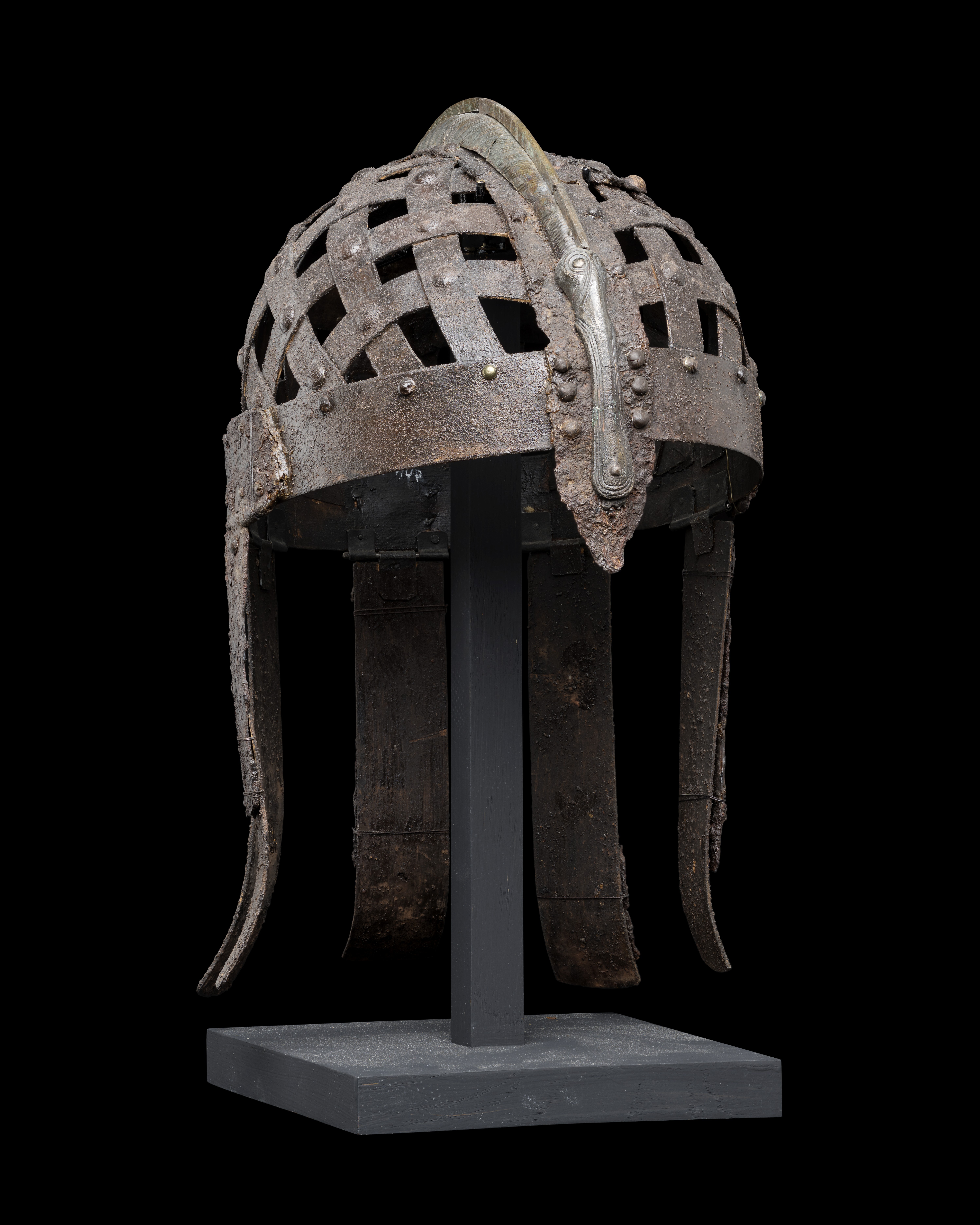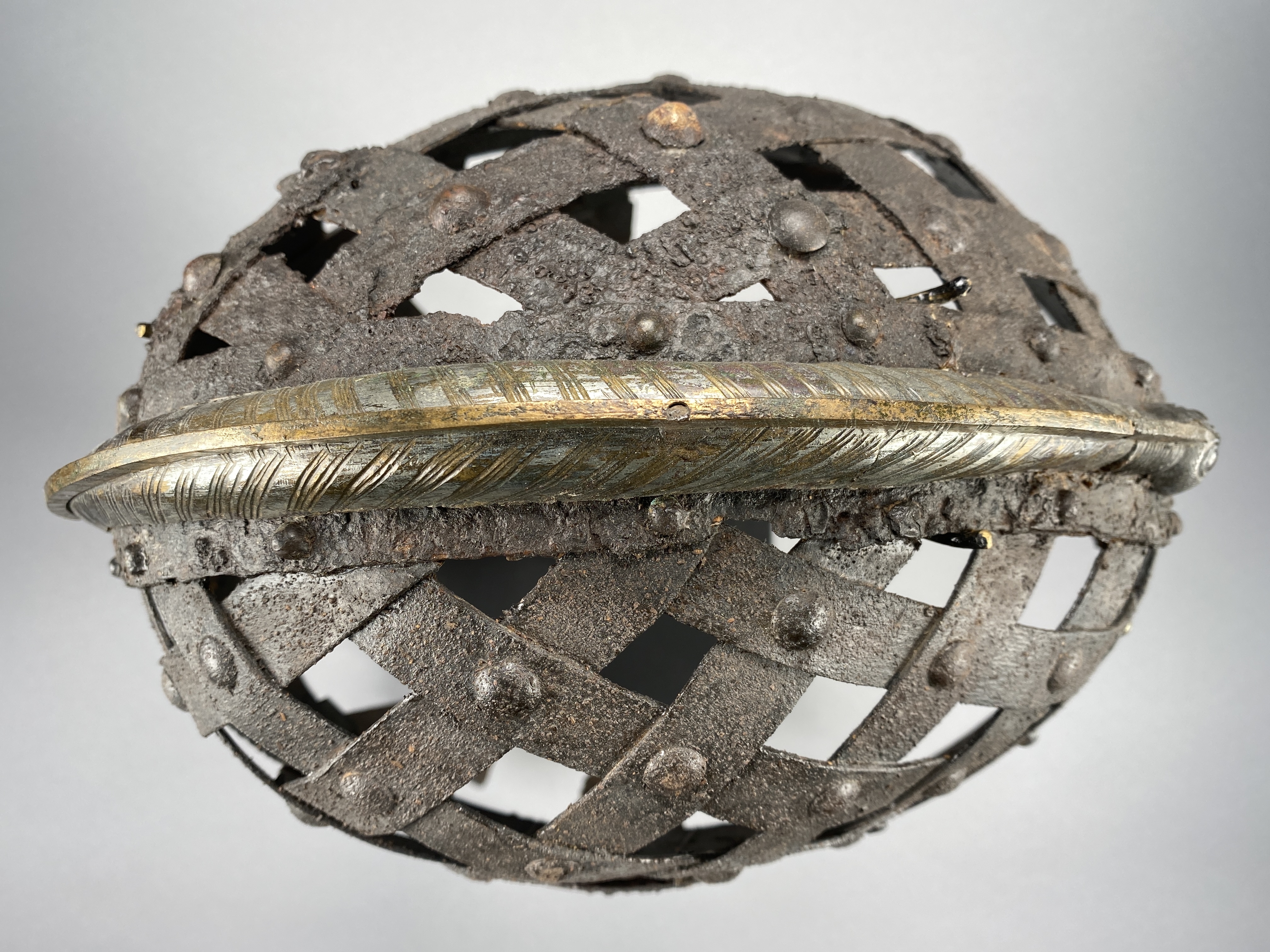 Delvis rekonstruerad hjälm med kam. I nuläget monterad. Finns lösa fragment som ej ingått i rekontruktionen. Hjälmen är till stor del rekonstruerad.