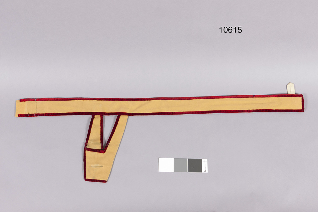 Livgehäng av ljust gulbrunt ylle(kläde), v-formig koppelhylsa. Fästning invändigt med slejf av fodertyget samt rektangulärt spänne av gul metall, två klor, utvändigt med två hakar i ena änden samt sju (ursprungligen åtta) silkeshyskor. Mittfram klädeshälla, b: 50 mm. Inkantning på bältet, slån och koppelhyskan med karminröd sammet. Foder av vit satäng.