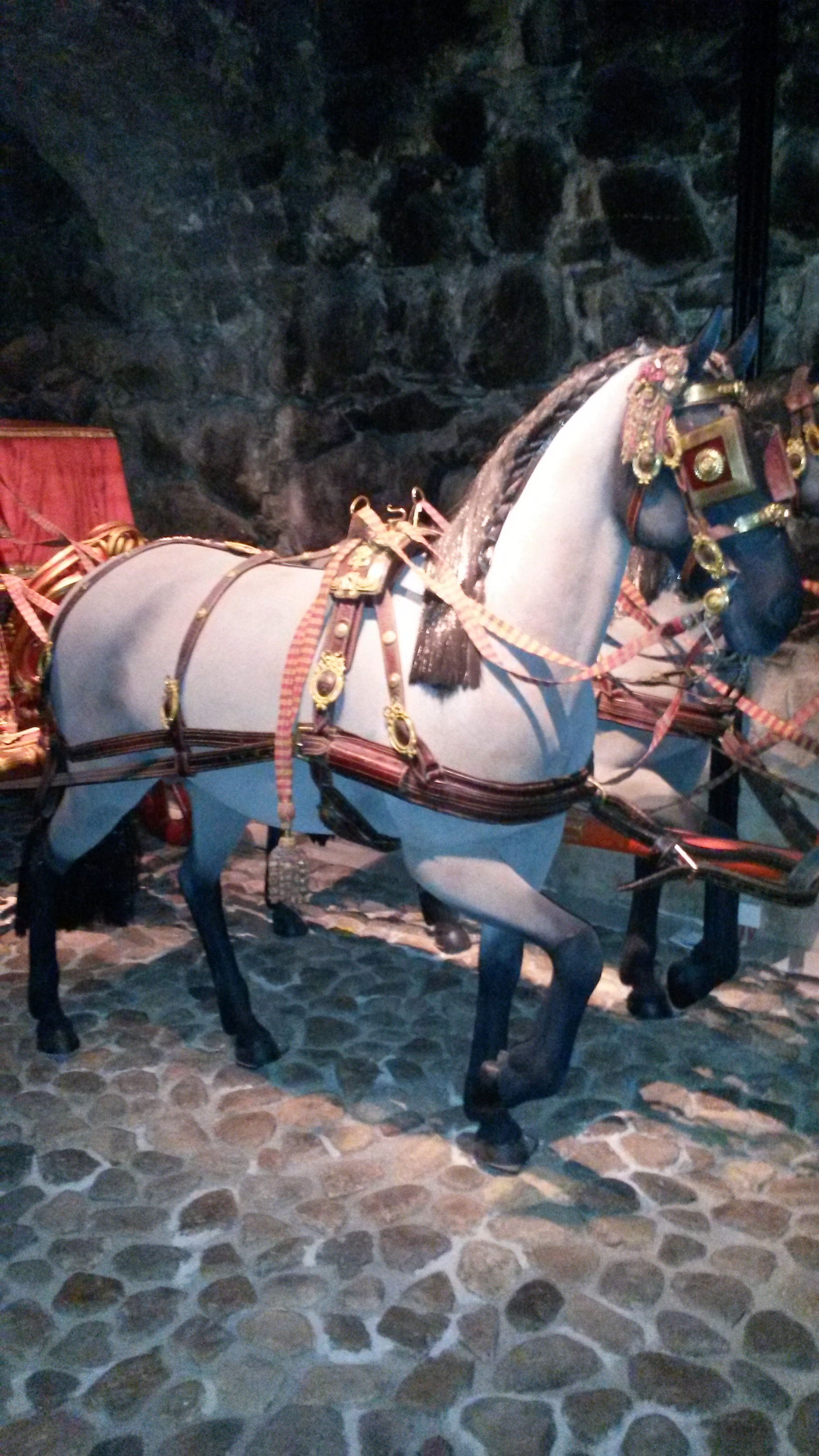 Seltyg av mörkrött läder. Brösta, br: 110 mm med stångkoppsring, läderstropp på var sida och i ändarna trapetsformade, förgyllda mässingssöljor i vilka draglinor, bukgjord, deckel och mankrem är fästade. Mankremmen är snedställd och går från deckel till brösta, spännes med oval, förgylld mässingssölja med rosett, bladdekor och pärlstav. På höger sida finns på mankremmen två runda, förgyllda mässingsbeslag med en mittblomma i ring och kantad av pärlstav. På vänster sida endast ett beslag enligt ovan (ett saknas), rembredd 40 mm. Deckeln, br: 510 mm, l: 175 mm av mörkrött läder. Ram av slät, förgylld mässing med förgyllda beslag: rosetter, bladdekor, repstavar. Två ovala tömlöpare och en deckelkrok av förgylld mässing. Tömlöparna står på deckelbeslag i form av lejonmaskaroner med plymer och med i munnen hängande franstygskringla, allt i förgylld mässing. Deckelkrok monterad på runt, strålformigt beslag. Bossa av ljusrött läder. Deckelgjord, br: 90-38 mm, med slät rektangulär, förgylld sölja. Bukgjord, br: 58 mm, med slät rektangulär, förgylld sölja. Främre bärrem rörlig med nedtill två öglor, felaktigt fäst på det bakre ryggtycket. På remmen fem runda beslag och två ovala söljor.Rosettdekoren skadad på högersidans sölja, vänstersidans sölja monterad upp och ner. Bakre stödrem fastsydd vid ryggstyckets runda beslag och med en oval sölja vid hindertyget, dekorerad med fyra runda beslag. Hindertyg med två stroppar för draglinor. Ryggstycke med en oval sölja, tre runda beslag och ett förgyllt mässingsbeslag utformat som en rund ram med rosett, bladdekor och repstavar. Innanför ramen är en fyrklöver fastnitad på ryggstyckets läder. Svansremmen har två mindre ovala söljor. Draglinor, l: 2000 mm, br: 50 mm, med välvd bygel för fäste vid svänglar.