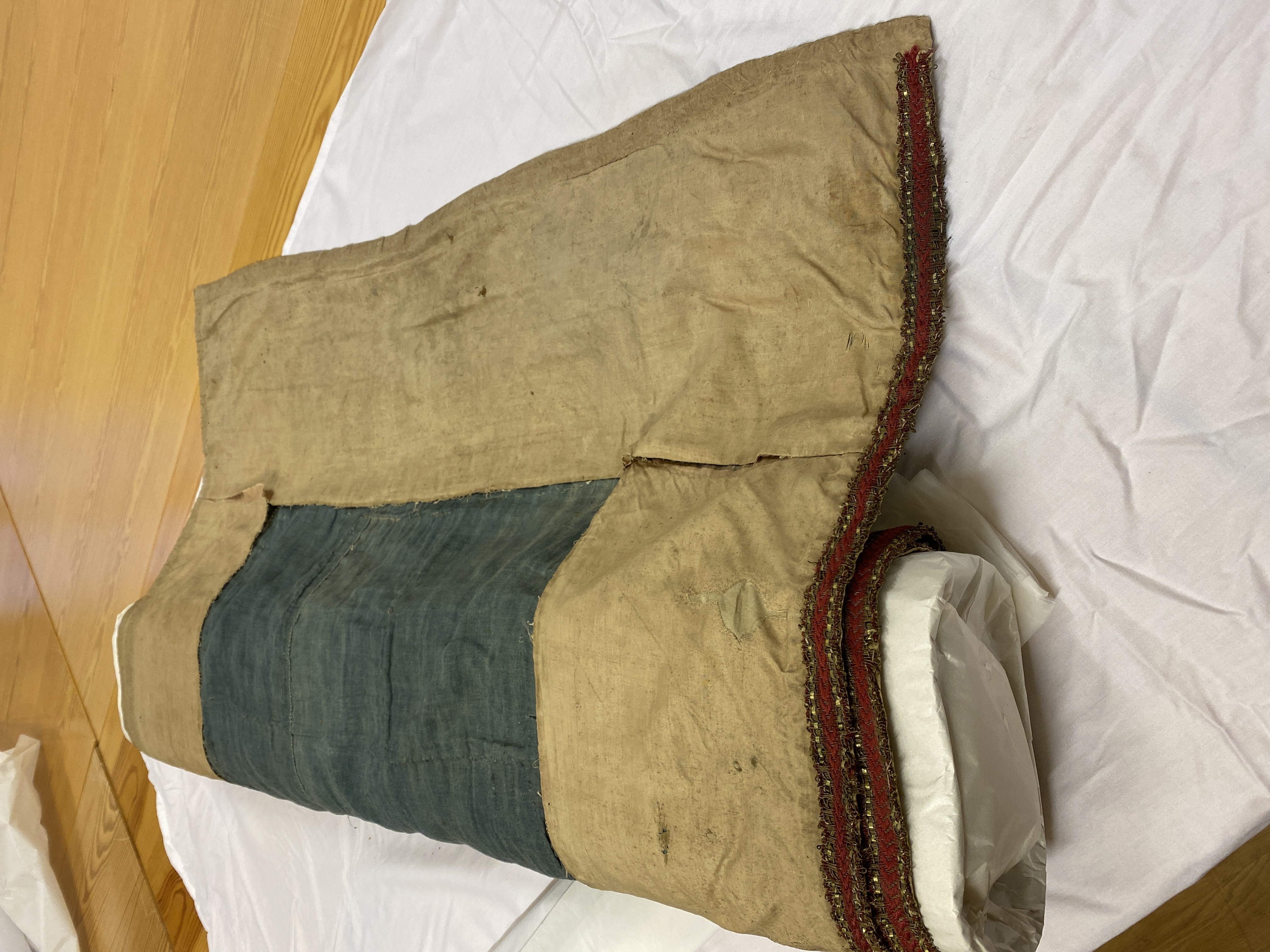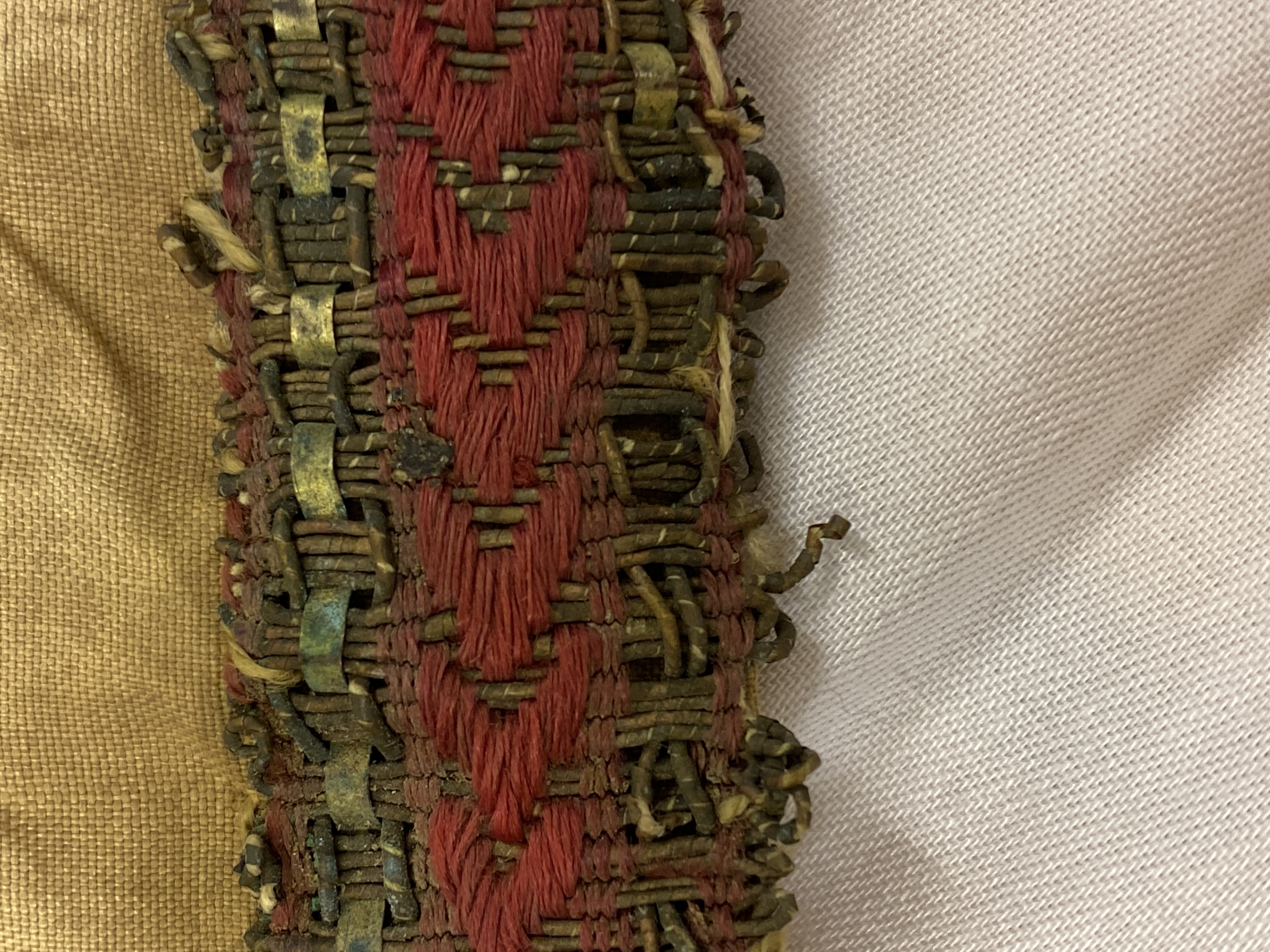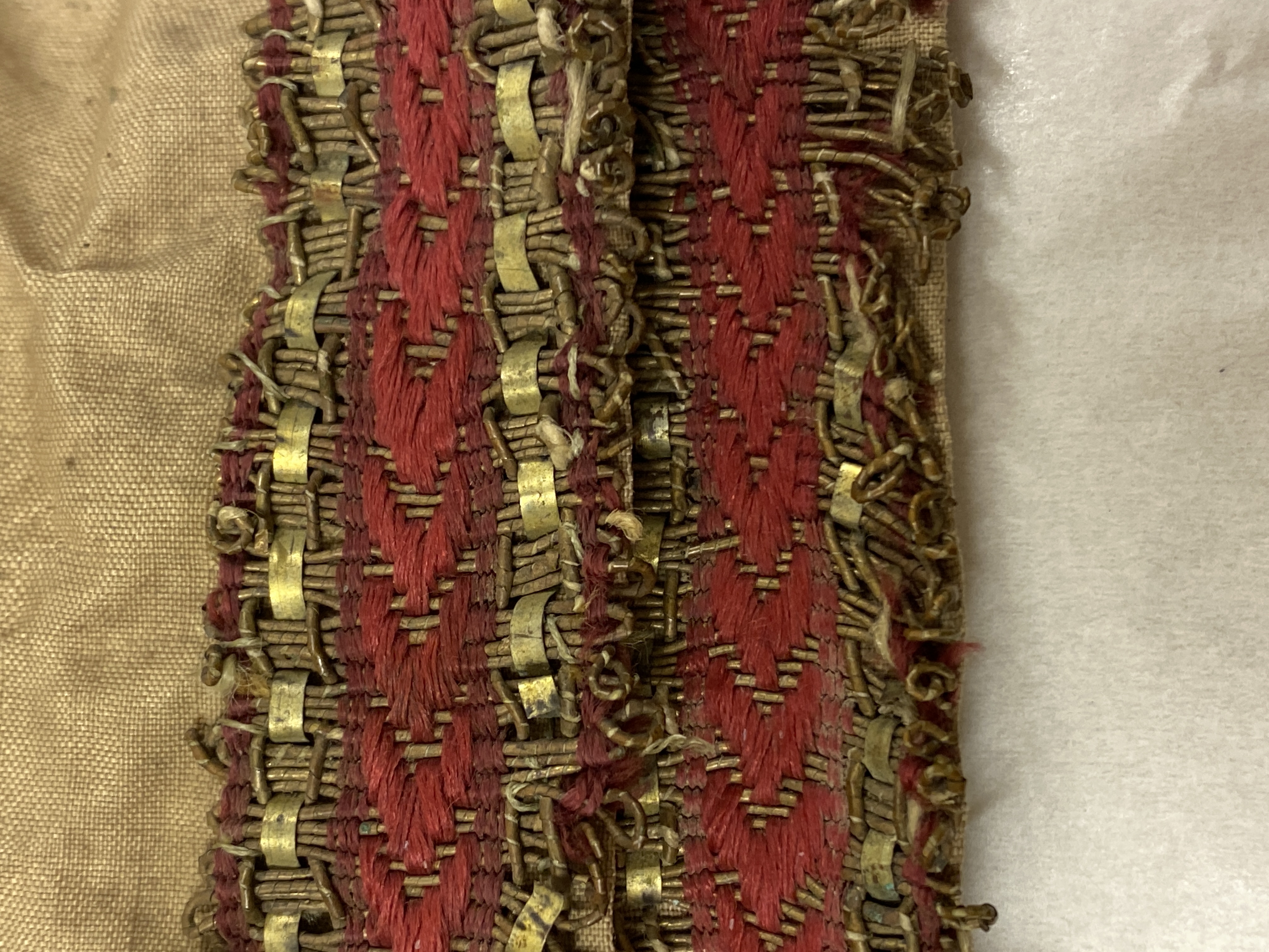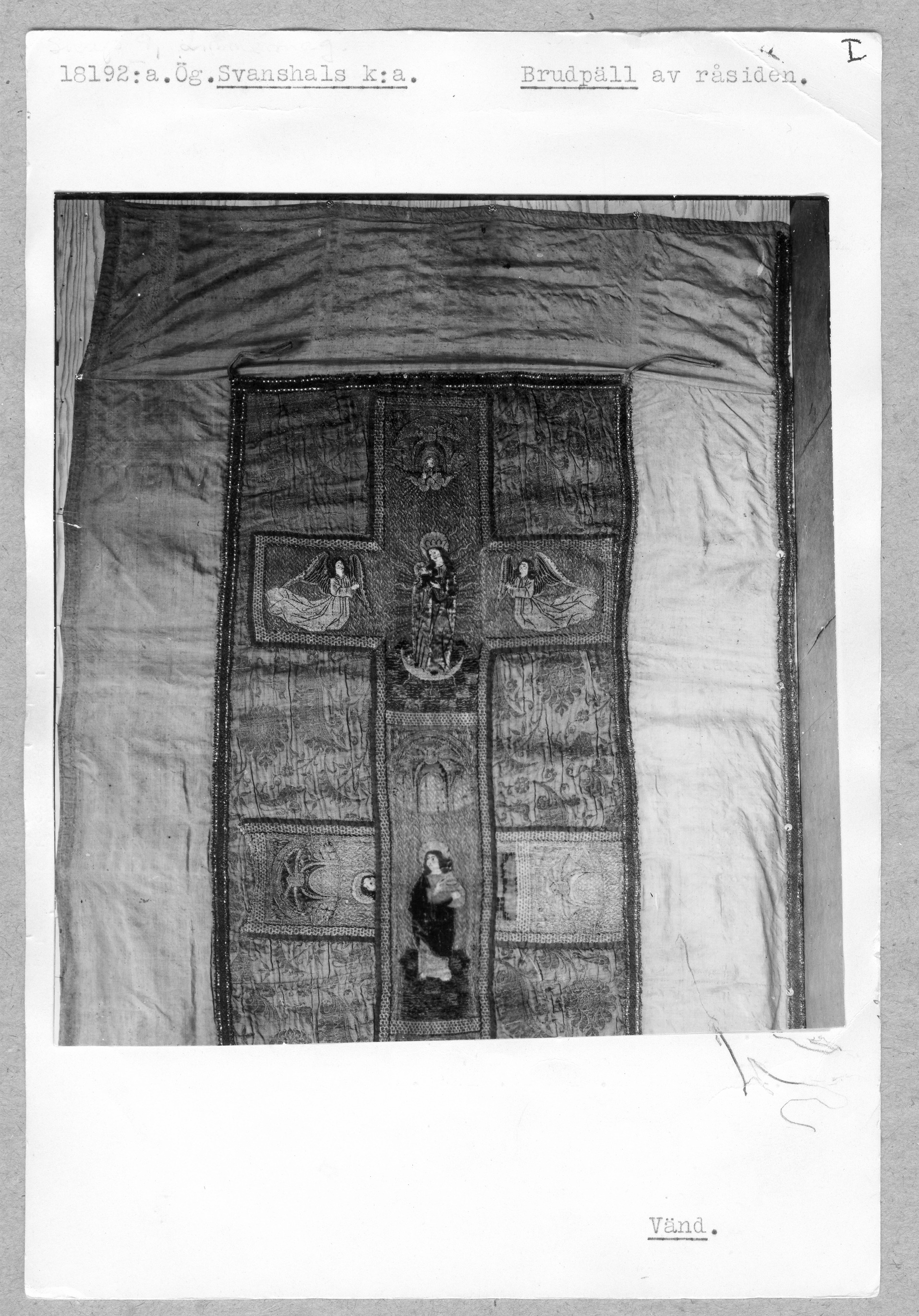 Mittspegel av guldbrokad med fåglar, leoparder, palmettornament, Italien. Runt om bleknad taft, färg?. Lossade figurbroderier, se inv nr 18192. Deponerad 1926.