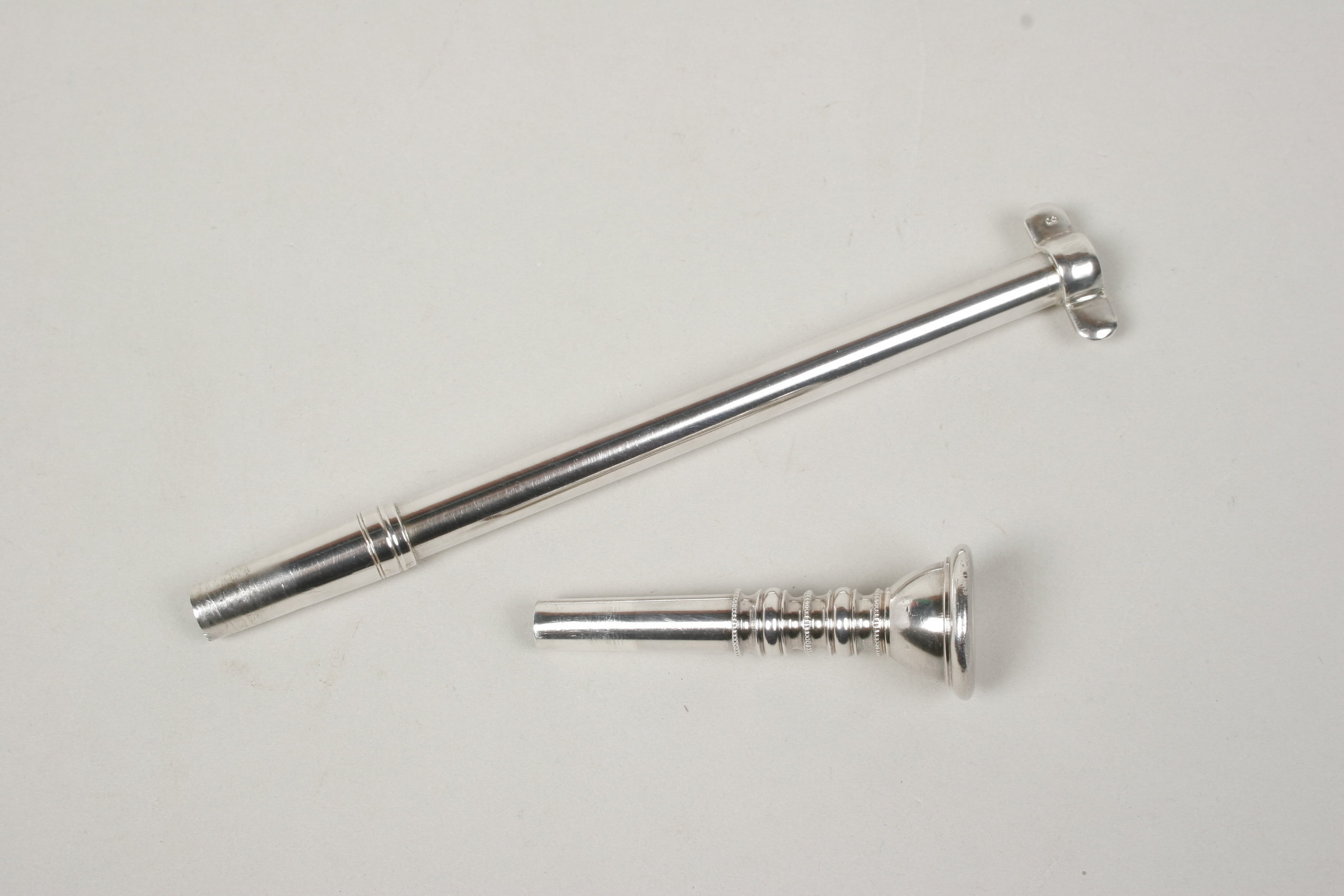 Naturtrumpet av silver med rak söm, sammansatt av klockstycke, tre raka rör, två krumbyglar, två mellanstycken varav ett lagt i ögla, samt munstycke. Klocktycke med på utsidan räfflad kantring, mitt på klockstyckets utsida en vågformig kantlinje. Mellan denna och kantringen pålagt förgyllda silverkronor i relief, tre öppna, två och en samt en kunglig krona. På klockstyckets insida kontroll- och silverstämplar: S:t Erik, tre kronor, blomma samt P.A.H i rektangel. Otydliga, ristade namn: J 0 B' (?) samt P. Mede 1800 (?) samt Israel Örnberg. K1.7 två hål och därigenom draget tråd för fästning av bågstycke. Över skarvarna mellan rör och bågstycken trätt silverhylsor med två ringar med bladdekor, ena änden konturerad i bågar. Mellan ringarna graverad dekor av bågar och blad. På rörstycket närmast klockstycket ca 310 från mynningen en vulst med snedställd, skålad godronnering. Invändigt på båda bågstyckena ringar. Mellan första och sista rörstycket bakom vulsten en stödplatta av trä och däromkring lindat banderollens snodd. Munstycket och de två mellanstyckena l: tillsammans 341 mm. Munstycke med dubbelt balusterformigt skaft, tre räfflad ringar, stämplat nr 3. Munstyckets l: 78 mm. Första mellanstycket l: 173 mm, baktill försedd med ring med två vingar, på den ena stämplat: 3. Främre mellanstycket lagt i ögla, på den bakre flänsen kontroll-stämplar: tre kronor och månskära. På båda ristat A D (?), ligatur. Hovets silvertrumpeter som förvaras på Livrustkammaren kan tillskrivas Carl Lilja eller Casper Christian Liendenberg, mer sannolikt den senare. Liendenberg har år 1747, enligt Riksmarskalksämbetets handlingar från 1749, levererat och slutgiltigt fått betalt för tolv silvertrumpeter tillverkade av kasserade silvertrumpeter. De tolv silvertrumpeter som Lilja fick i uppdrag att tillverka 1731 kan, trots det korta tidspannet, ha utgjort råmaterialet.