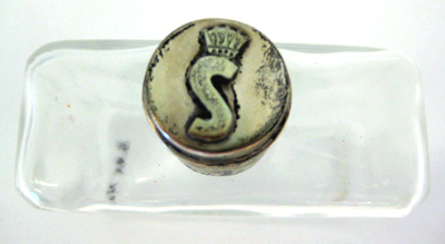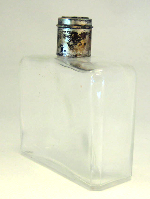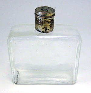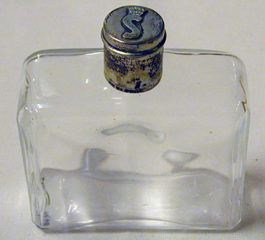 Flaska för Eau de Cologne(?) i genomskinligt glas. Rektangulär form. Med lock av silver,vilket upptill har ett krönt S, samt stämpeln: L 8 = 1937, samt Eng = Karl Ivar Eng,Stockholm, verksam 1935-51.