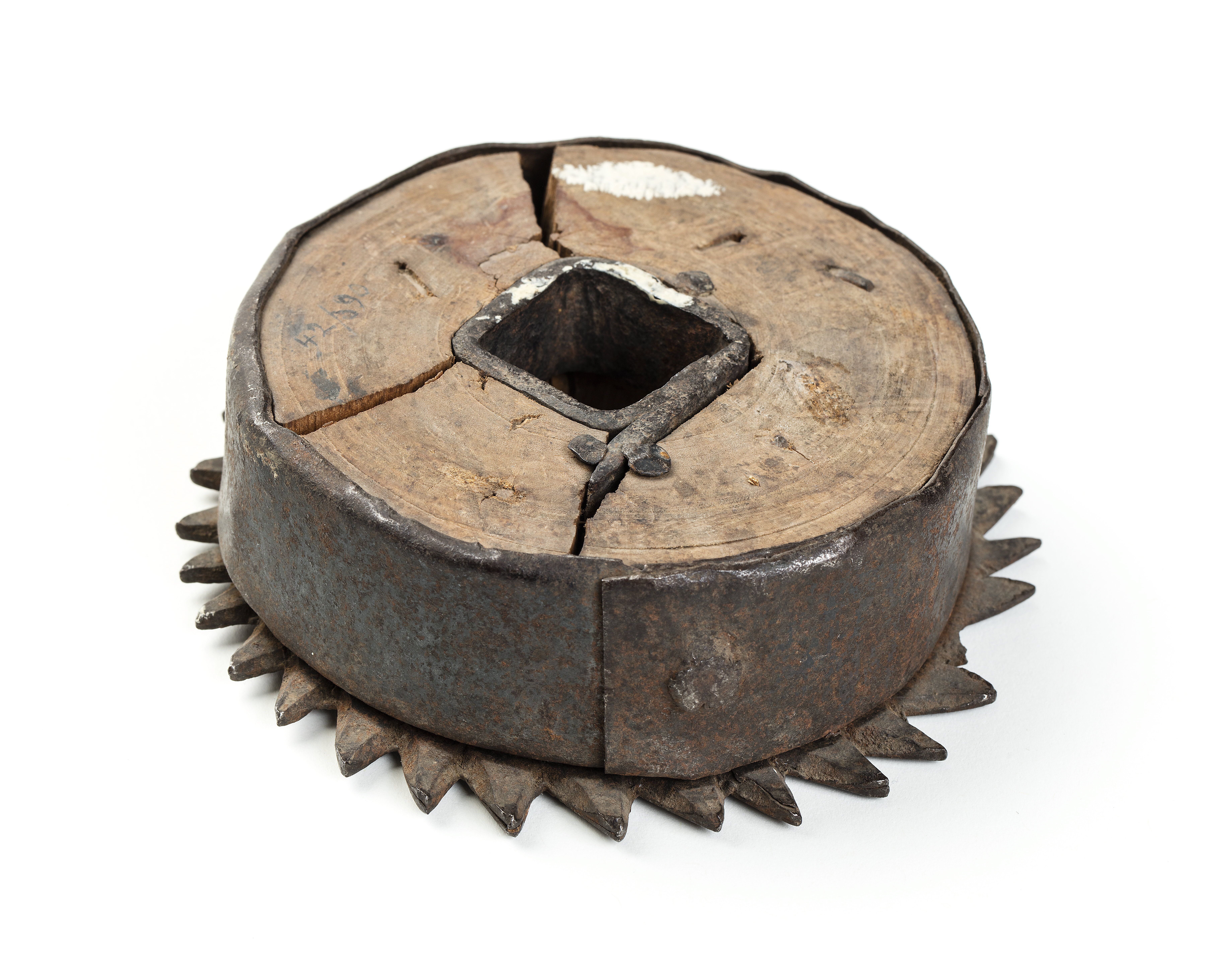 Kugghjul bestående av en platt, rund stålskiva med snedställda, spetsiga kuggar kring omkretsen, fastsatt med fyra försänkta skivor på en rund trätrissa, vars omkrets är skodd med ett stålband. Fyrsidigt centrumhål, delvis skott med ett stålband som är fastsatt med 3 spikar. Största d: 125 mm, b: 36 mm, hål: 24,6x25,8.