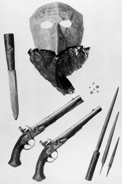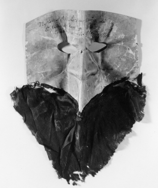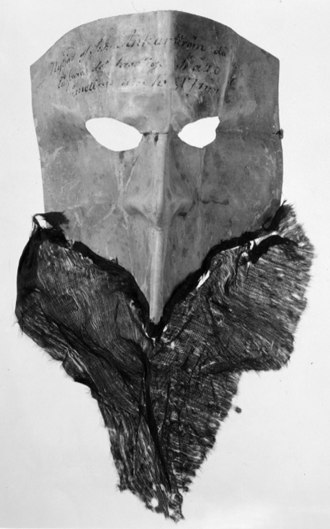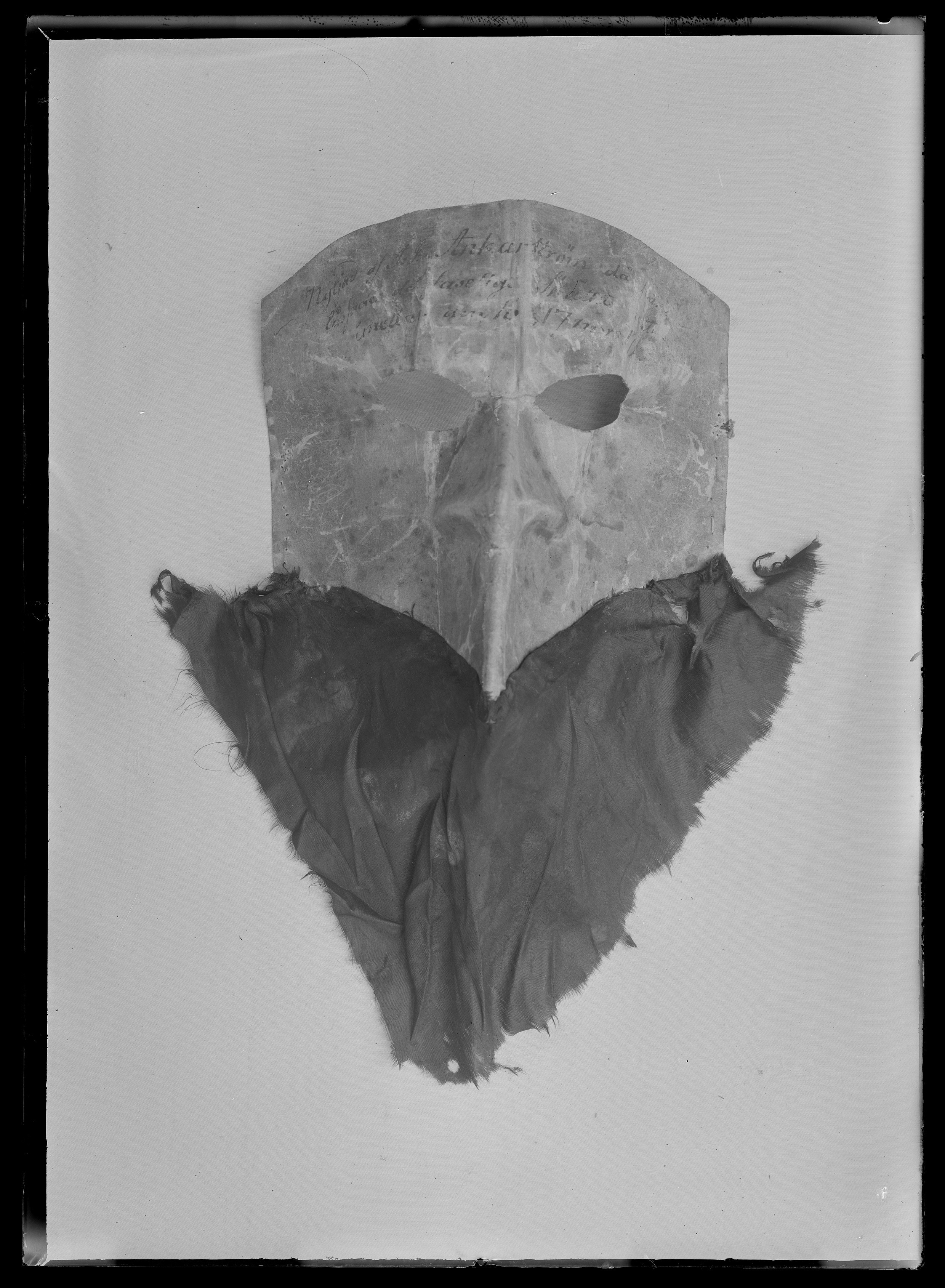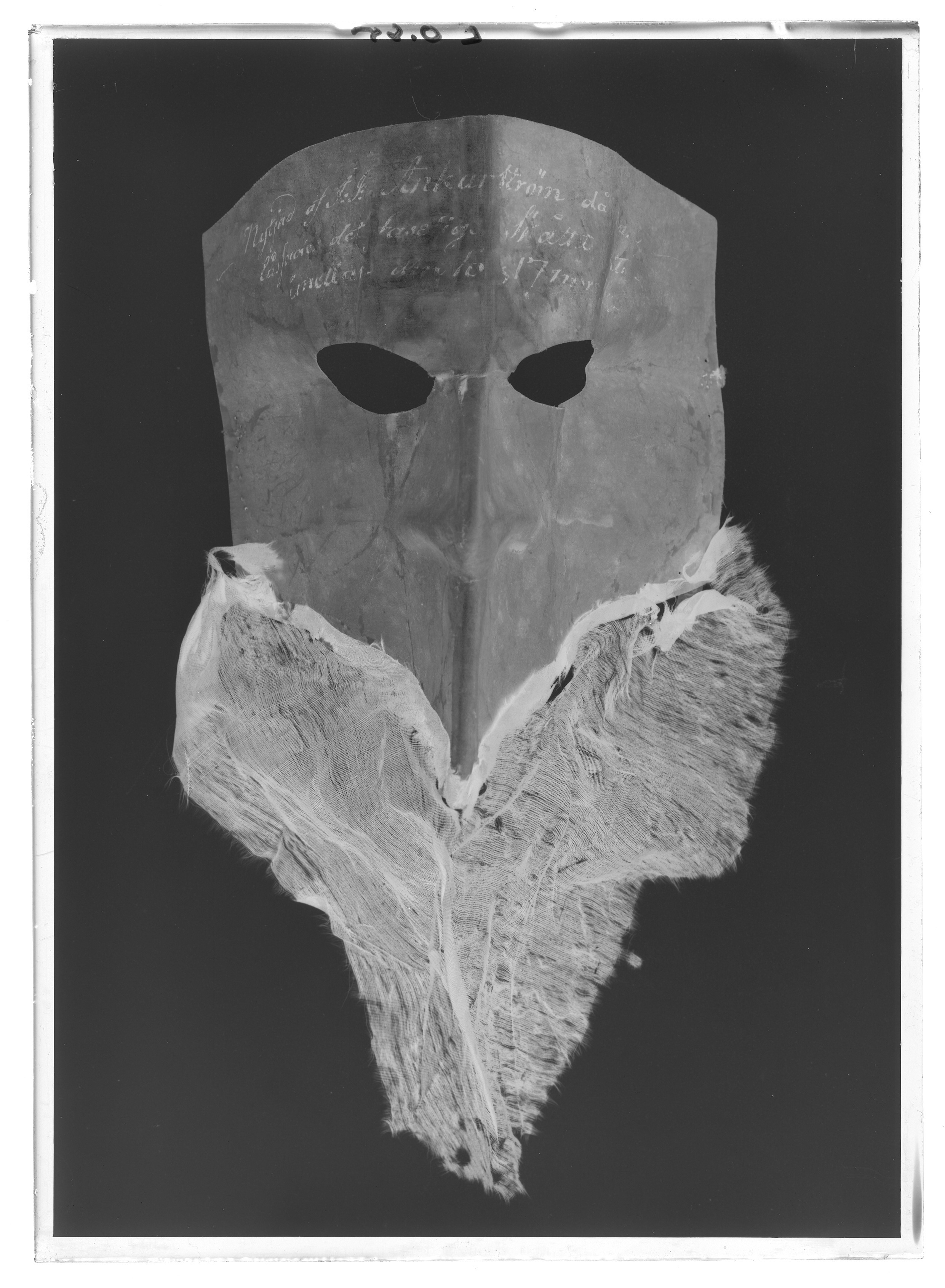 Ansiktsmask av vaxat linne (?) pressad och veckad med markerad näsa och två spetsovala, 40 mm breda ögonöppningar. Där ovanför skrivet med bleknat bläck: "Nytjad af J:J:Ankarström då han låssade det faseliga Skåttet natten emellan den 16 o 17 mars 1792". Masken försedd nedtill med ett trianulärt stycke svart japanskt siden (japon) som är tänkt att likna ett svart skägg. Anckarström köpte masken hos hattmakare Hartin på förmiddagen 16/3 1792 för 32 skilling. (Se Hartins vittnesmål s. 61 i rättegångsprotokollet.) Längd mitt fram: 10 mm. Bredd: ca 380 mm. Anmärkning: Masken har ett flertal veck. På framsidan har vaxet släppt på en del ställen, men framförallt på baksidan i maskens veck. Utmed maskens kortsidor en serie knapphålsstora hål. Det svarta sidenet är mycket slitet ( numera mörkbrunt), och nedfäst på stödtyg av krepelin.