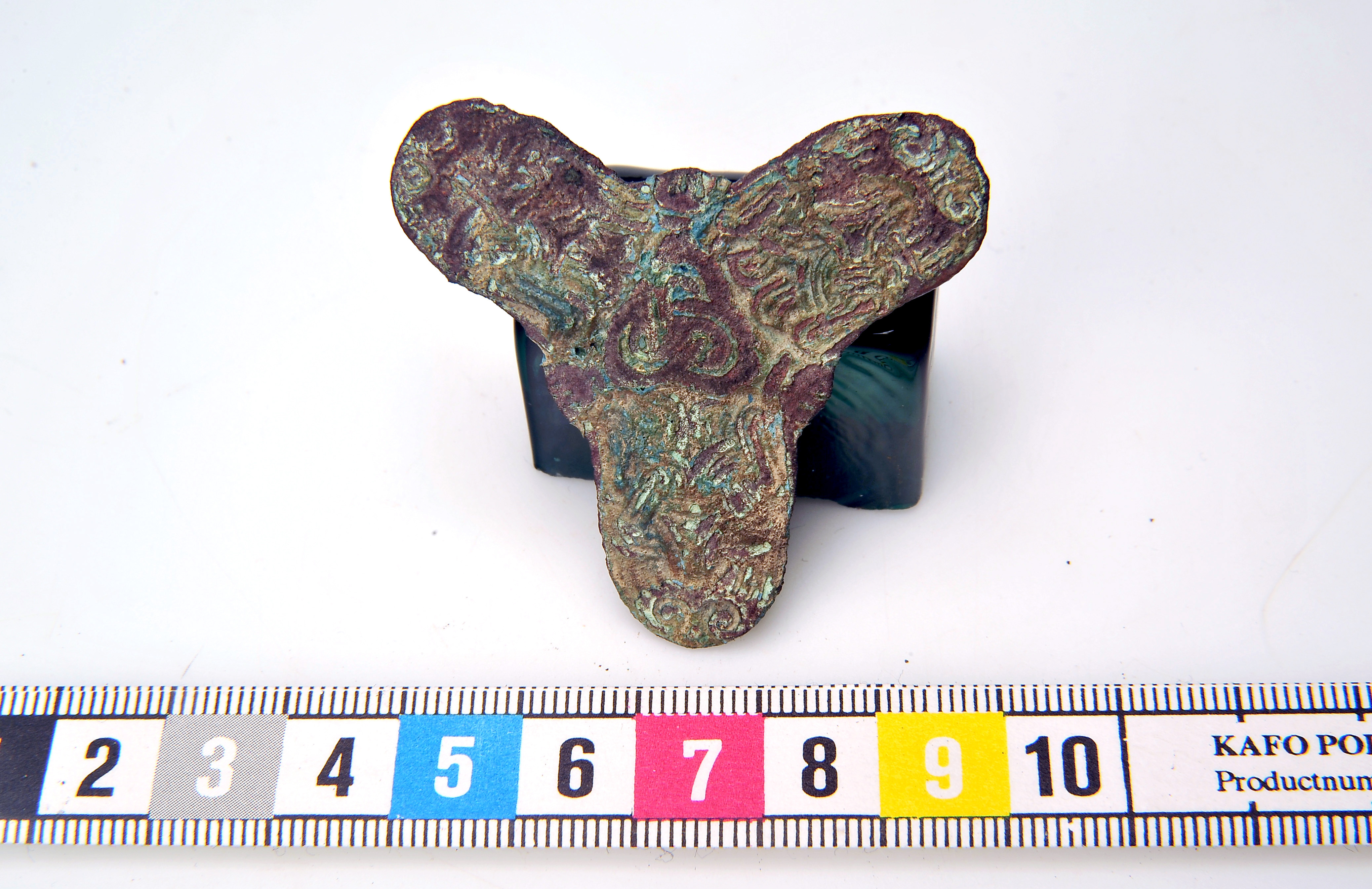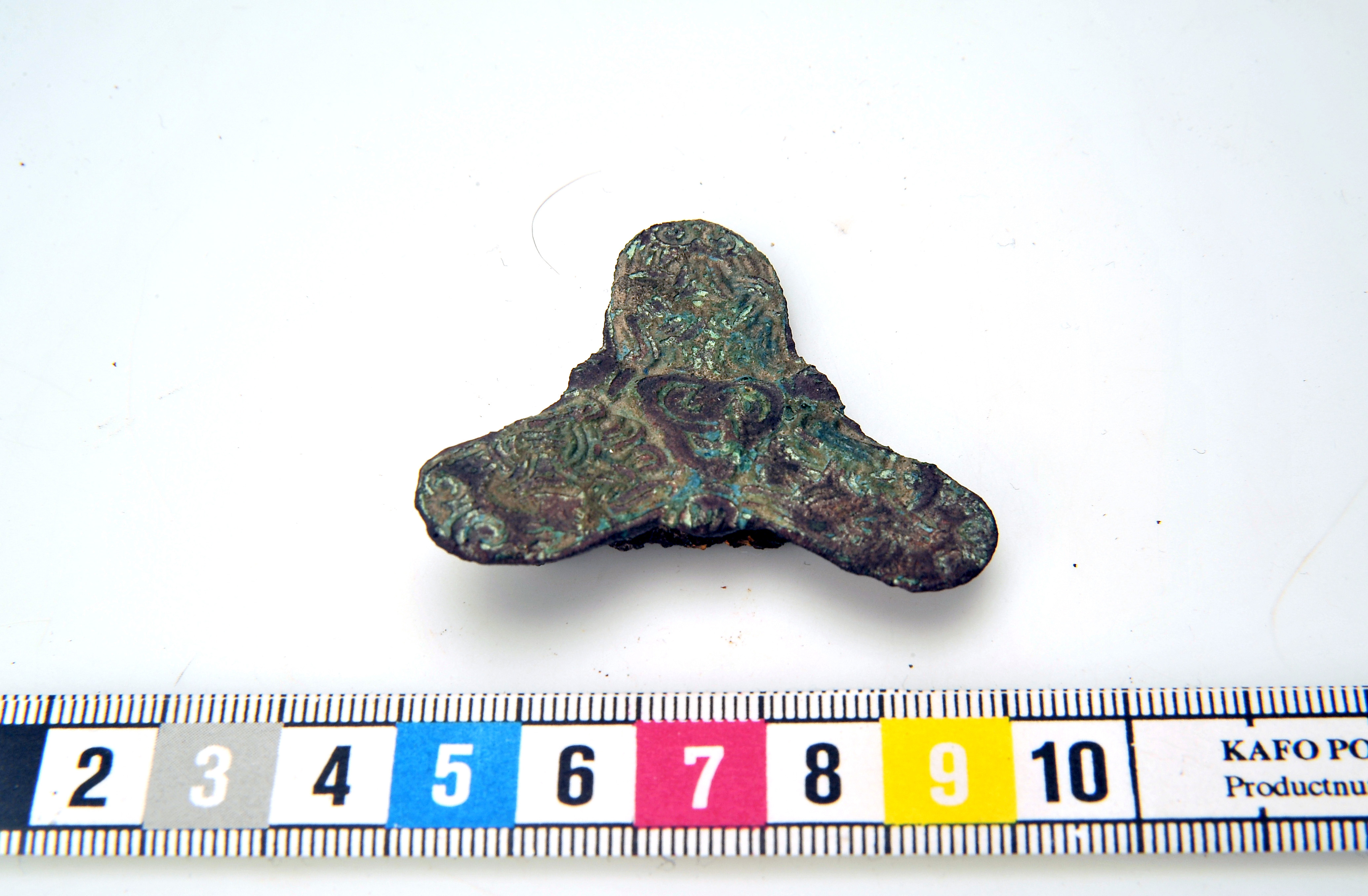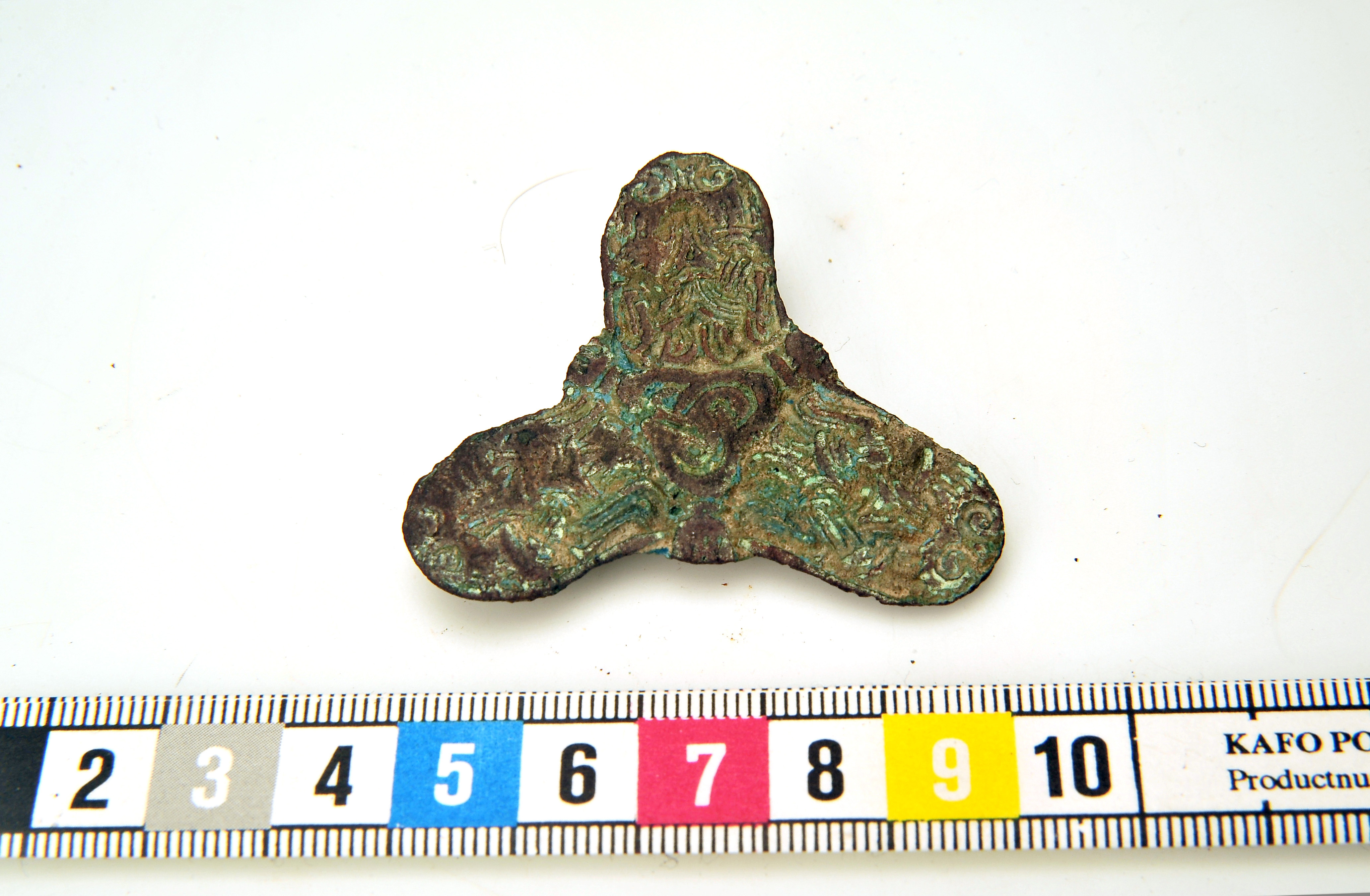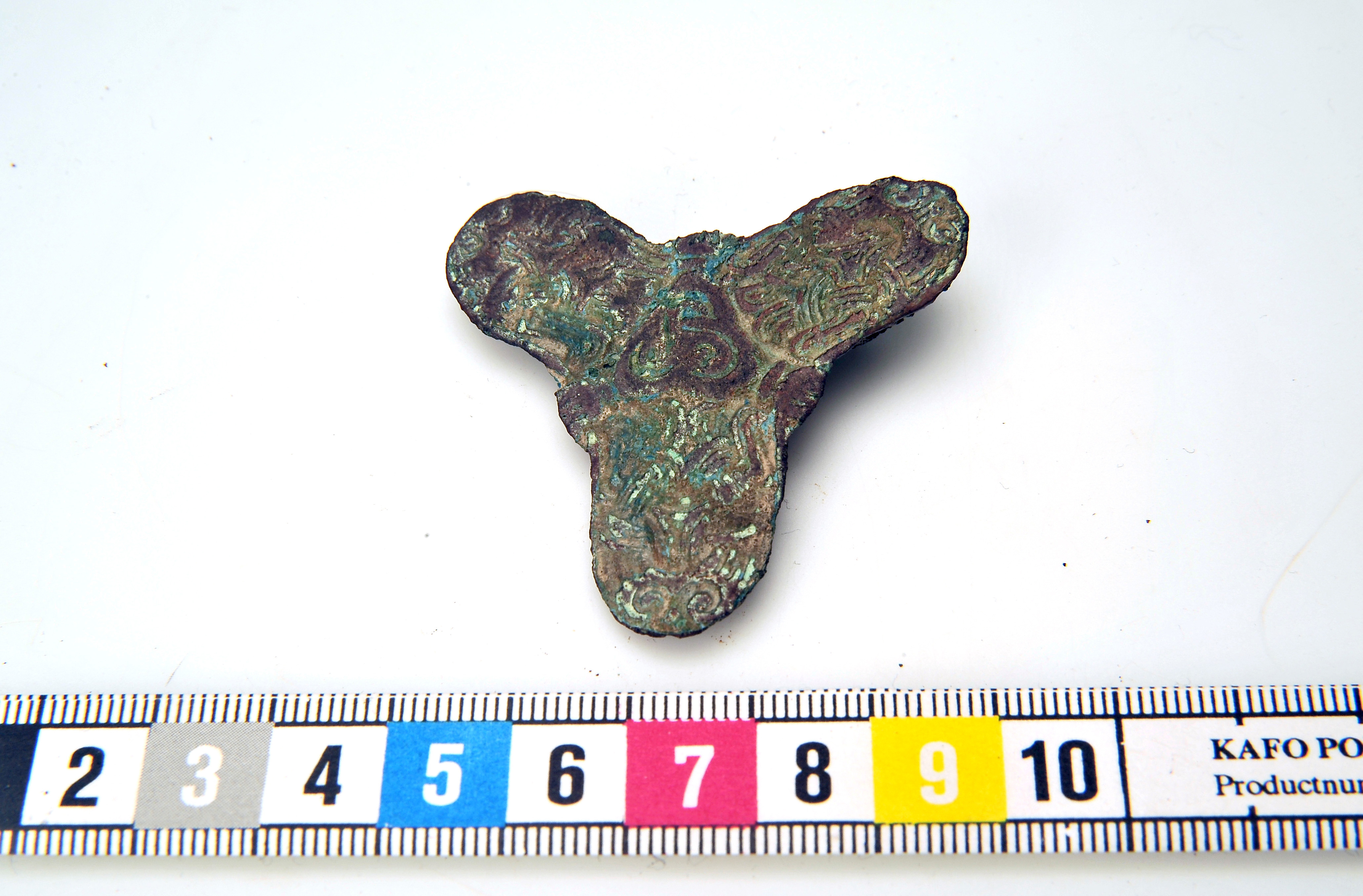 Treflikigt bronsspänne med bevarad järnål på vilken små textilrester kvarsitter.