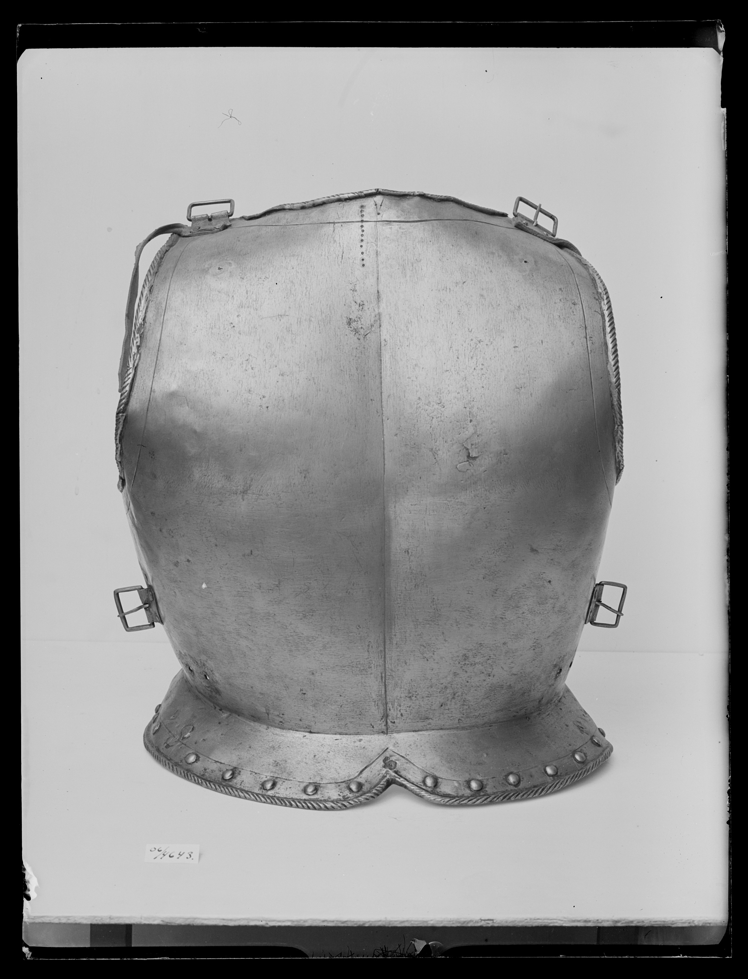 Drivet stål i ett stycke, utsidan slipad och blank, insidan mörkbrun och kladdig av rostskydd. Förhöjningar över skulderbladen och försänkning mellan dem. Rundade urtag för nacke och armar, nacken bred. Kanterna omvikta och med djup repstav. Nertill skört, B ca 60 mm i kanten, V-formig urtagning i mitten. Kant som föreg. Över nacken ett punsat V med tre gropar och till vänster om detta 12 gropar vertikalt i rad. Skuren kantlinje runt nacke, armurtag, längsmed skörten och mellan nacke - skört. Över axlarna sämskade skinnremmar med spännen av stål, höger 160 vänster 185 mm långa. I sidorna nitade spännen av stål. Längs skörtets ytterkant kullriga nitar i rad.