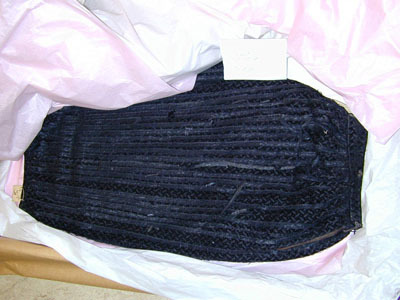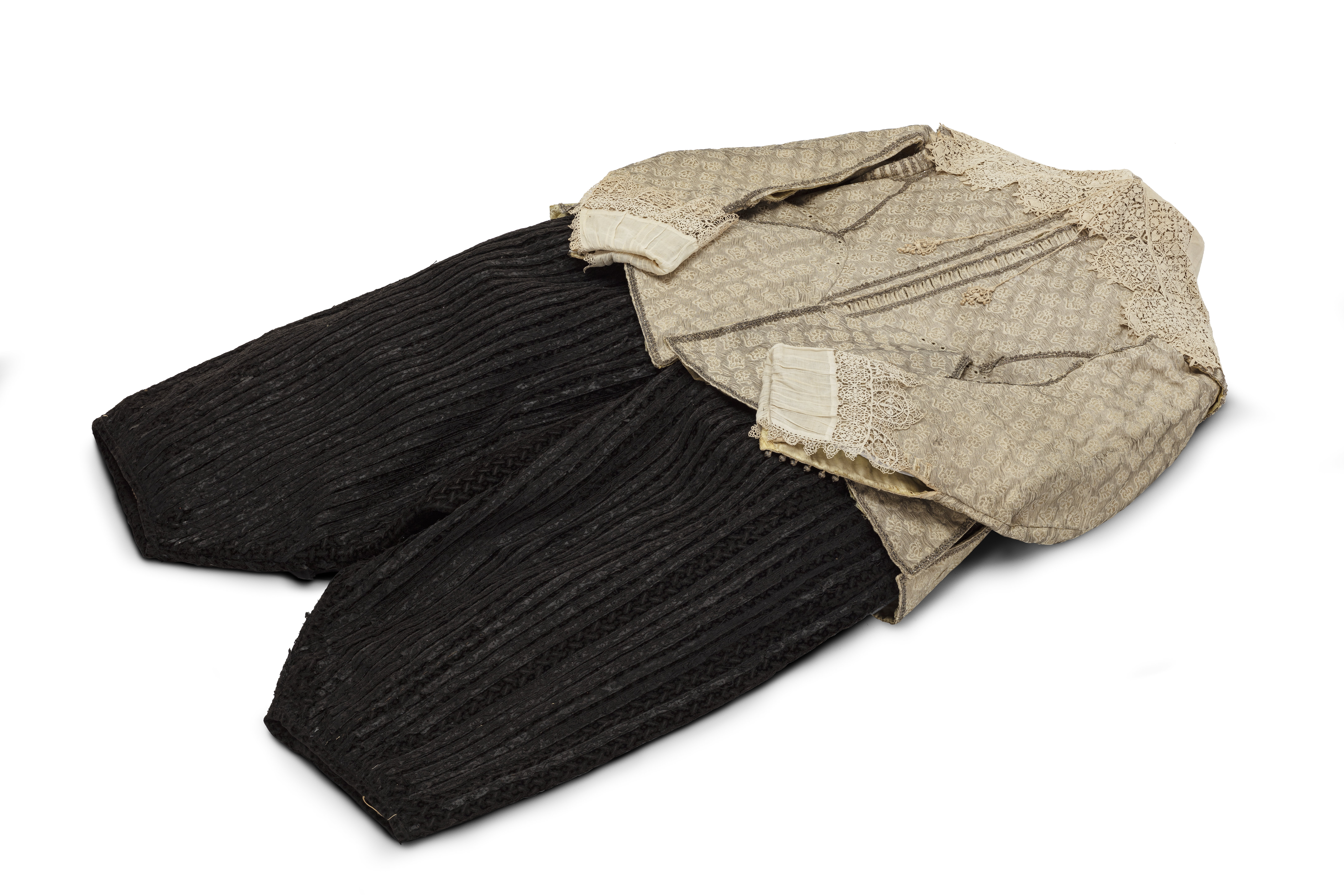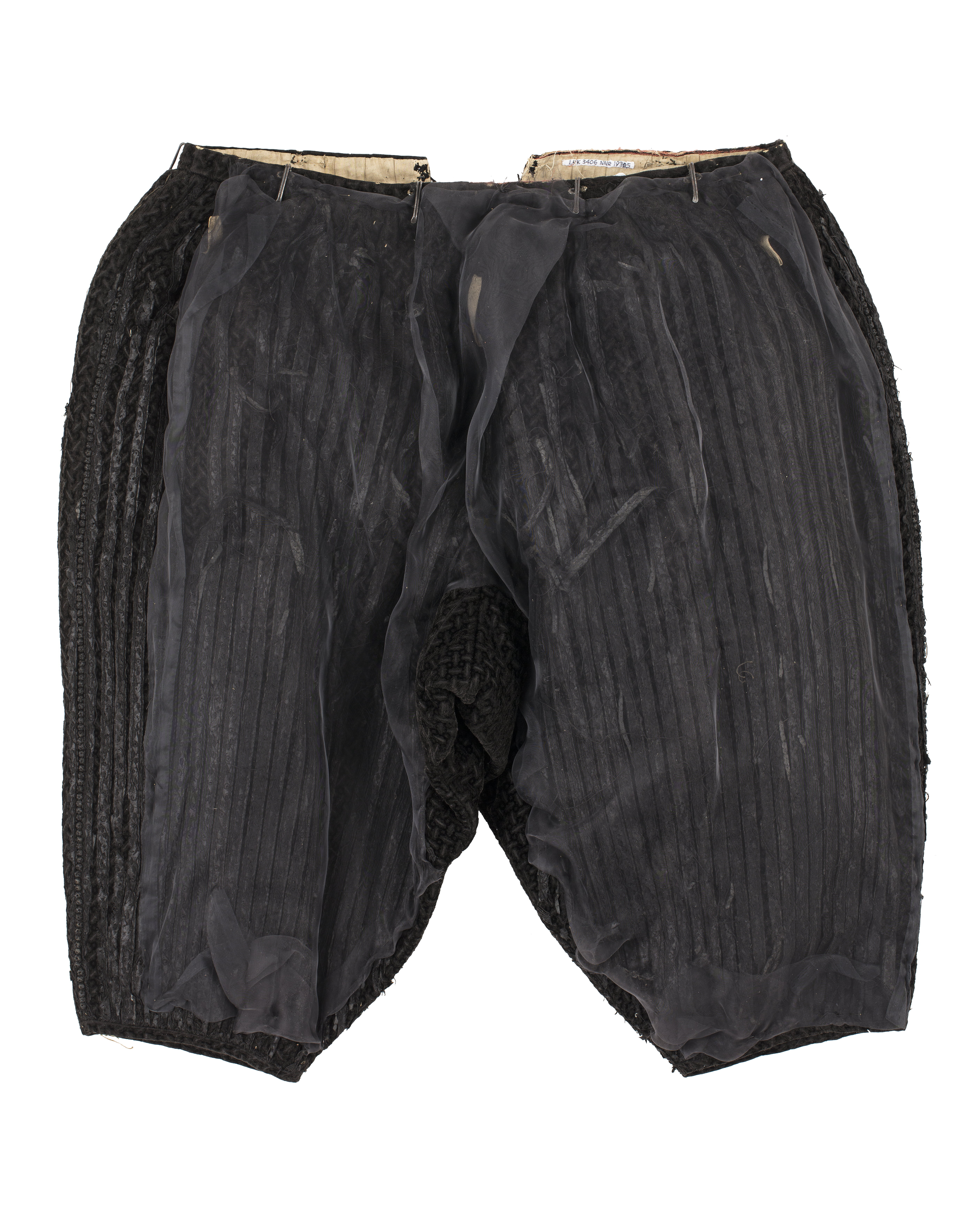 Byxor av svart sammet till Gustav II Adolfs svepdräkt. Samhör med sveptröja nnr 31142, krage och ärmmanschetter nnr 31139-31141.