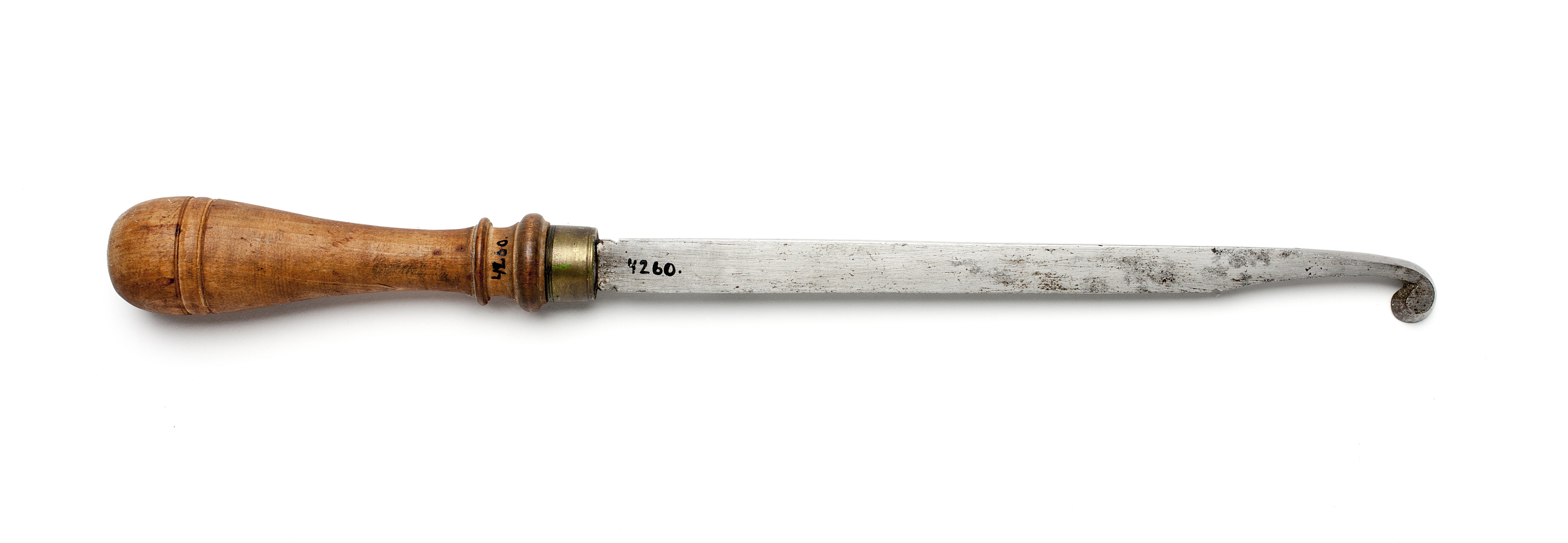 Klinga med rektangulär genomskärning och profilerad hals. Änden avsmalnande och svängd. Trekvartscirkelformad egg. Svarvat skaft av päronträ med två vulster nedtill ("rydboholmstyp"). Mässingsring. Stämplat på klingan: hjärta under kors.