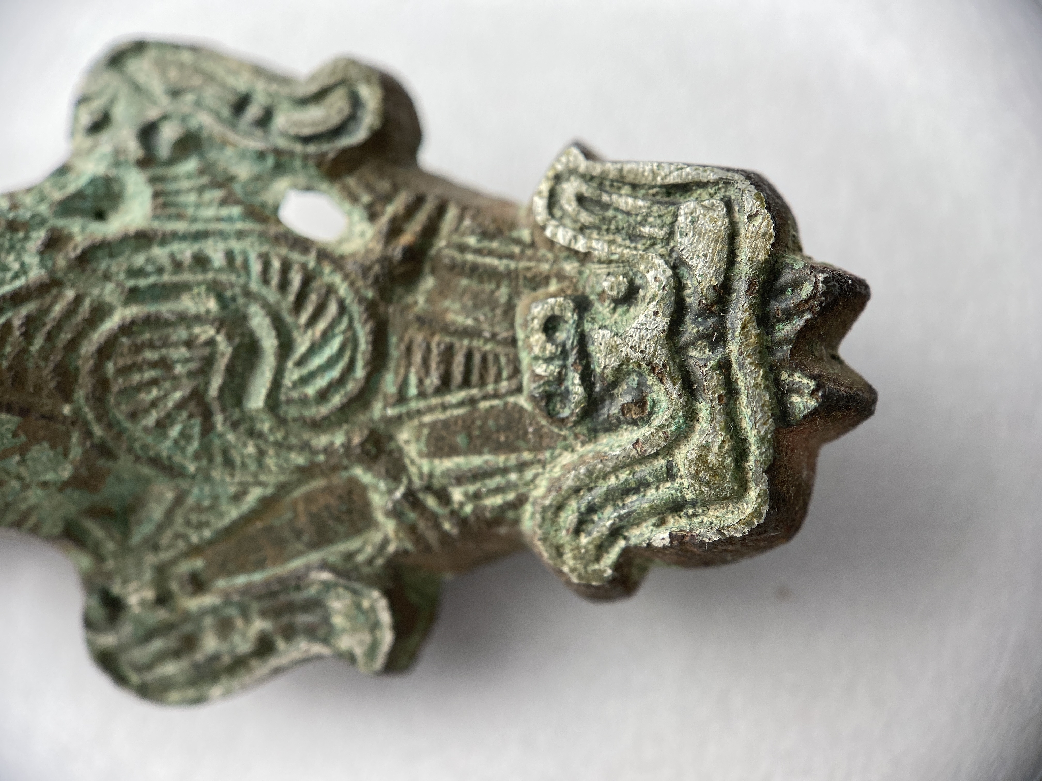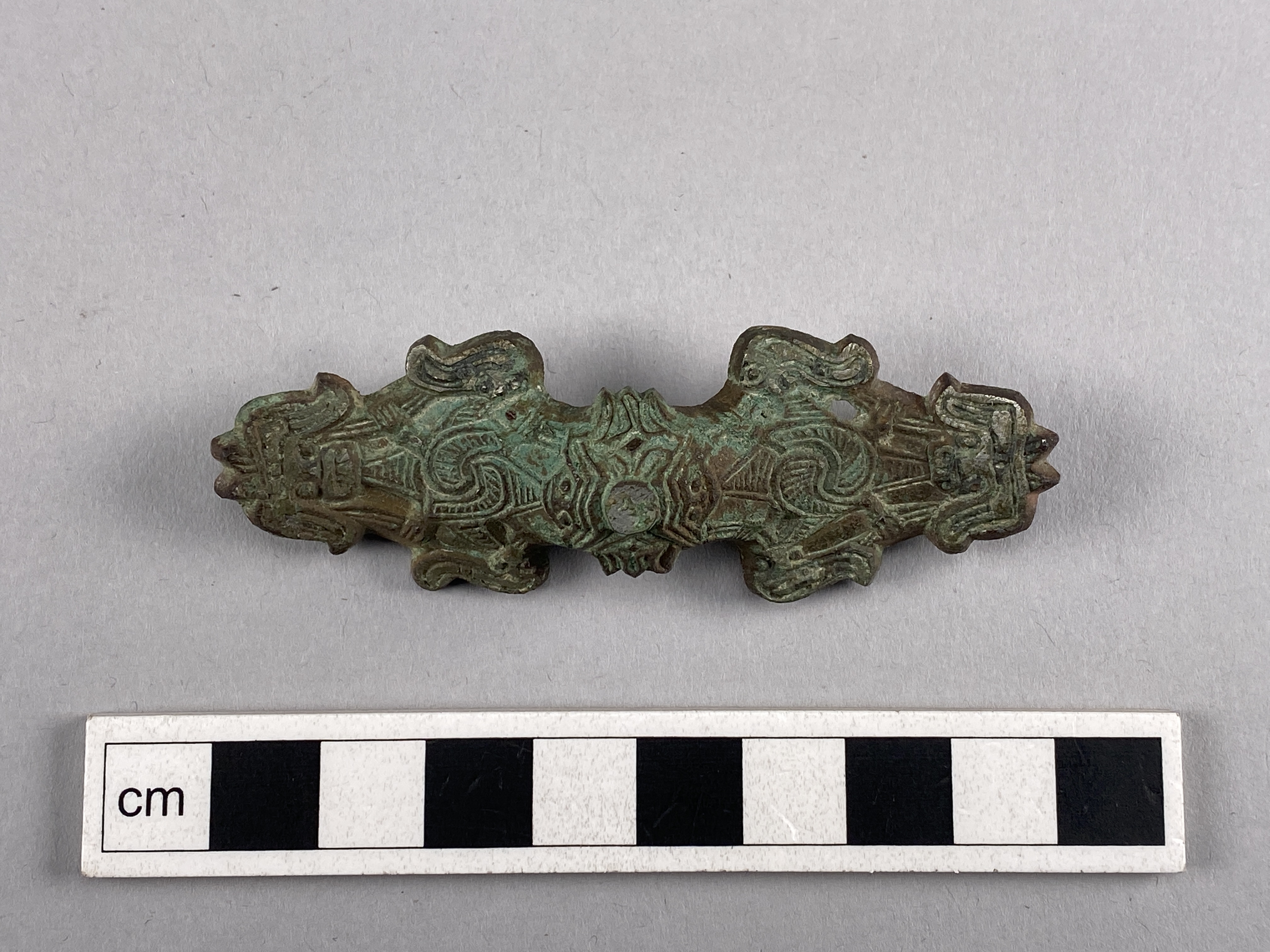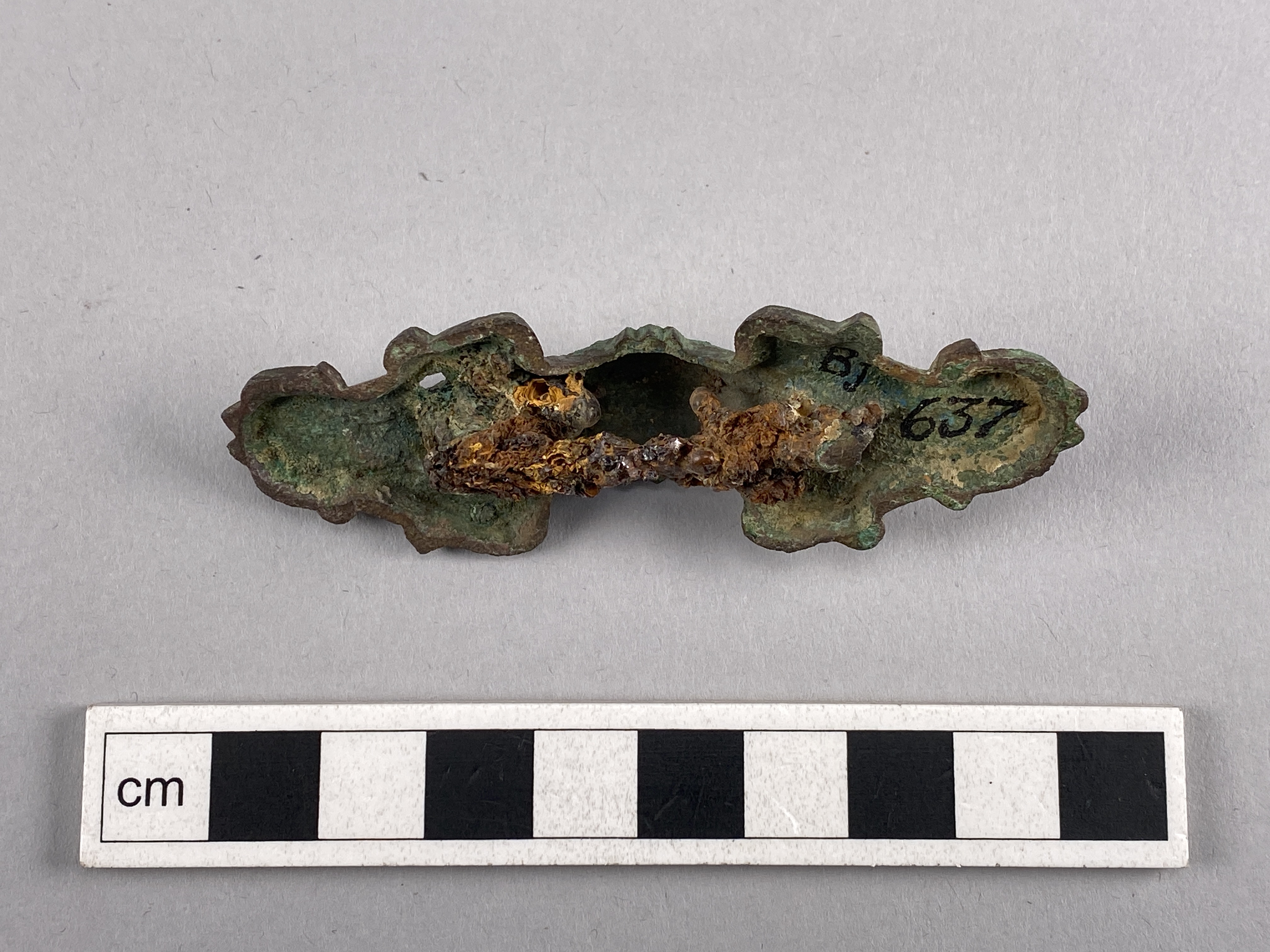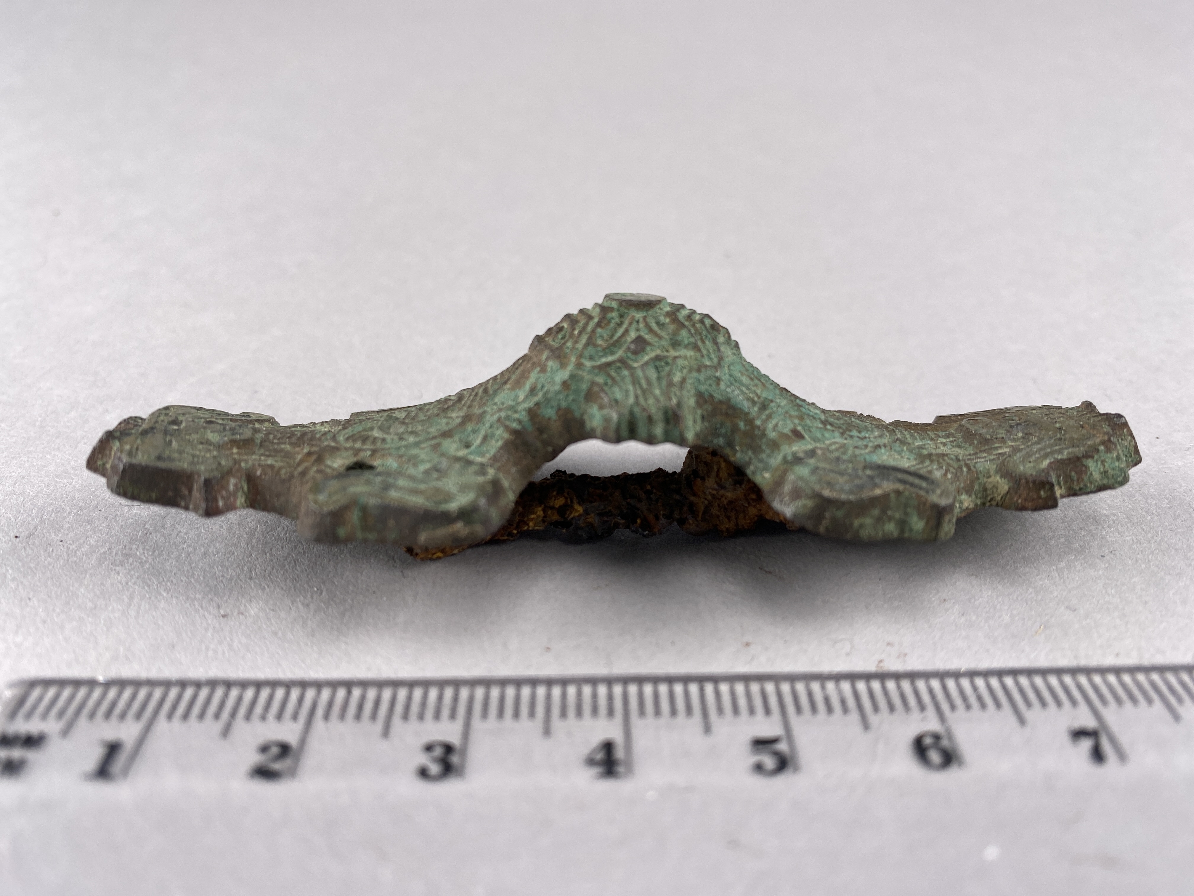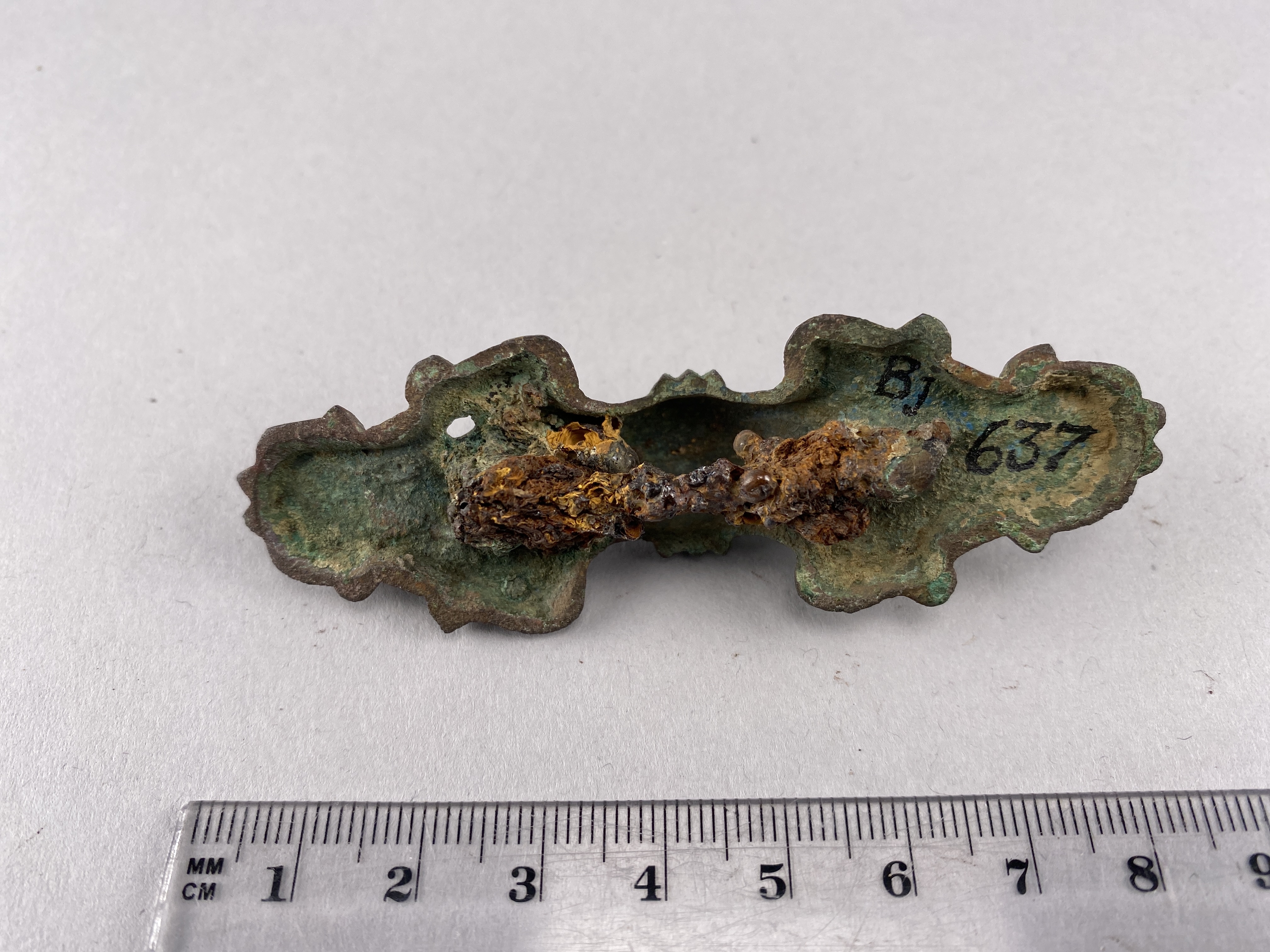 Likarmat spänne med järnnål och vitmetallbeläggning. På nålen finns fossilerade textilrester.