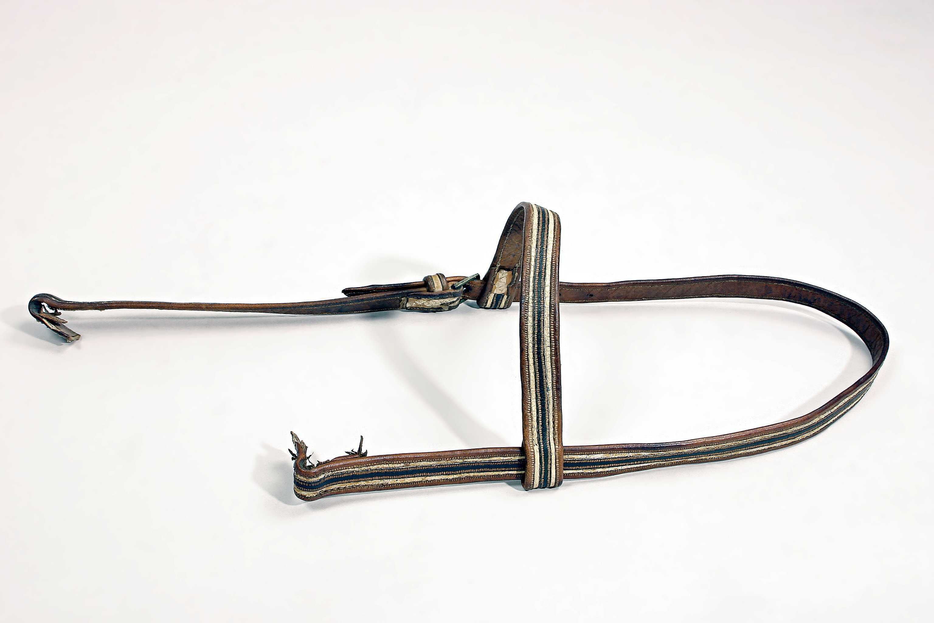 Bridongträns med munbettet bortslitet, av 22 mm bred läderrem med dekorsömmar och längsgående svarta och vita målade ränder. Sidostycken övergående i nackrem med påträtt nackband. På ena sidostycket en rektangulär, förgylld mässingssölja.