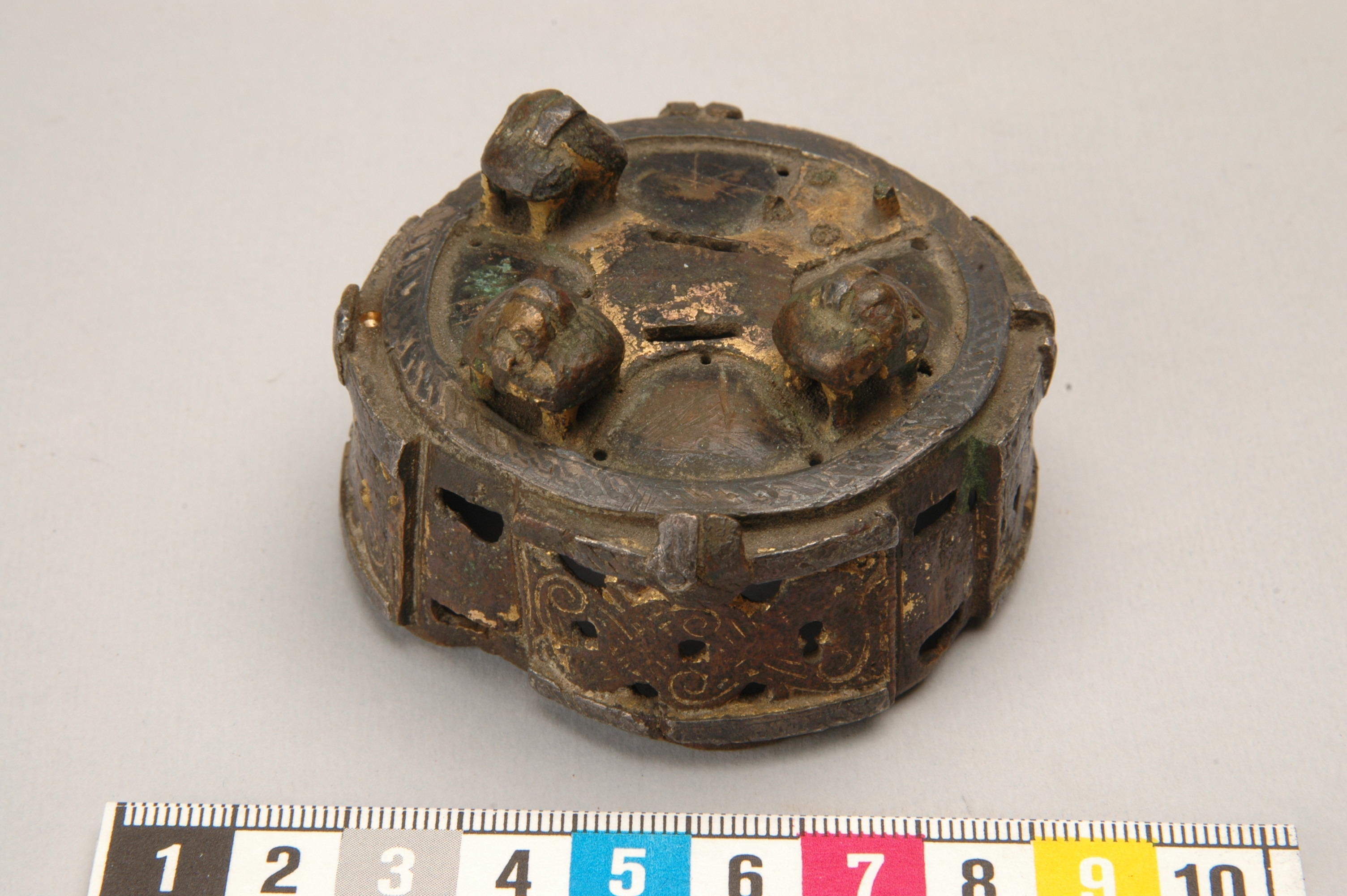 Diameter 6,5 cm, höjd 3,9 cm. Genombrutet mönster. Sidostolpar saknas, liksom delar av dekor på ovansidan. På ovansidan finns tre runda figurer på fyra ben (en fattas).