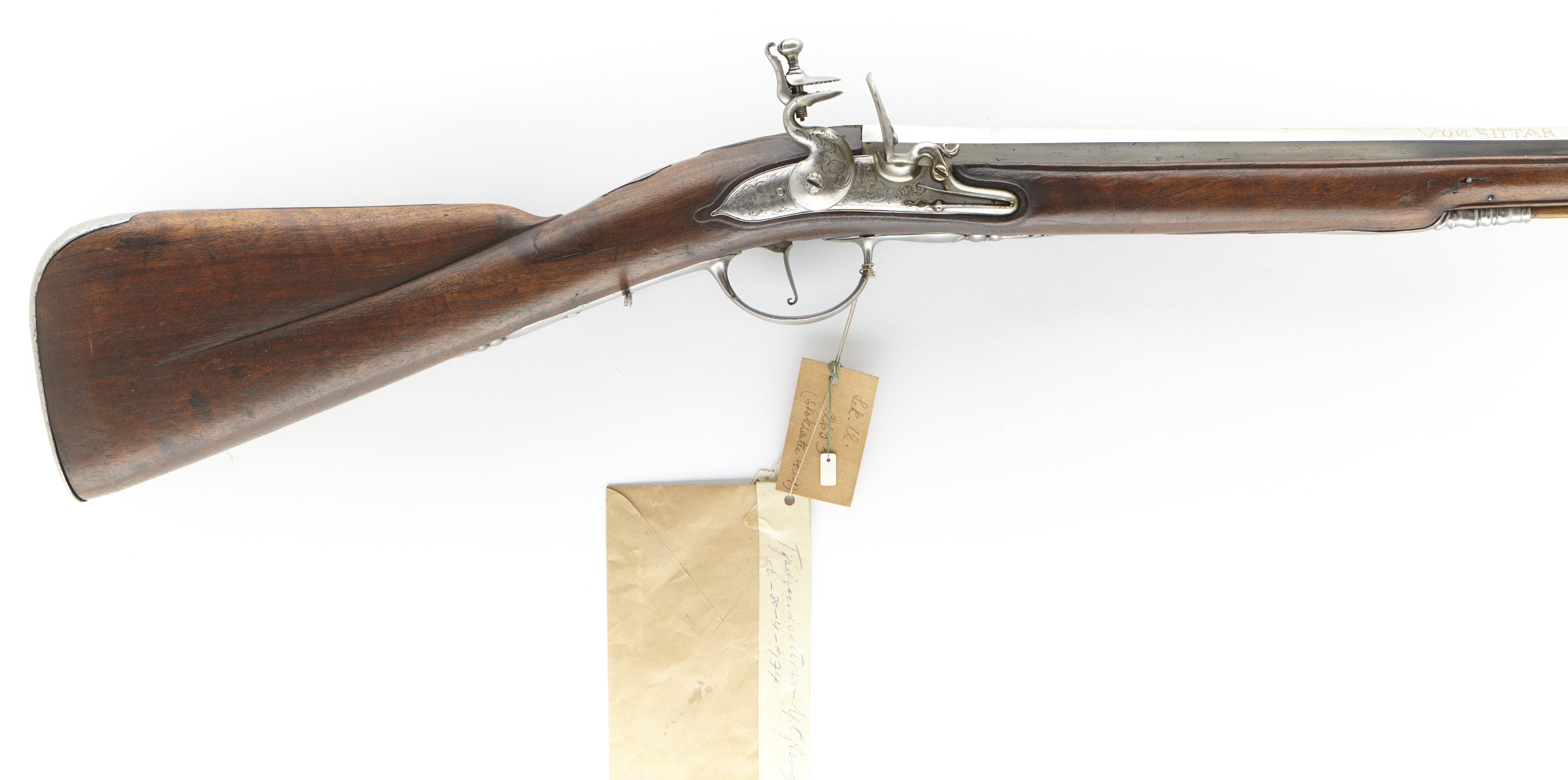 Åttkantig, slätborrad pipa av stål, rikligt inlagd med mässing på kammaren: “IOHAN SCVTZ - 627 - VON SITTAR”. I övrigt snedställt rutmönster, med jämna mellanrum avbrutet av mot varandra ställda bågar. Utan sikte. Korn av silver. Tre piphäften. Flintlås, kullrigt låsbleck av stål. Undre kanten svagt konkav. På låsblecket signerat “GVILIEAVME - HENOVL A NAMUR” (Stöckel p. 130). S-formad rundad hane, graverad med grotesker. Låsblecket i övrigt graverat, likaså med groteskfigurer och akantusslingor. Batteri, eldstålets gåsbuk med droppformig klump, eldstålet graverat, klacken likt upprullat blad. Låsets insida med stämpel “I.P.” Fullt utvecklad studel över nöten. Stångfjäderns skruv med nötta gängor. Hel stock av valnöt. Fransk kolv. Bakplåt av stål, vilken fortsätter i smal tunga längs kolvryggen. Lång fals. Tumplåt av stål - balusterformad med flikiga ändar. Två låsskruvar. Sidbläck av stål, serpentinformad bladranka. Pipen fäst i noten med ursprungligen tre pipstift av stål, varav ett återstår. Näsband av stål. 2+1 rörka. Fransk varbygel. På framstockens undersida rembygel av stål, fasthållen medelst två skruvar. Tillbehör: Laddstock av rödbrunt trä, profilerad doppsko av stål, fasthållen med skenor. Bakände med stålrör. Märkt: Graverat No 11 på bakplåten.